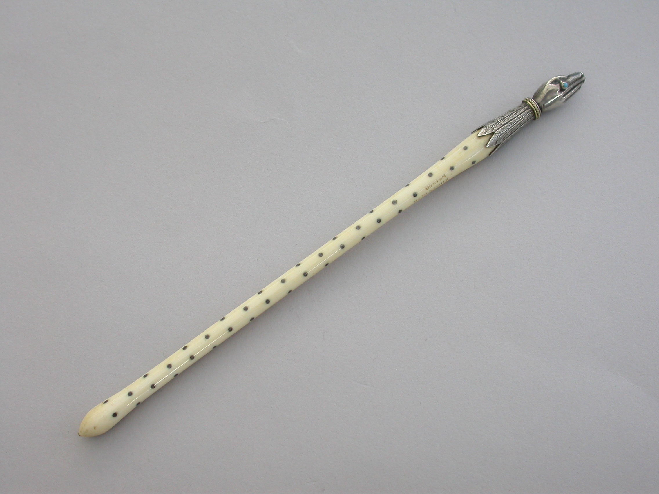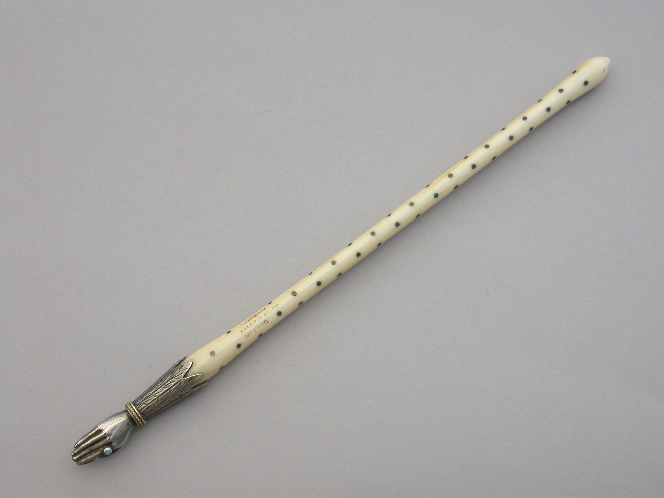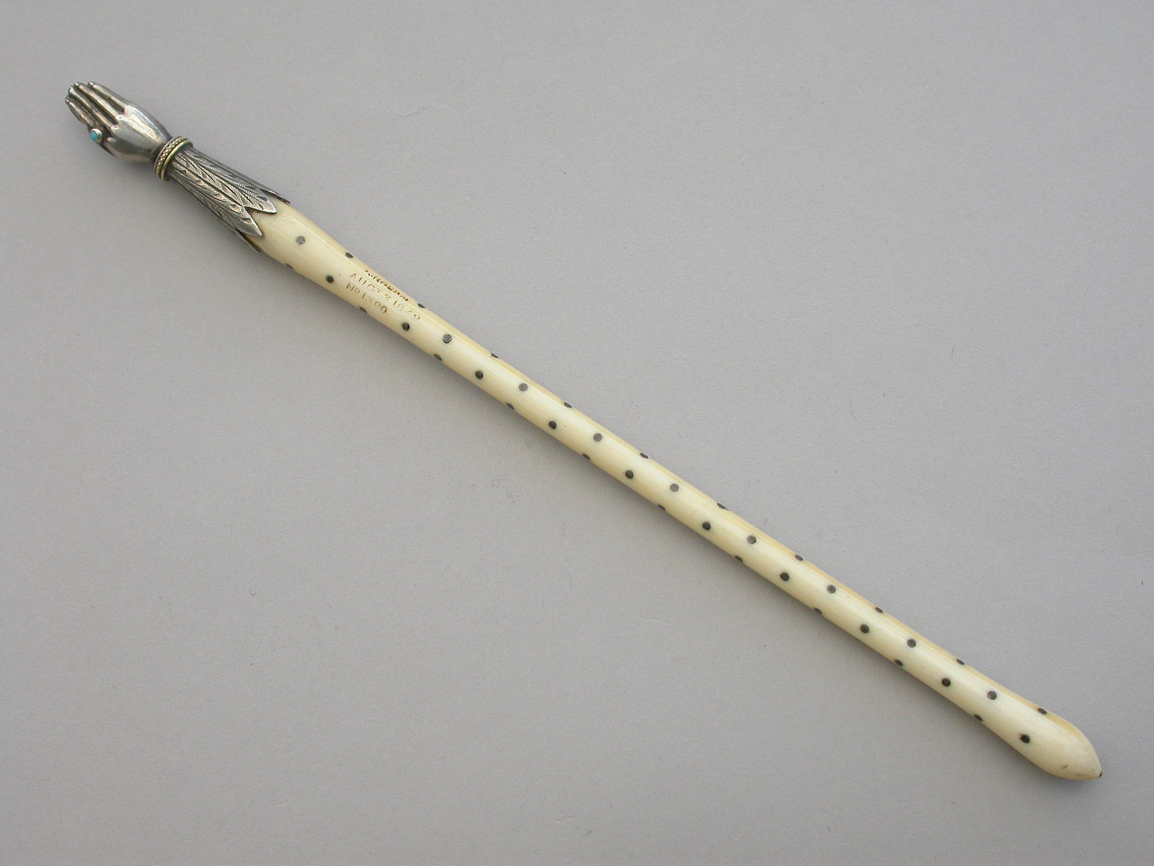 An extremely rare Victorian novelty silver Dip Pen or Quill Holder modelled in the form of a hand with turquoise set ring to the index finger and engraved cuff supporting the shaped ivory shaft decorated with silver pique work. The finger tips cut to accept a quill nib.