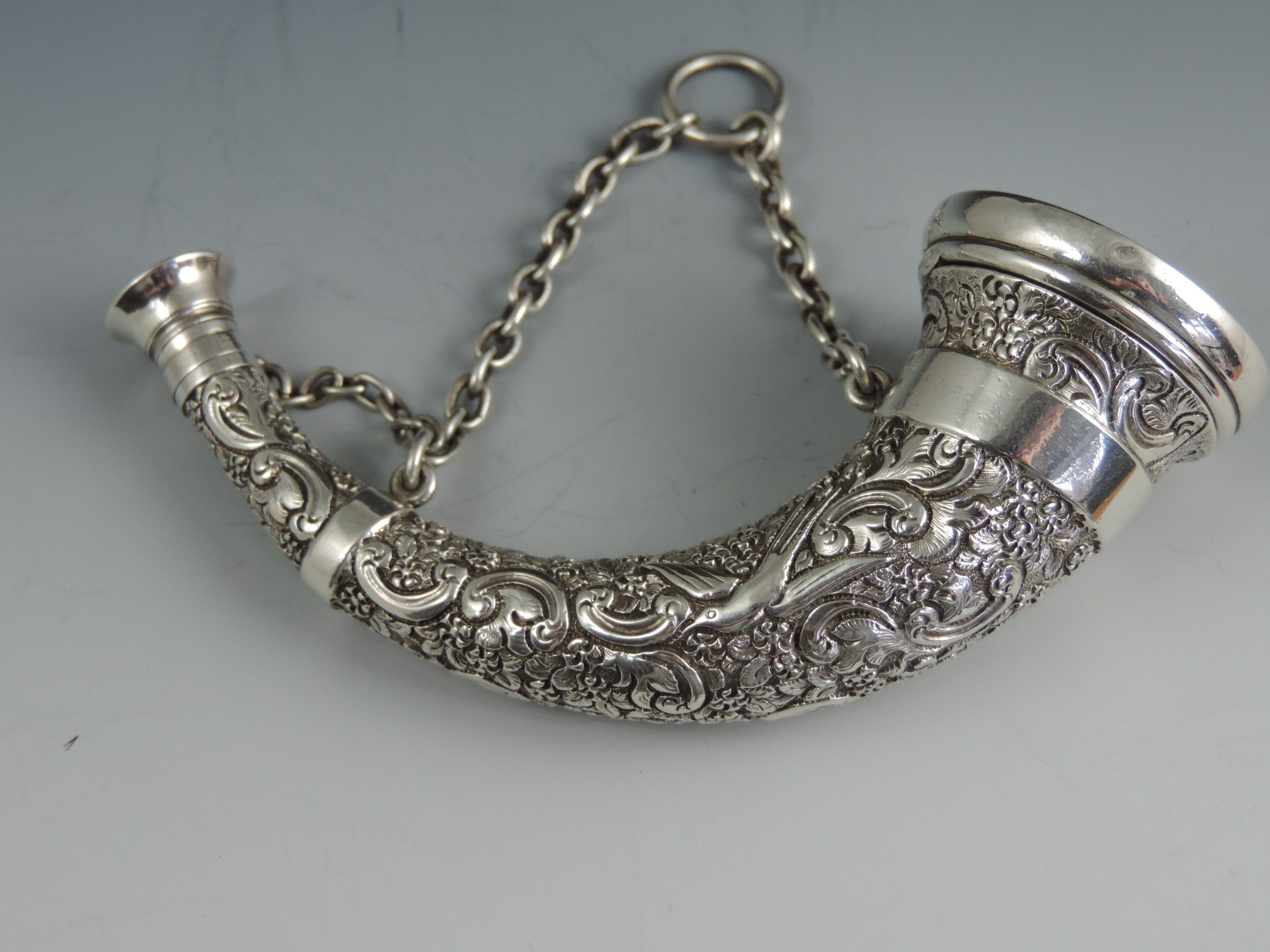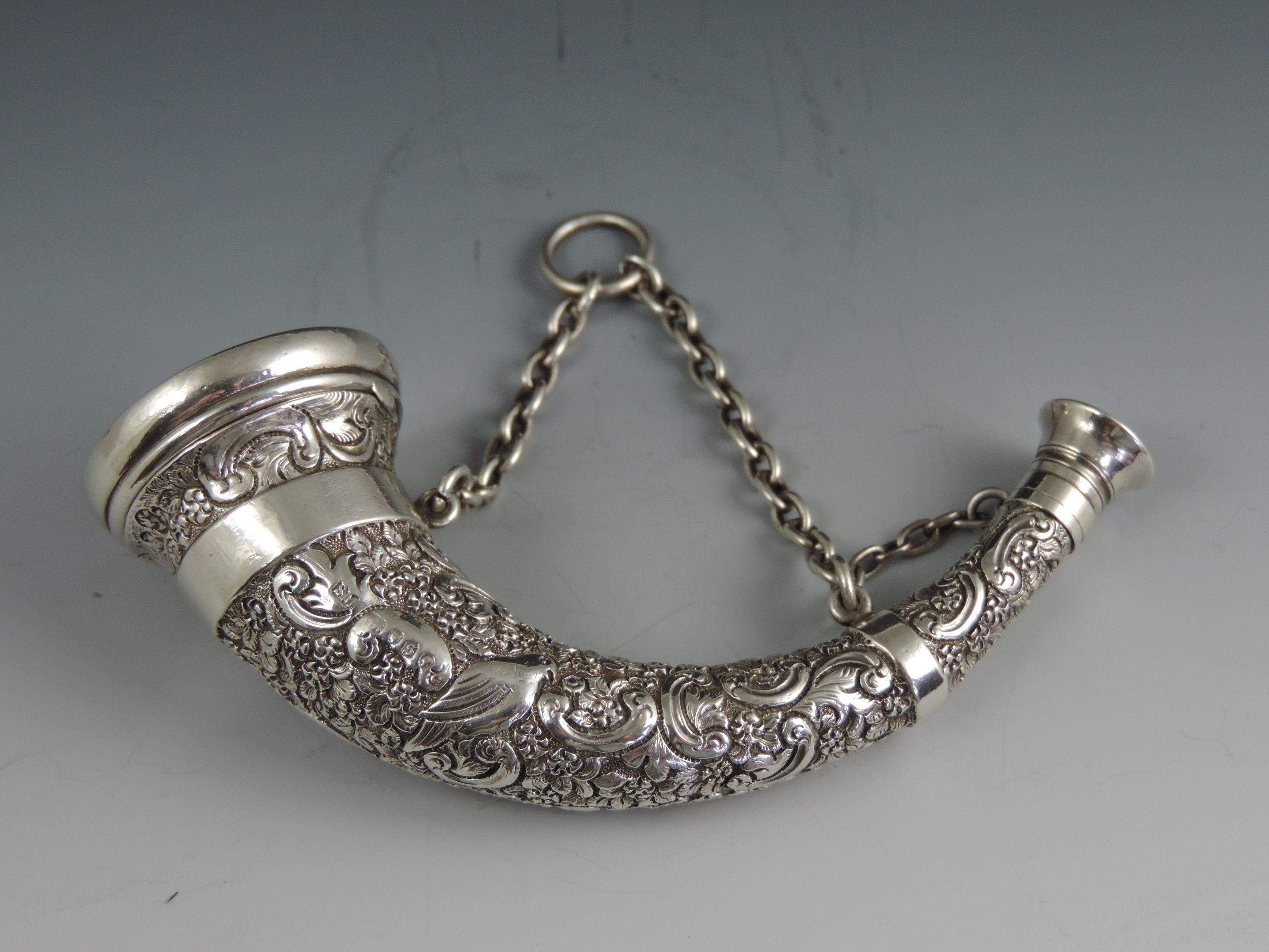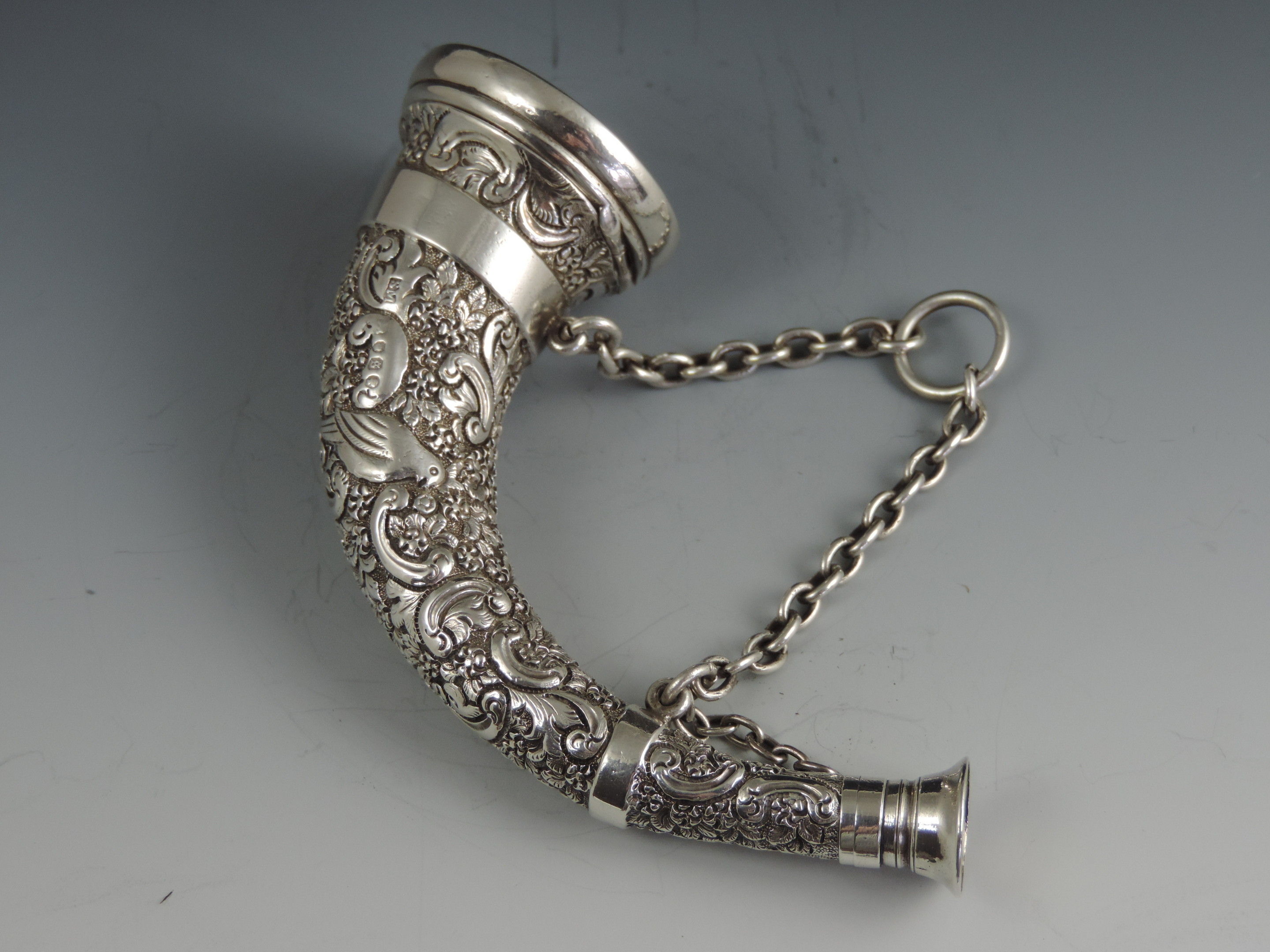 A fine novelty silver combination Scent Bottle and Vinaigrette in the form of a horn, with attached suspensory chain, the main cover opening to reveal a silver gilt interior and the Vinaigrette, the screw cap at the other end to seal the Scent Bottle, the body profusely decorated with birds amongst foliate scroll work. The cover engraved with a monogram.