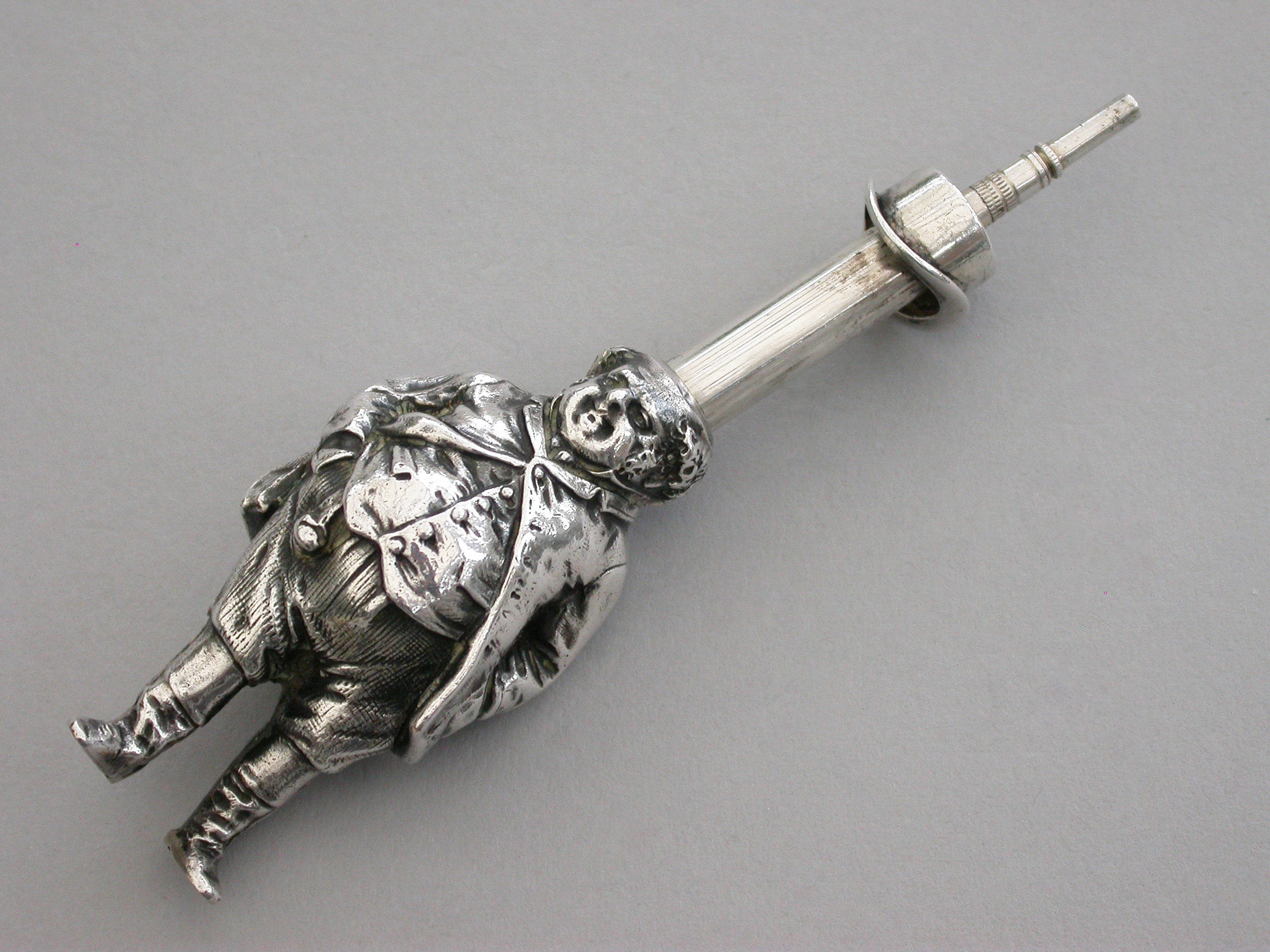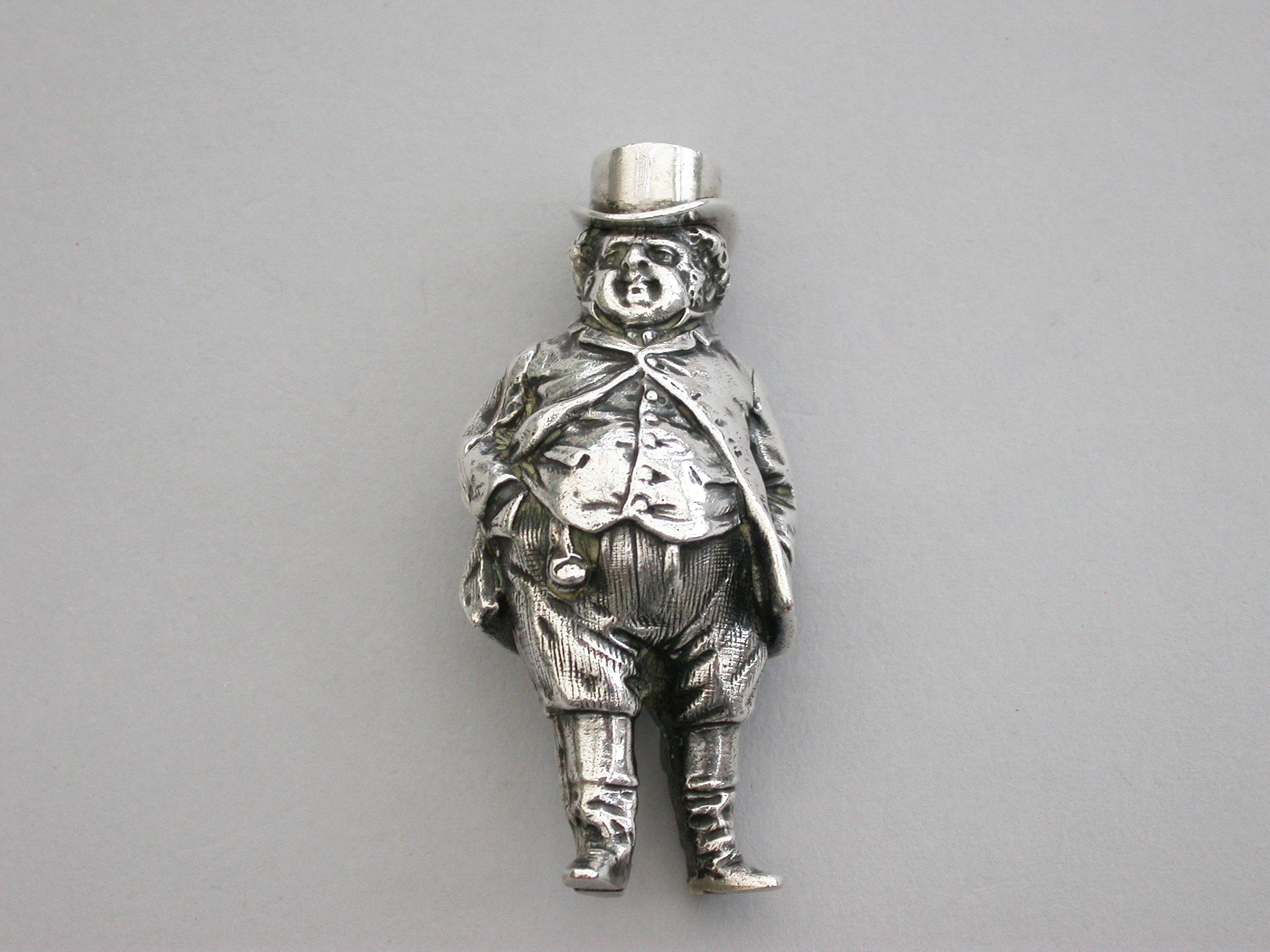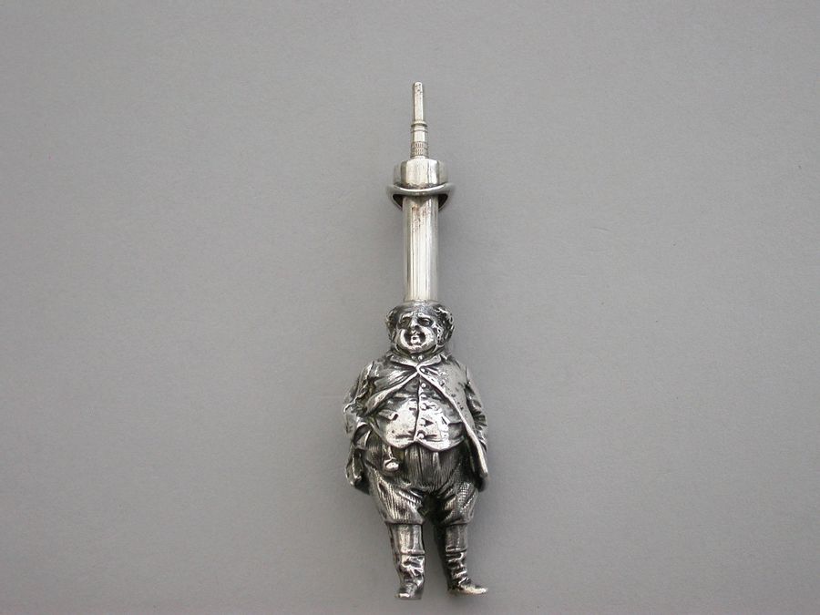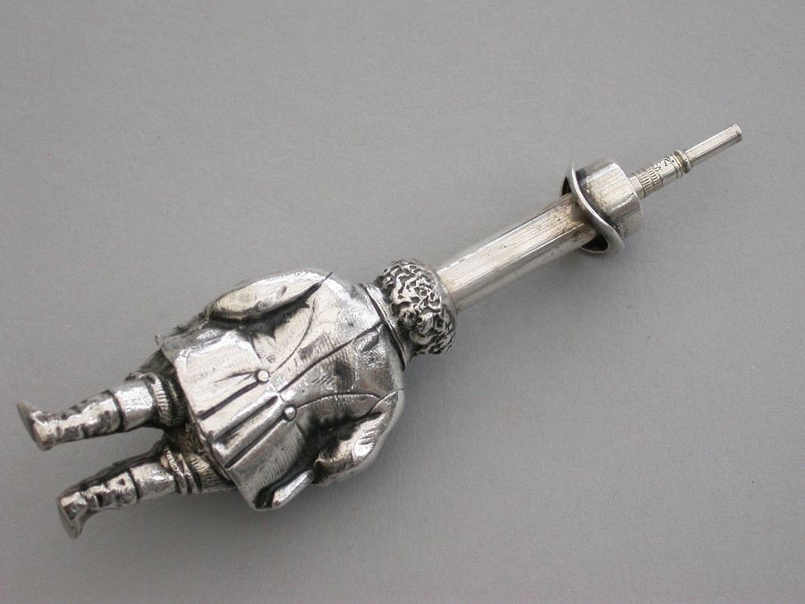 An extremely rare Victorian figural novelty silver telescopic Propelling Pencil made in the form of the comical literary character John Bull (the personification of an Englishman), depicting the stout man wearing a tailcoat, breeches and boots. Pulling on his top hat extends the pencil.