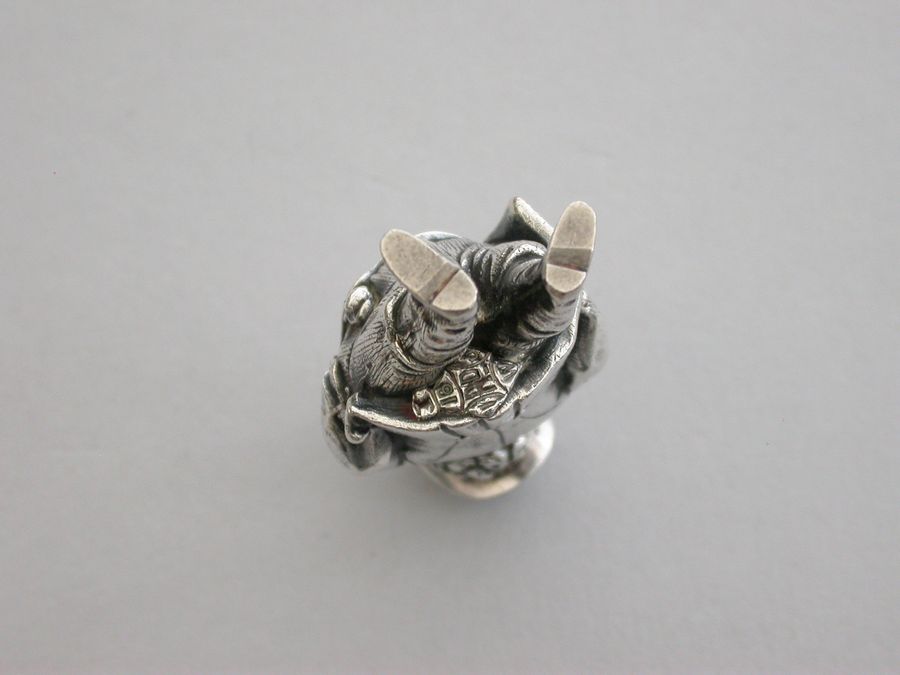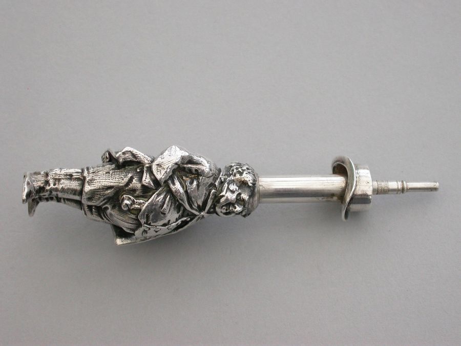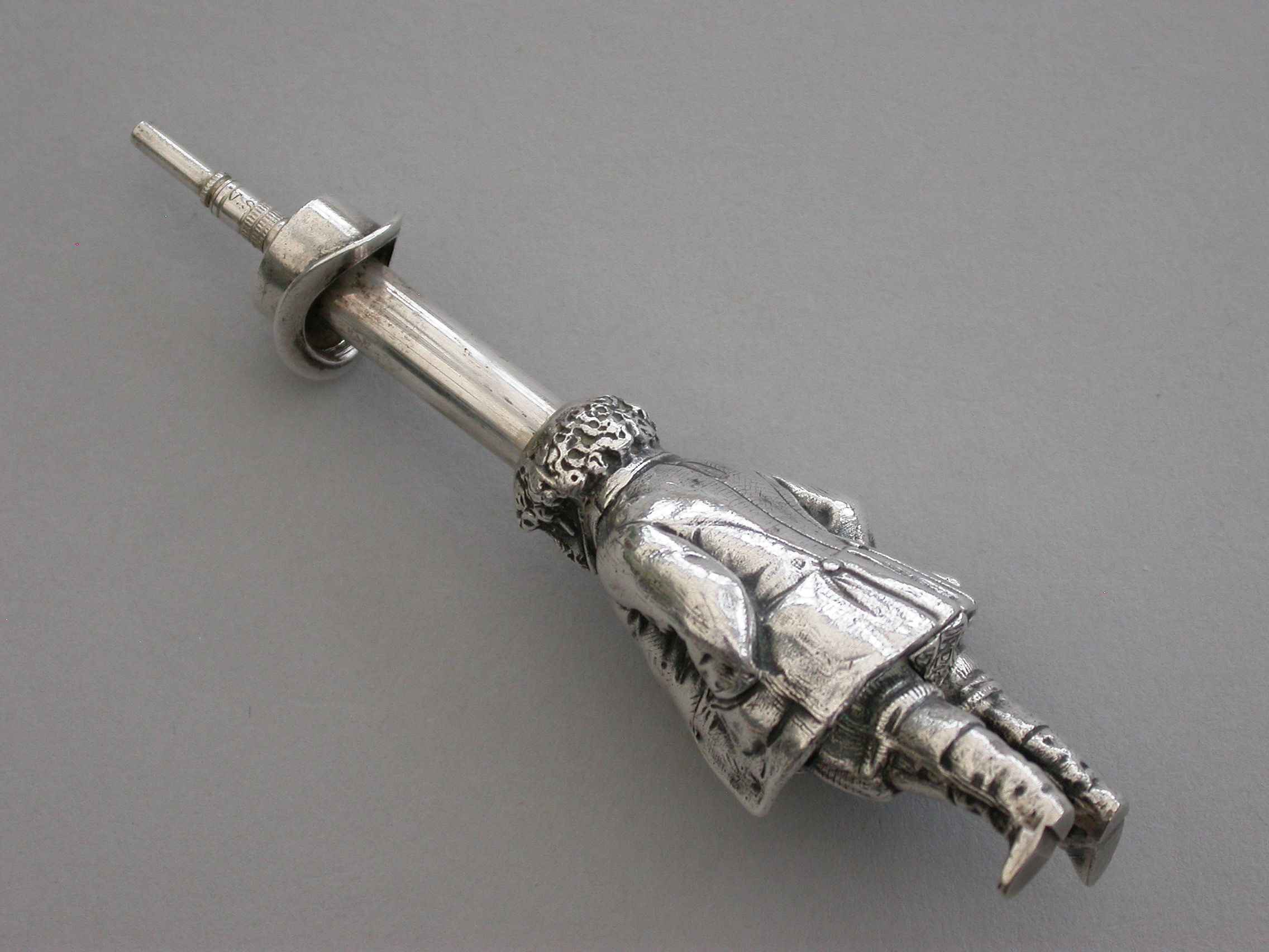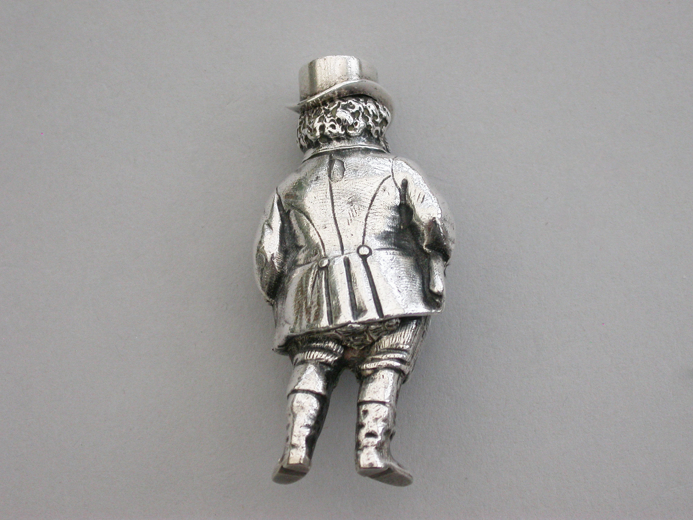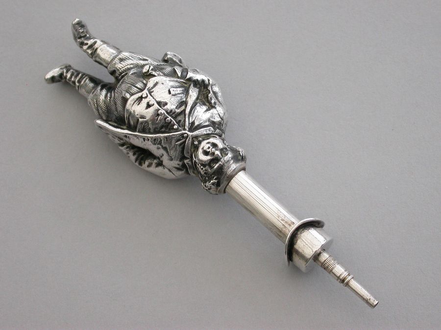 An extremely rare Victorian figural novelty silver telescopic Propelling Pencil made in the form of the comical literary character John Bull (the personification of an Englishman), depicting the stout man wearing a tailcoat, breeches and boots. Pulling on his top hat extends the pencil.