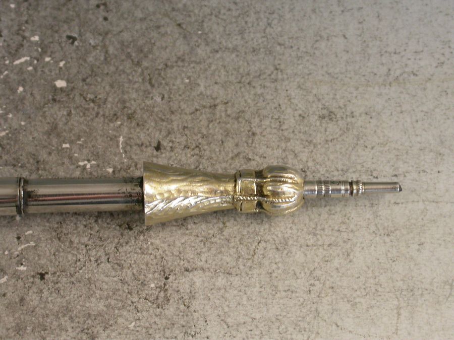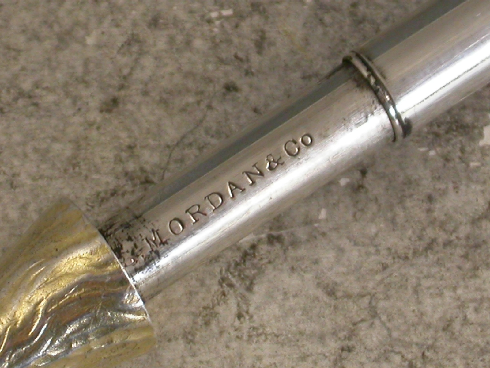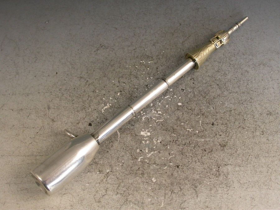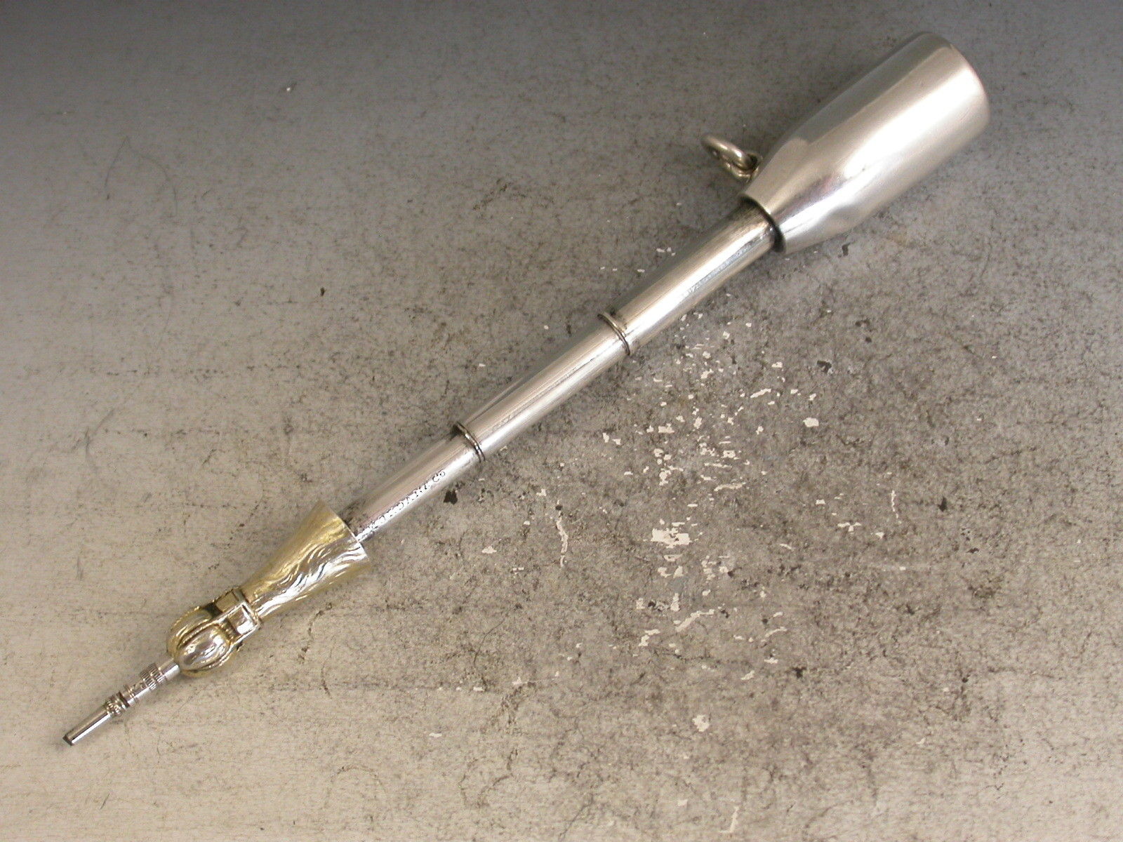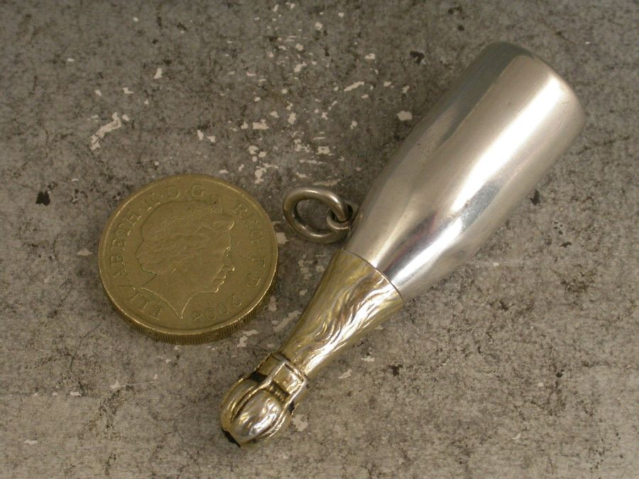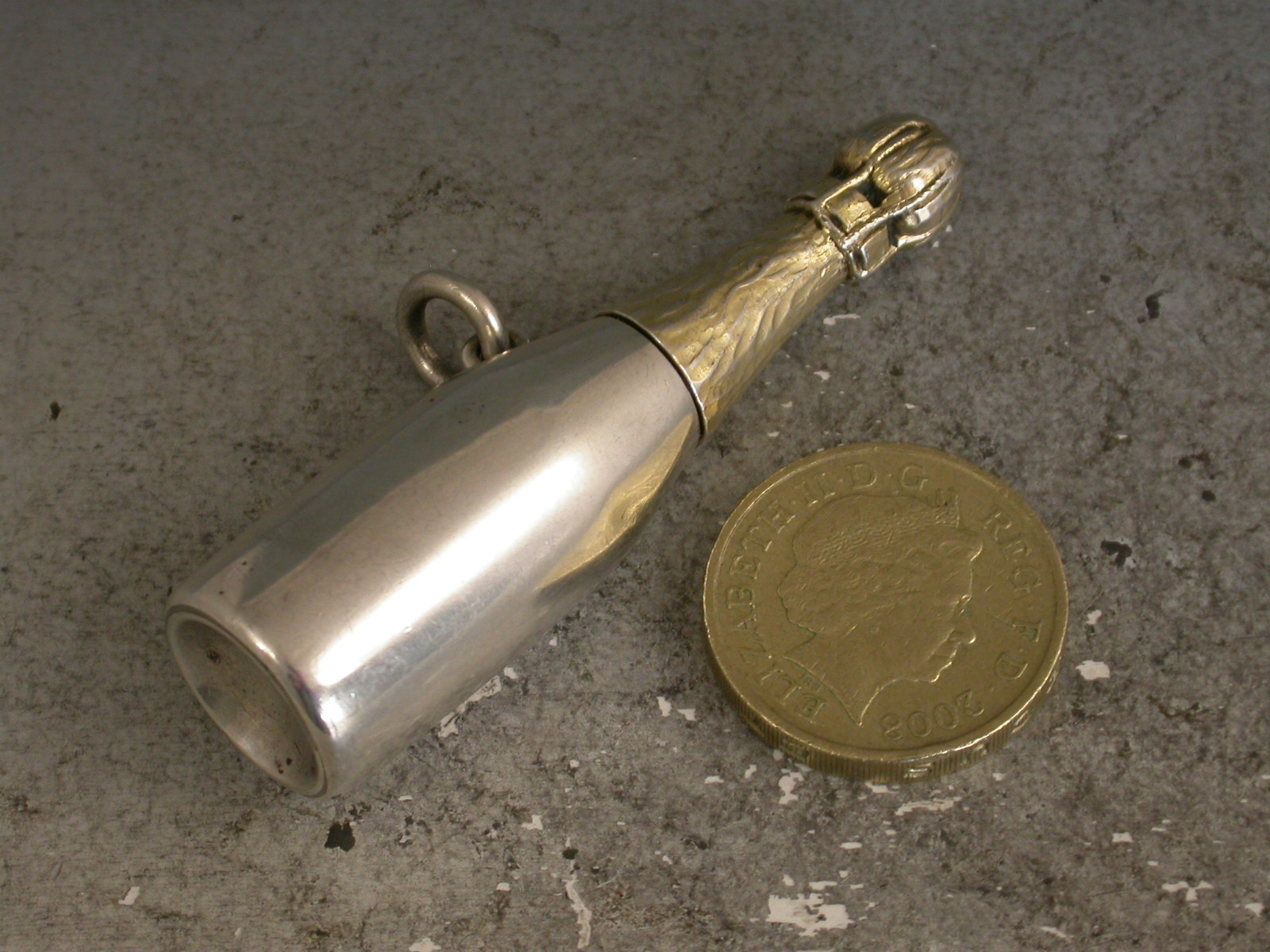 A rare Victorian novelty silver telescopic Propelling Pencil made in the form of a Champagne Bottle of large size, with three drawer telescopic action and attached suspension ring, the top part of the bottle and the cork in silver gilt to simulate the foil wrapping.