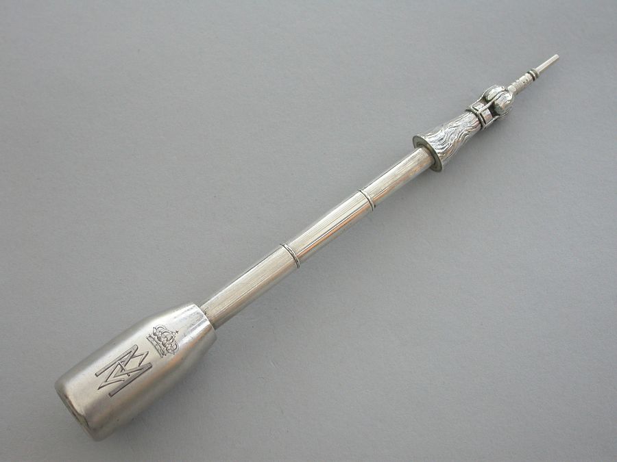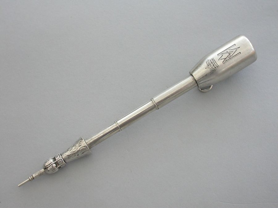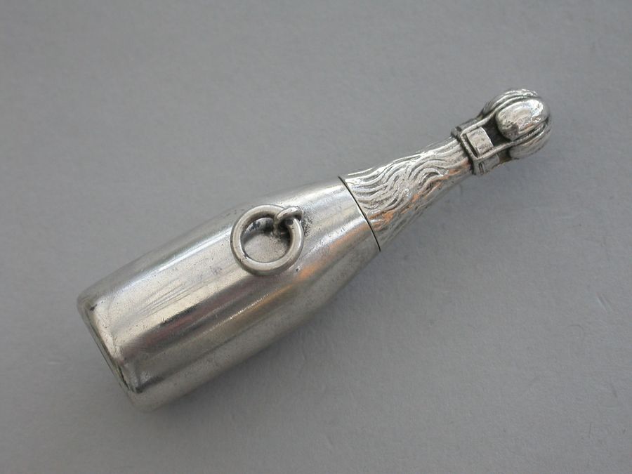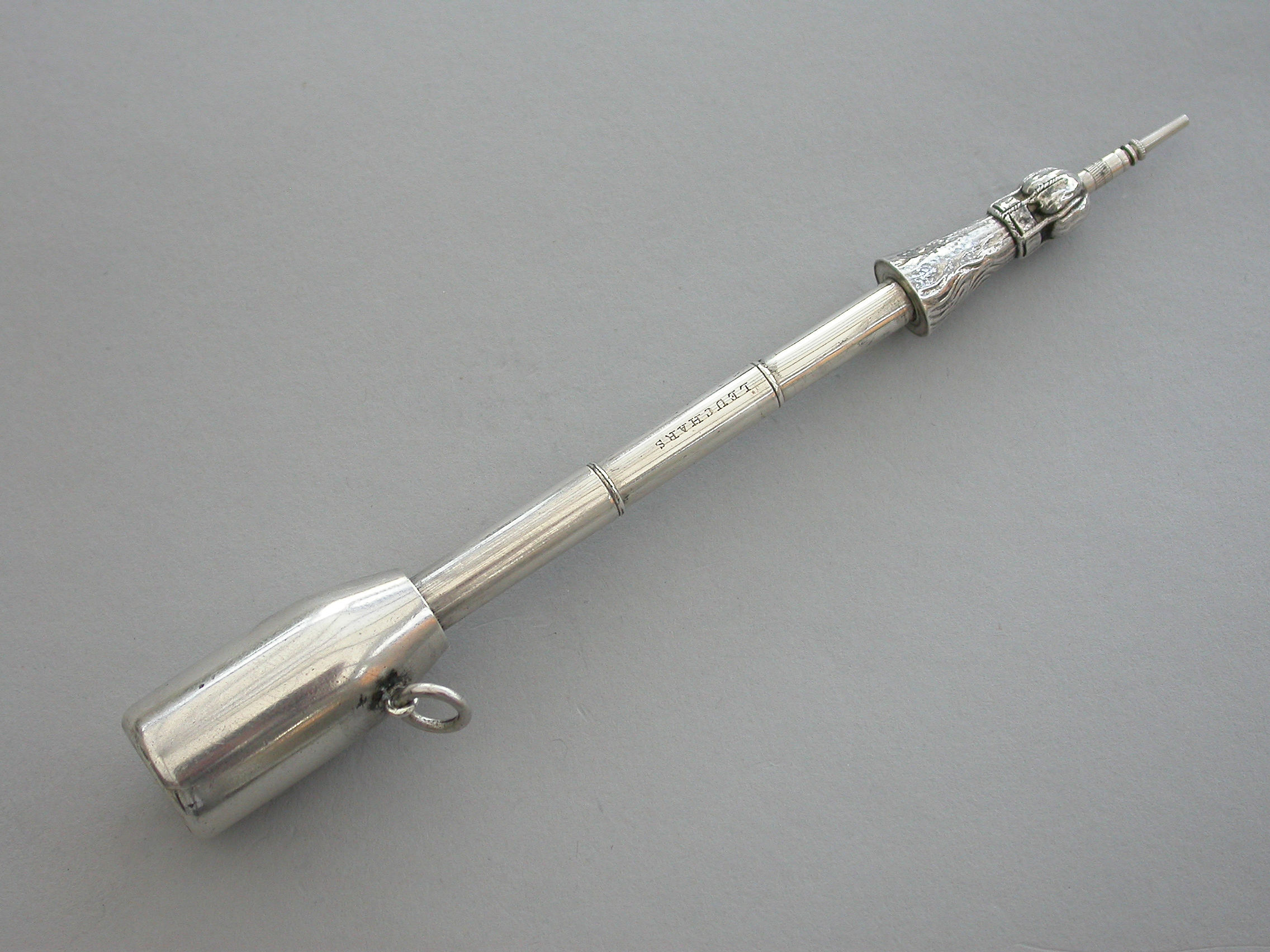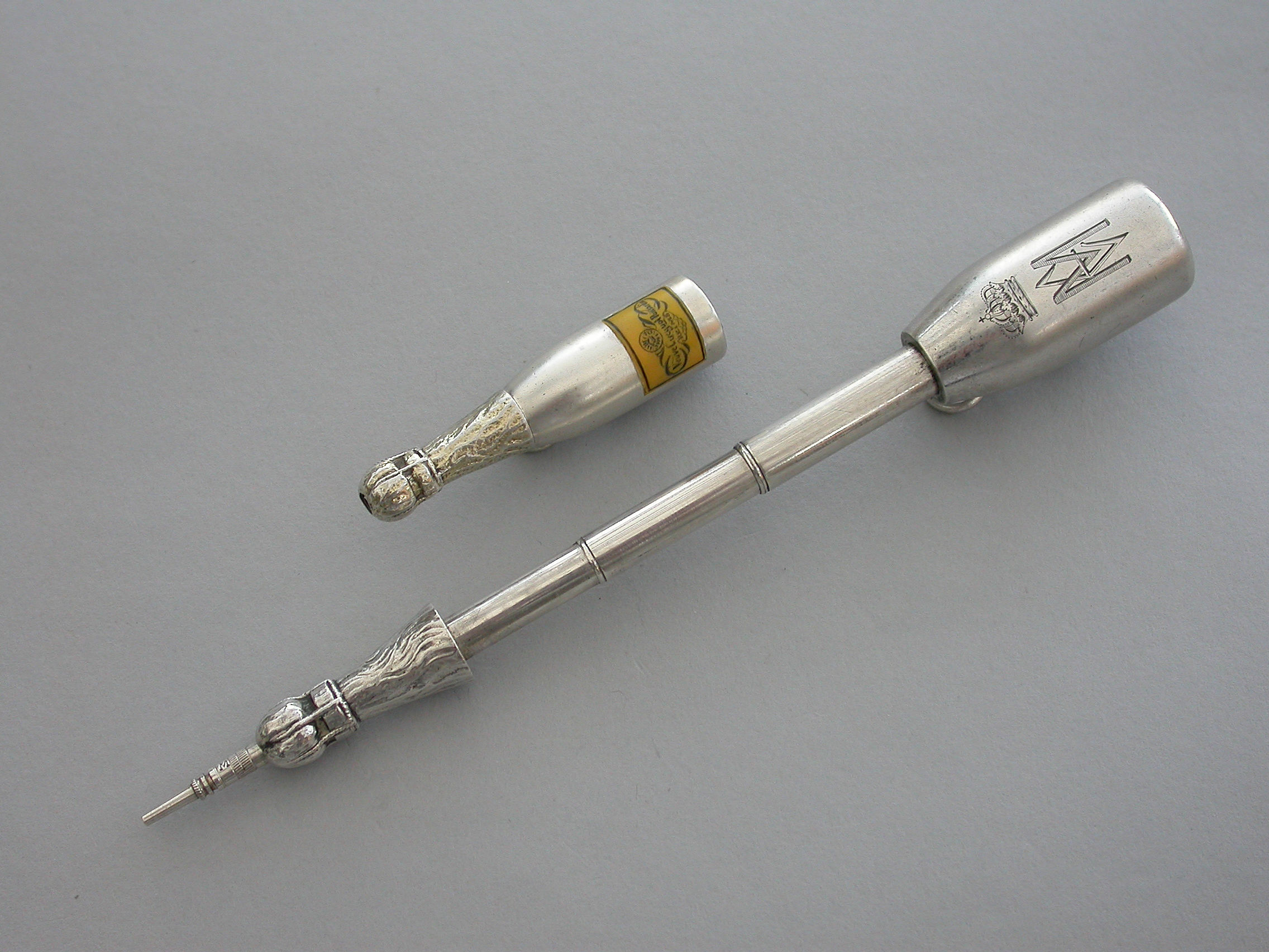 A rare Victorian novelty silver telescopic Propelling Pencil made in the form of a Champagne Bottle and of a larger than average size (probably to represent a Magnum bottle), with three drawer (rather than the more usual two drawer) telescopic action and attached suspension ring.
