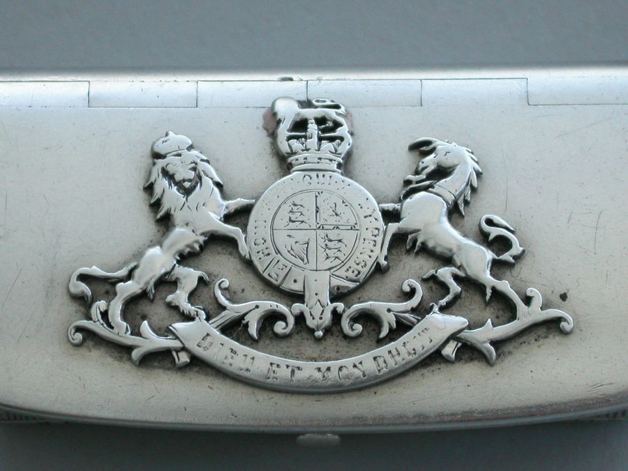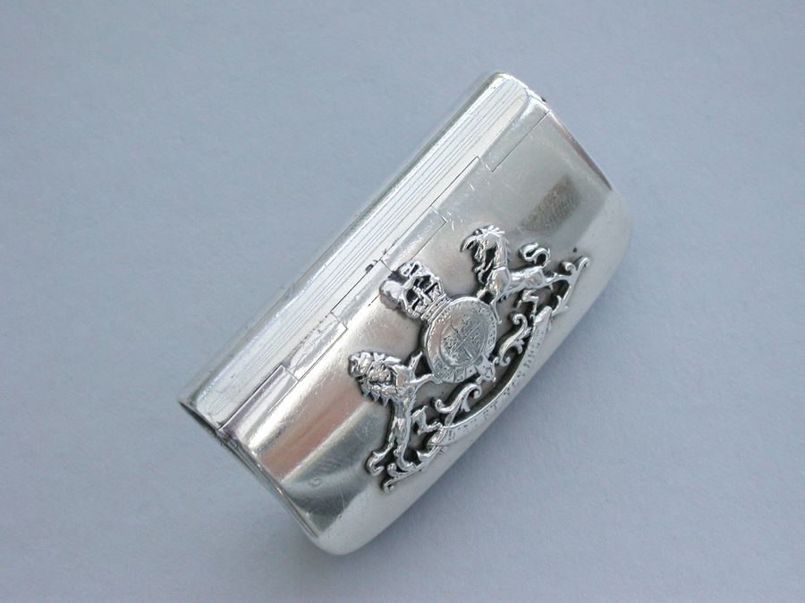 A rare Victorian novelty silver Vesta Case made in the form of a military leather cross-belt pouch with applied Royal coat of arms.
