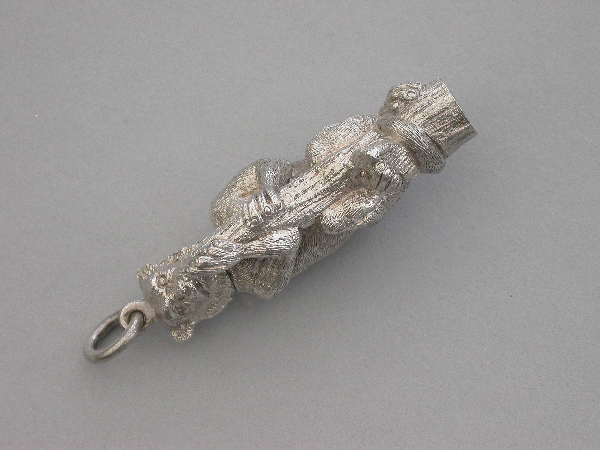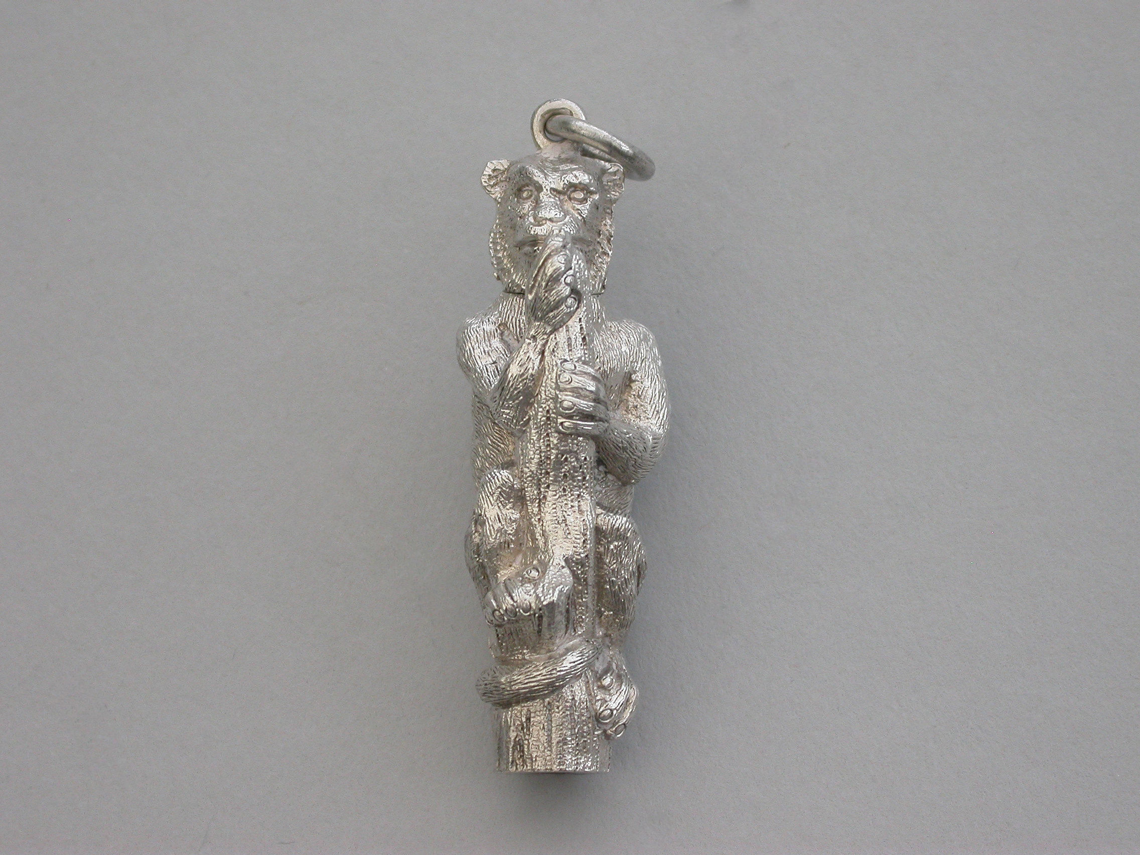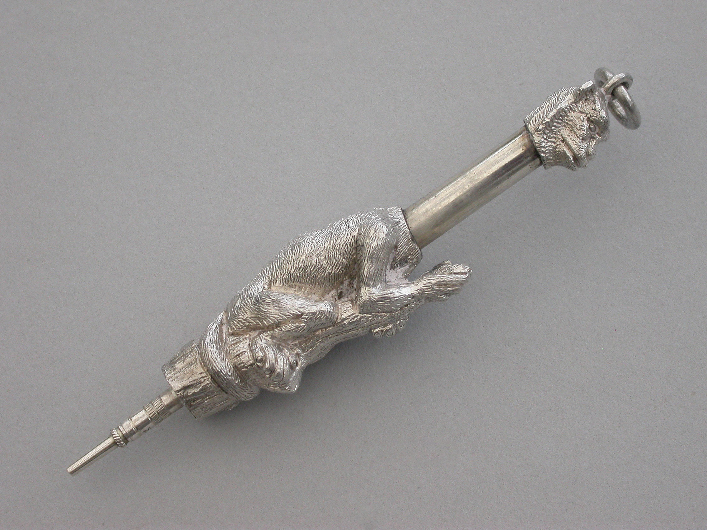 An extremely rare Victorian novelty silver telescopic Propelling Pencil made in the form of a Monkey holding a wooden staff, with attached suspension ring.