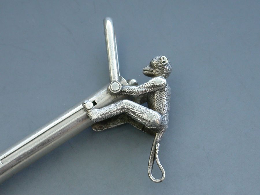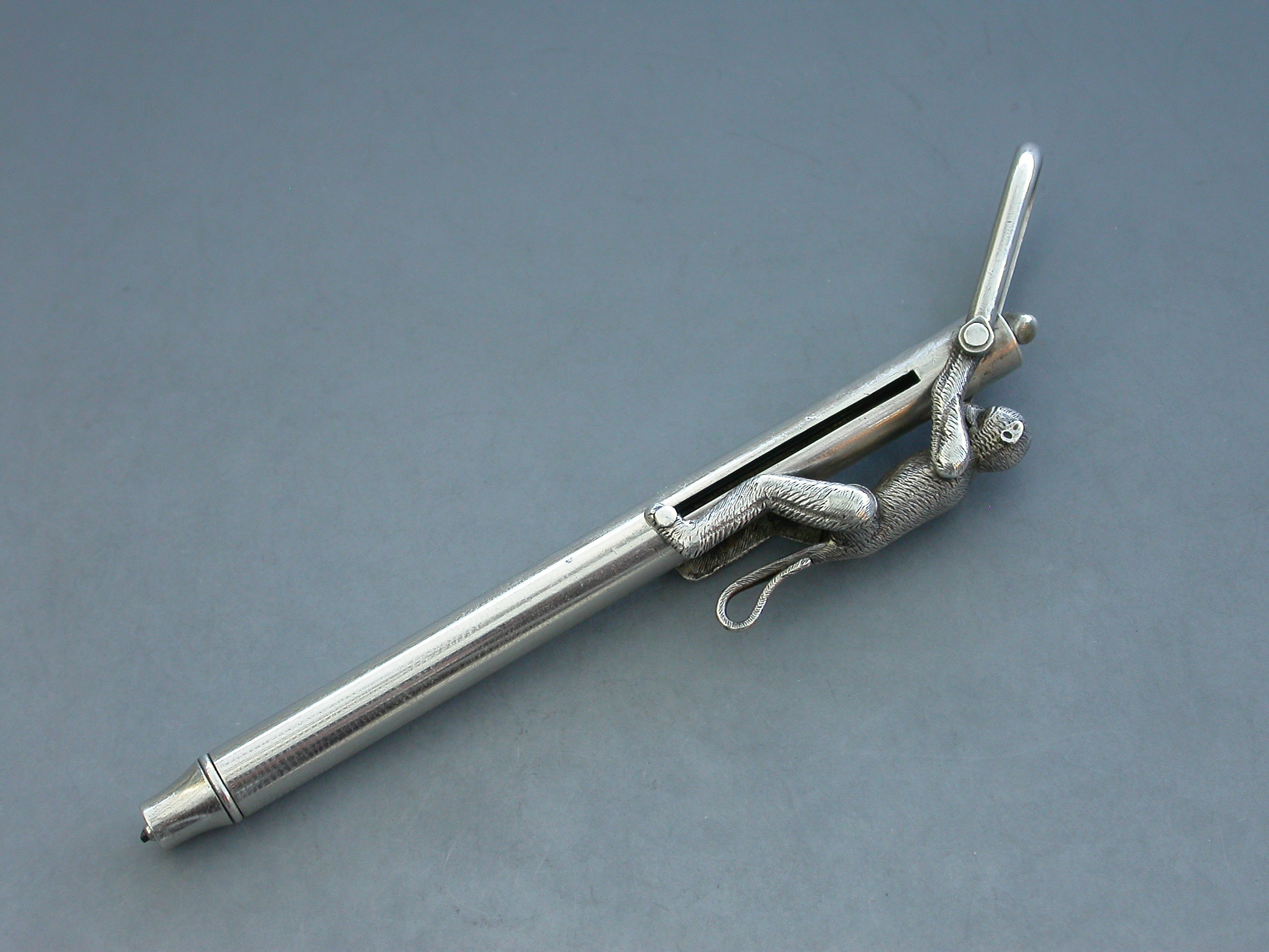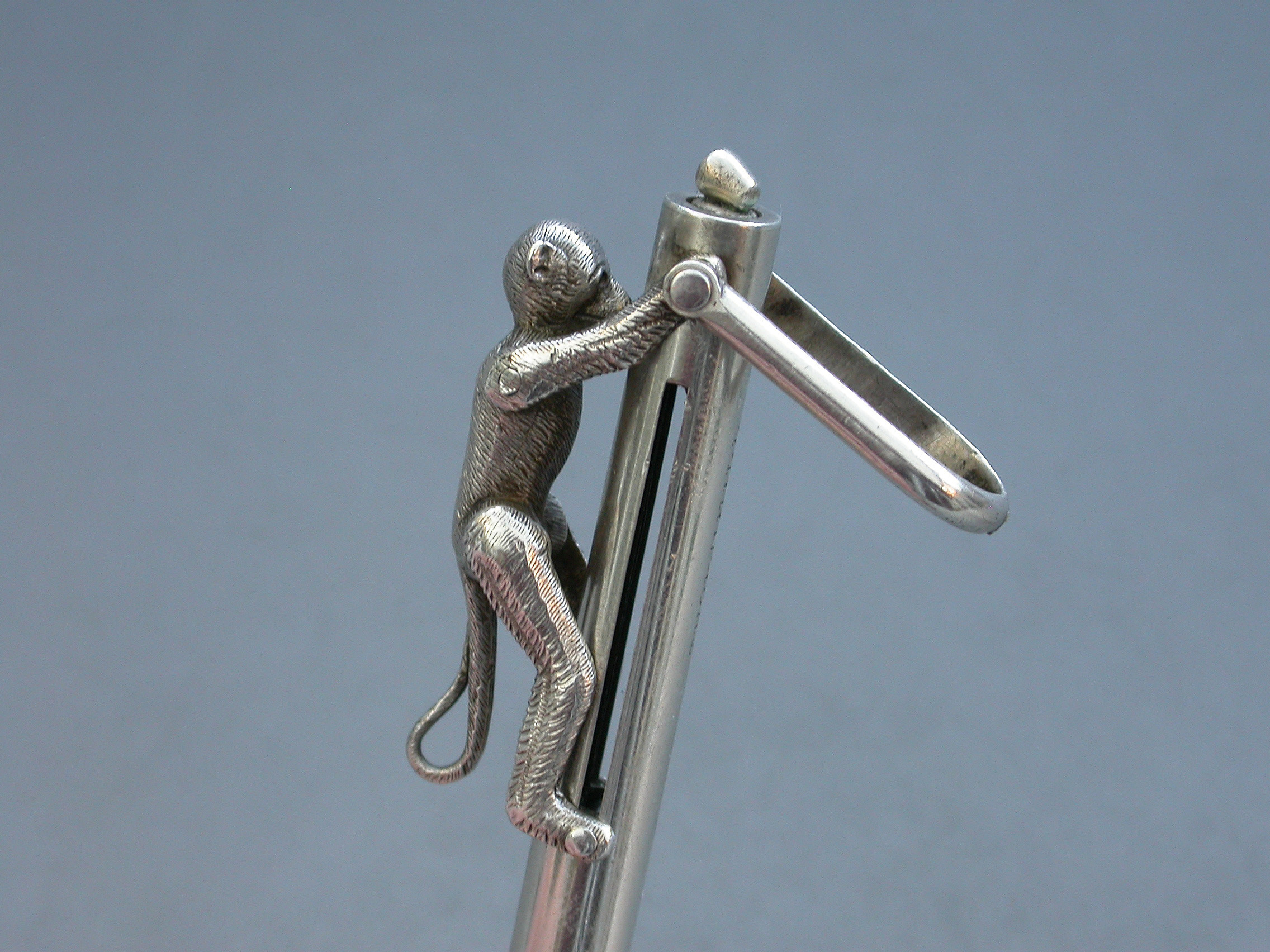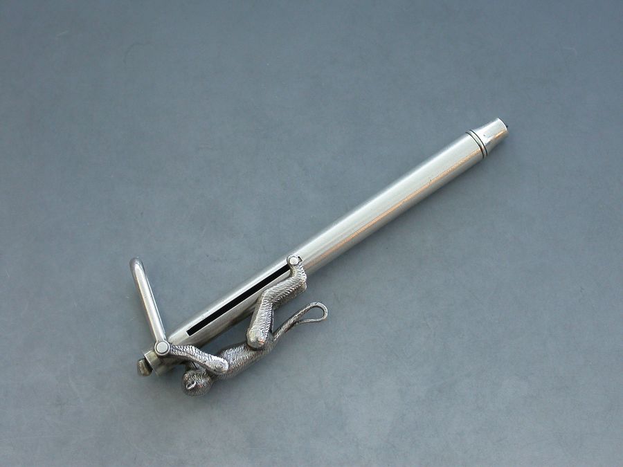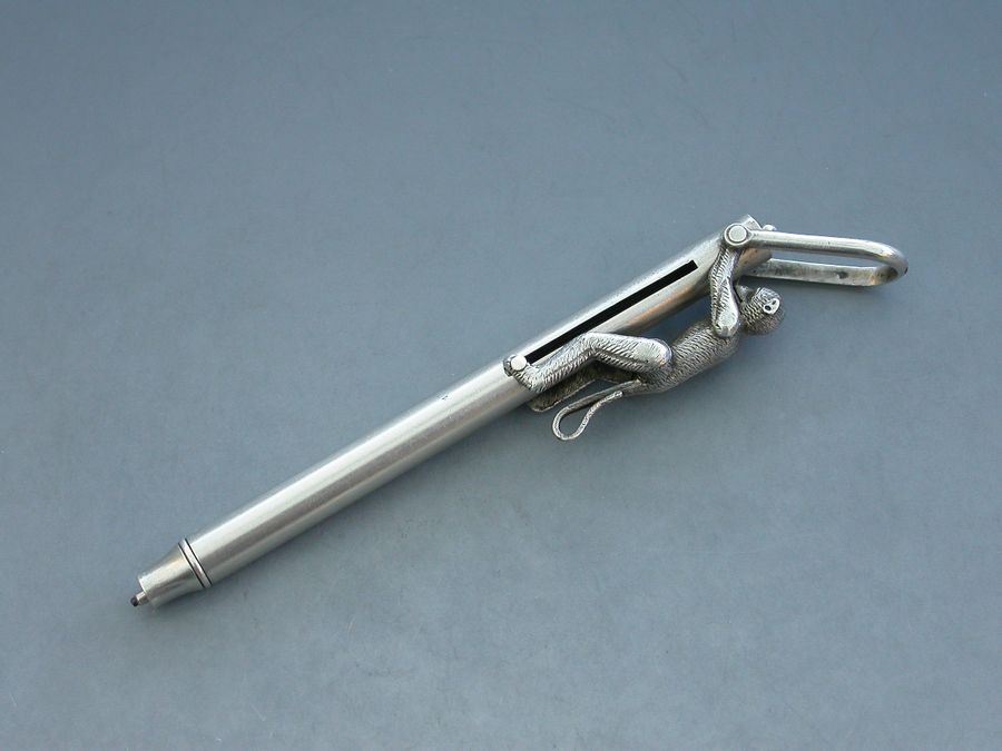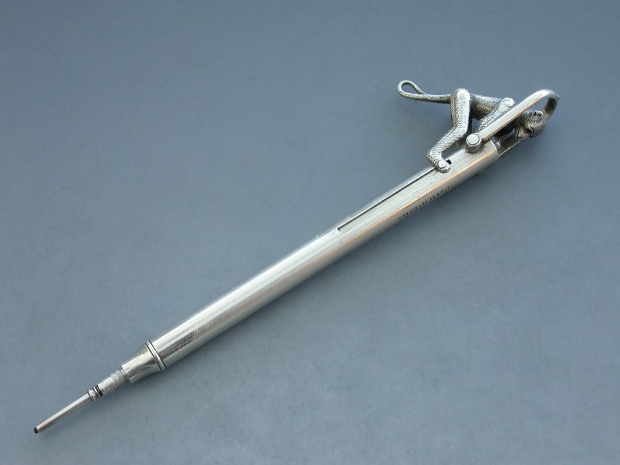 An extremely rare Victorian novelty silver Propelling Pencil formed as an articulated monkey climbing a pole to reach a coconut, with attached stirrup shaped suspension ring. When the monkey climbs the pole the pencil is extended and the coconut disappears.