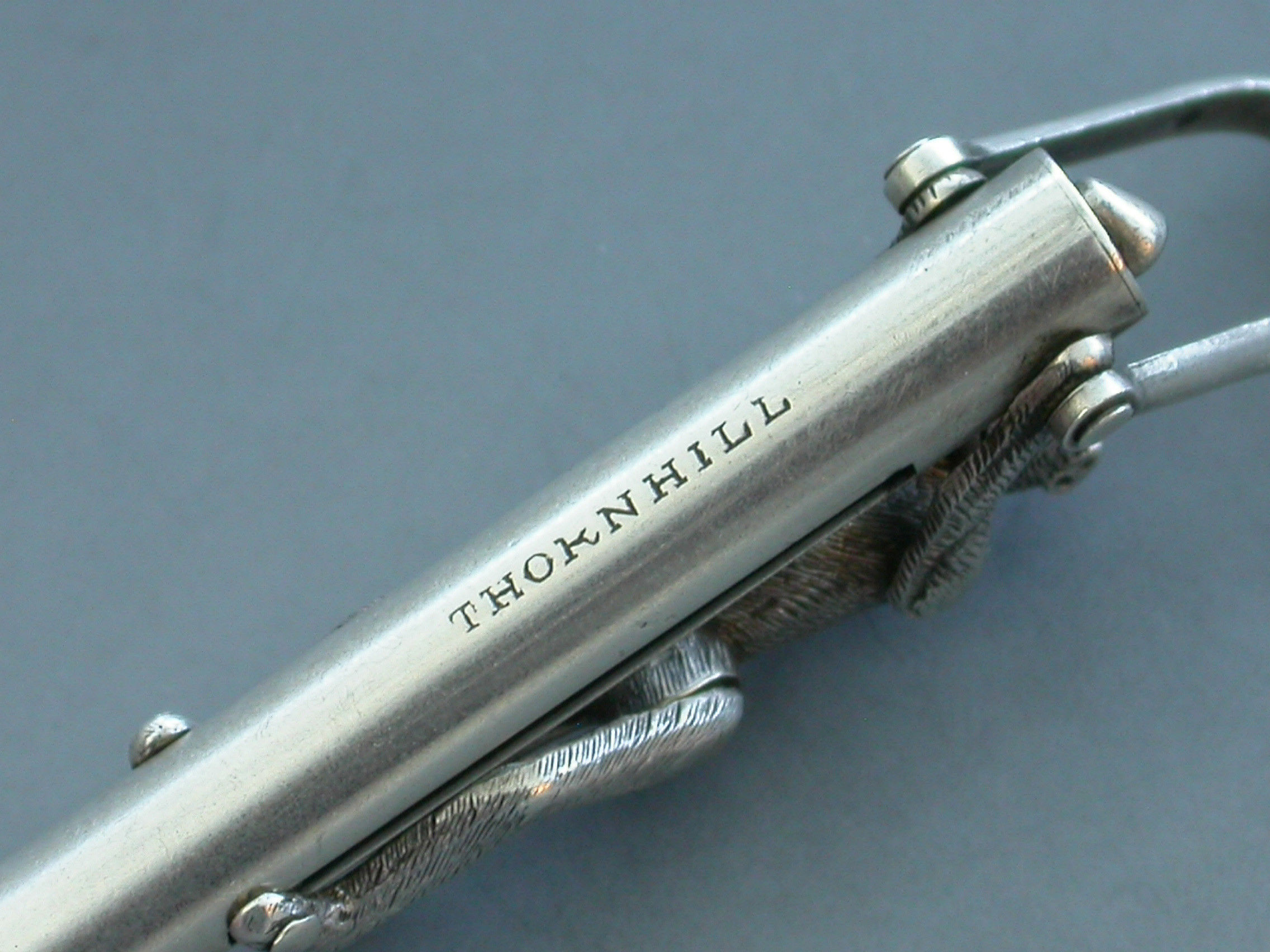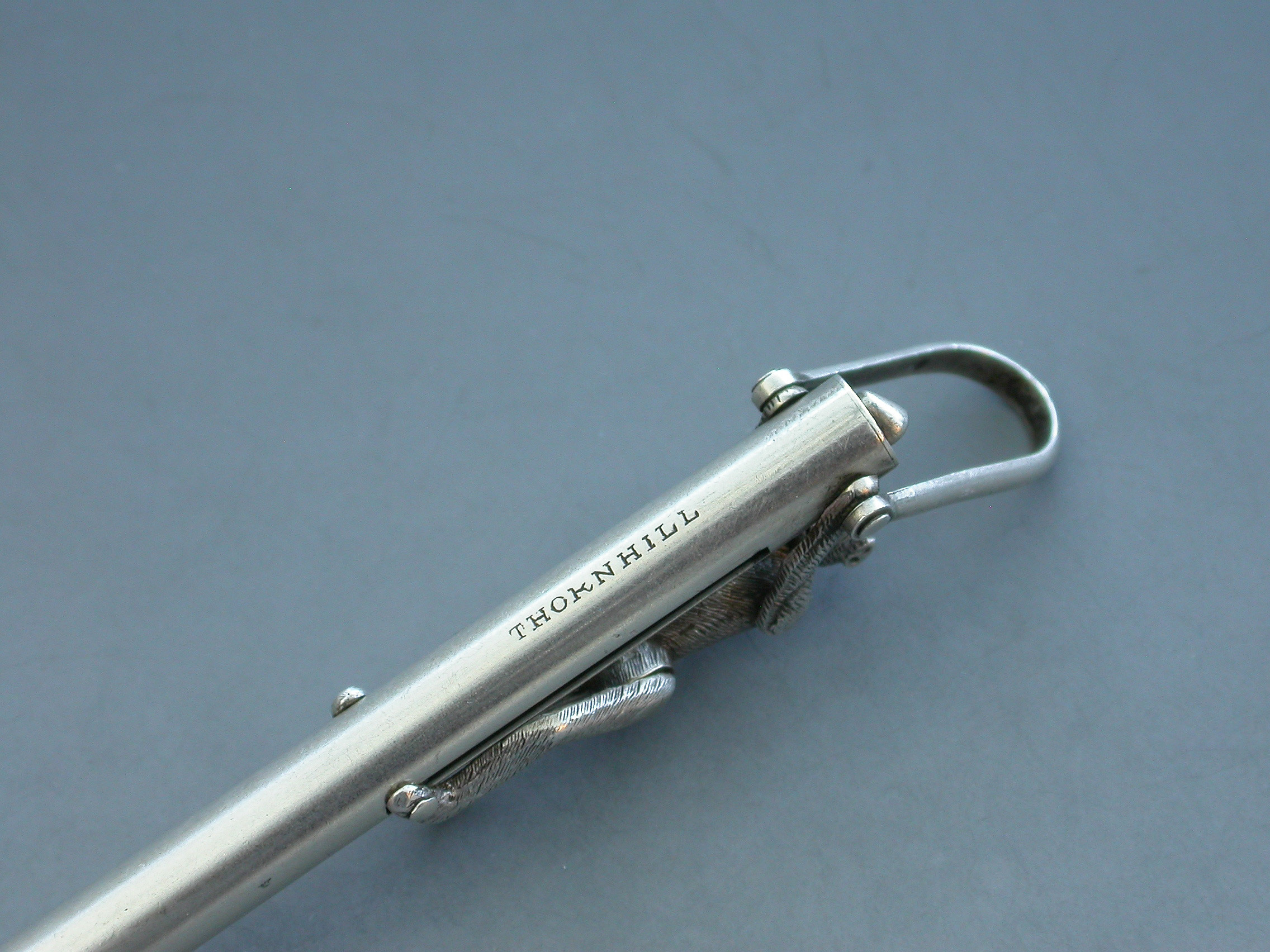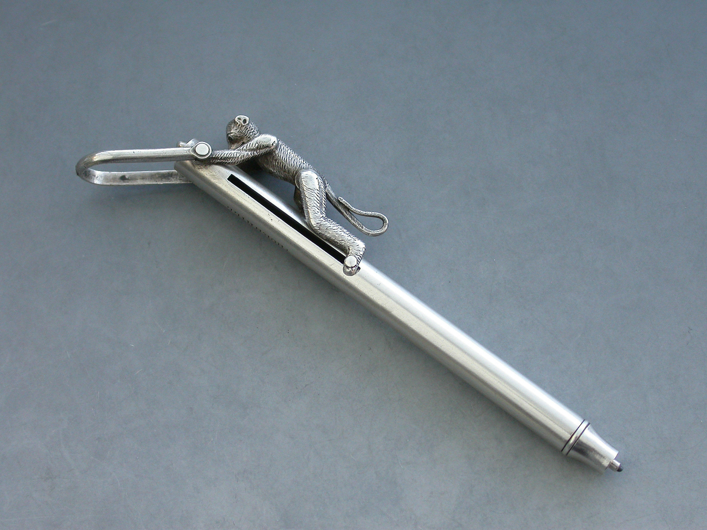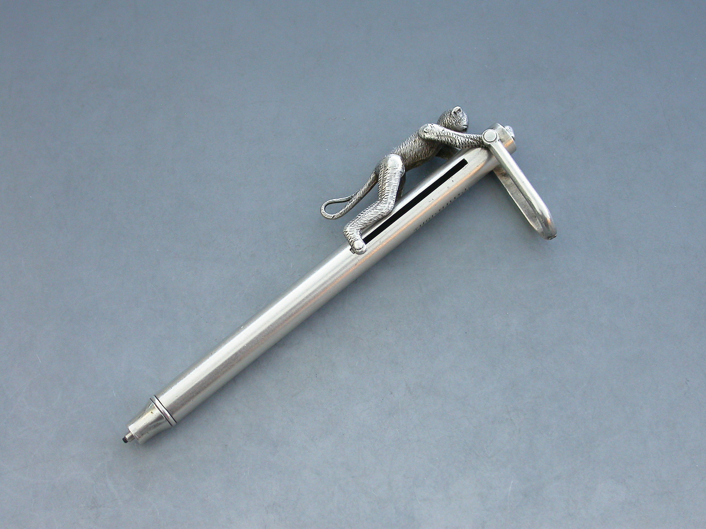 An extremely rare Victorian novelty silver Propelling Pencil formed as an articulated monkey climbing a pole to reach a coconut, with attached stirrup shaped suspension ring. When the monkey climbs the pole the pencil is extended and the coconut disappears.