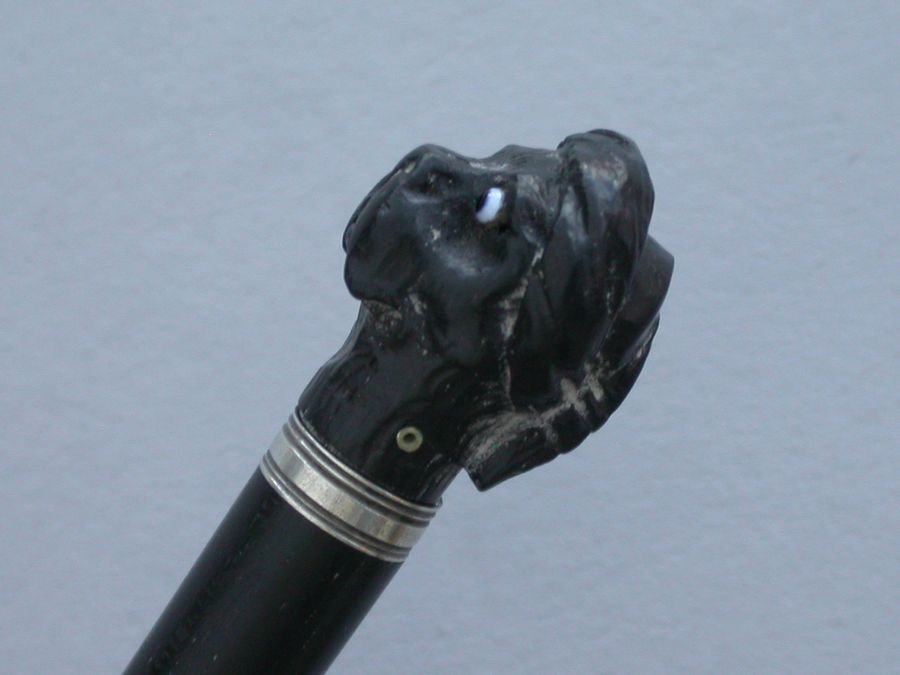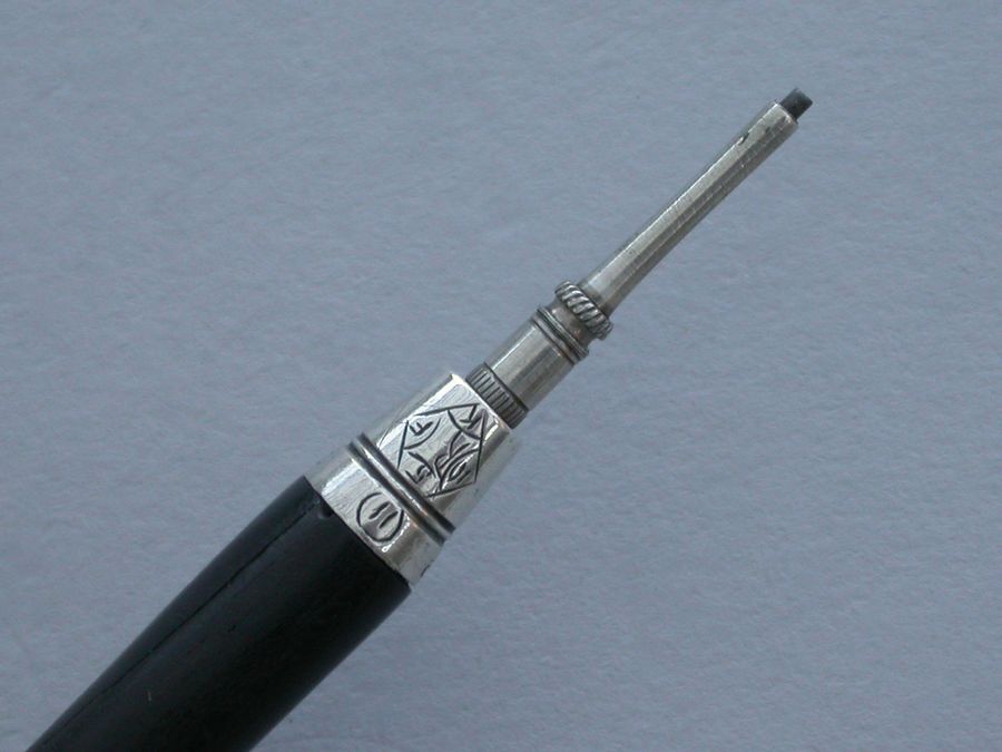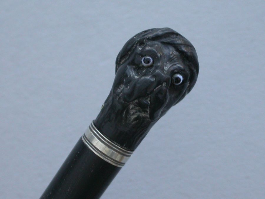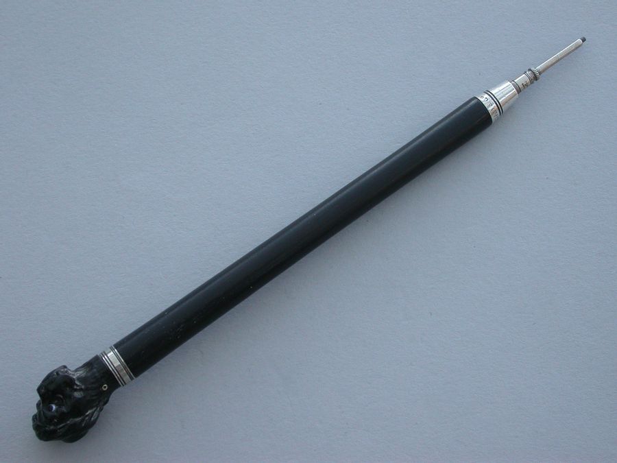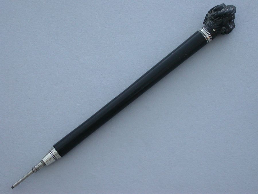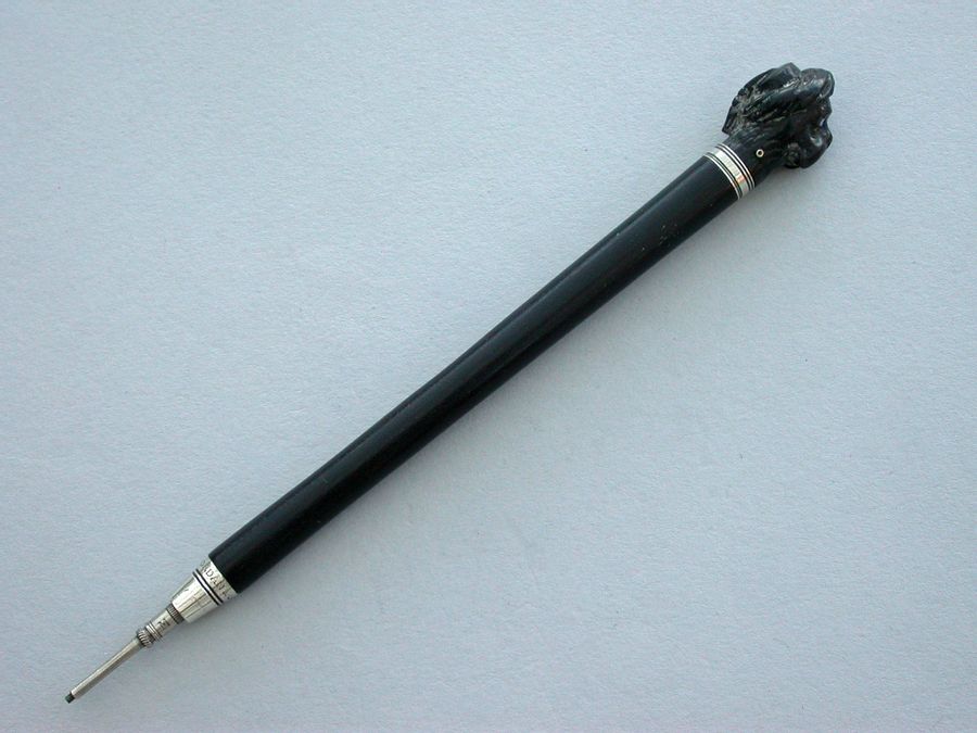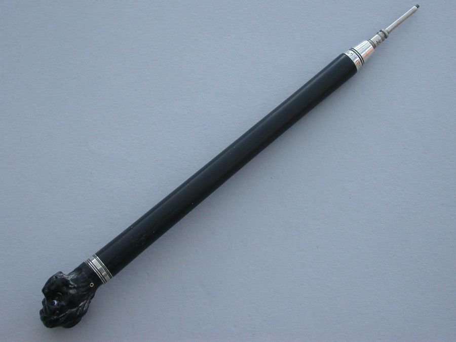 A rare Victorian novelty silver mounted carved ebony Propelling Pencil, the terminal formed as a moorish type dogs head wearing a Tam o'Shanter hat, with pale blue glass eyes. Twist opening mechanism.