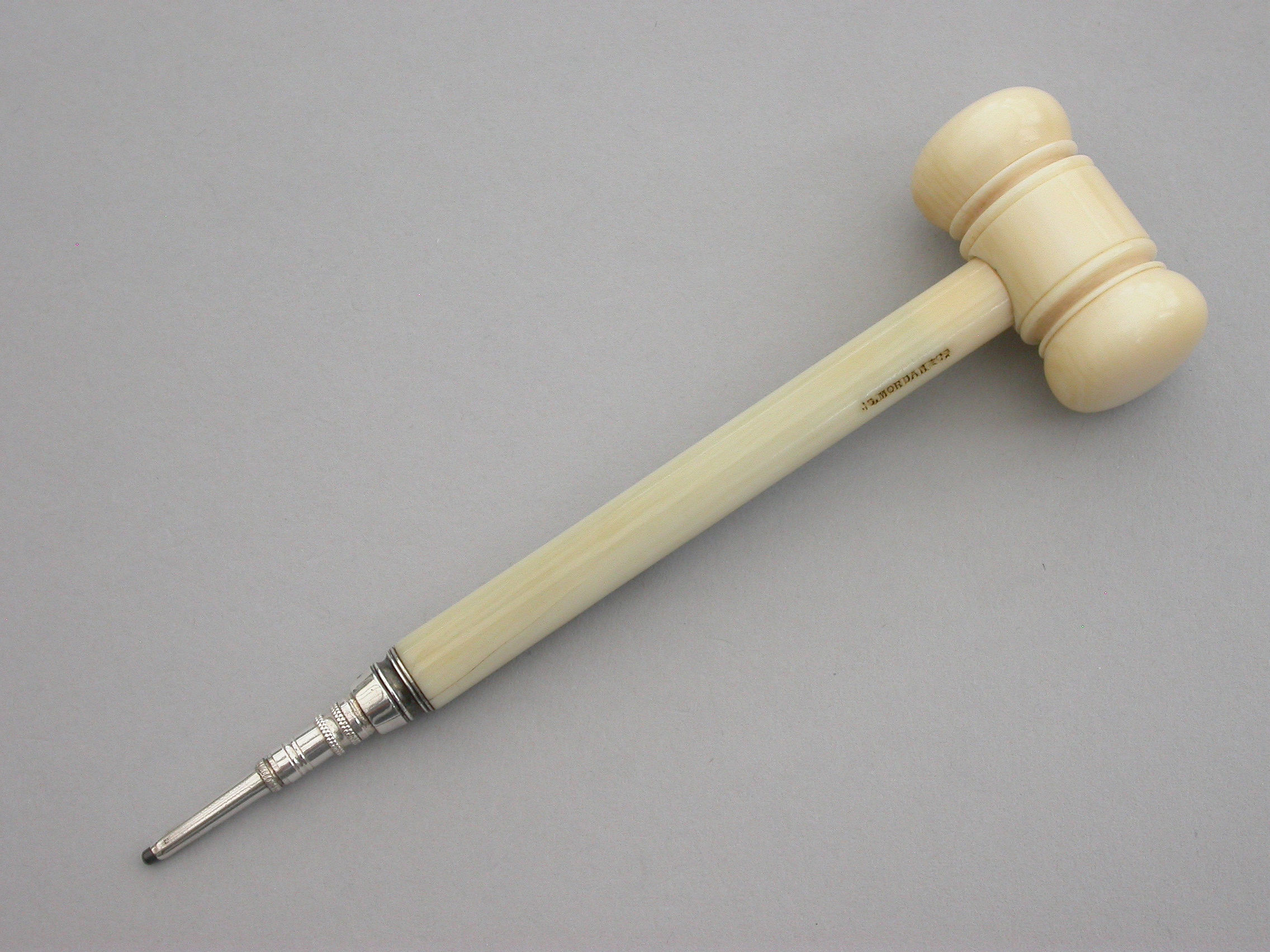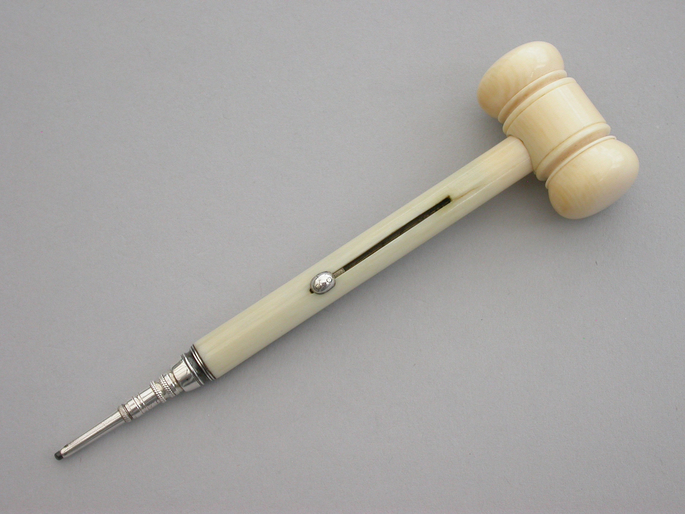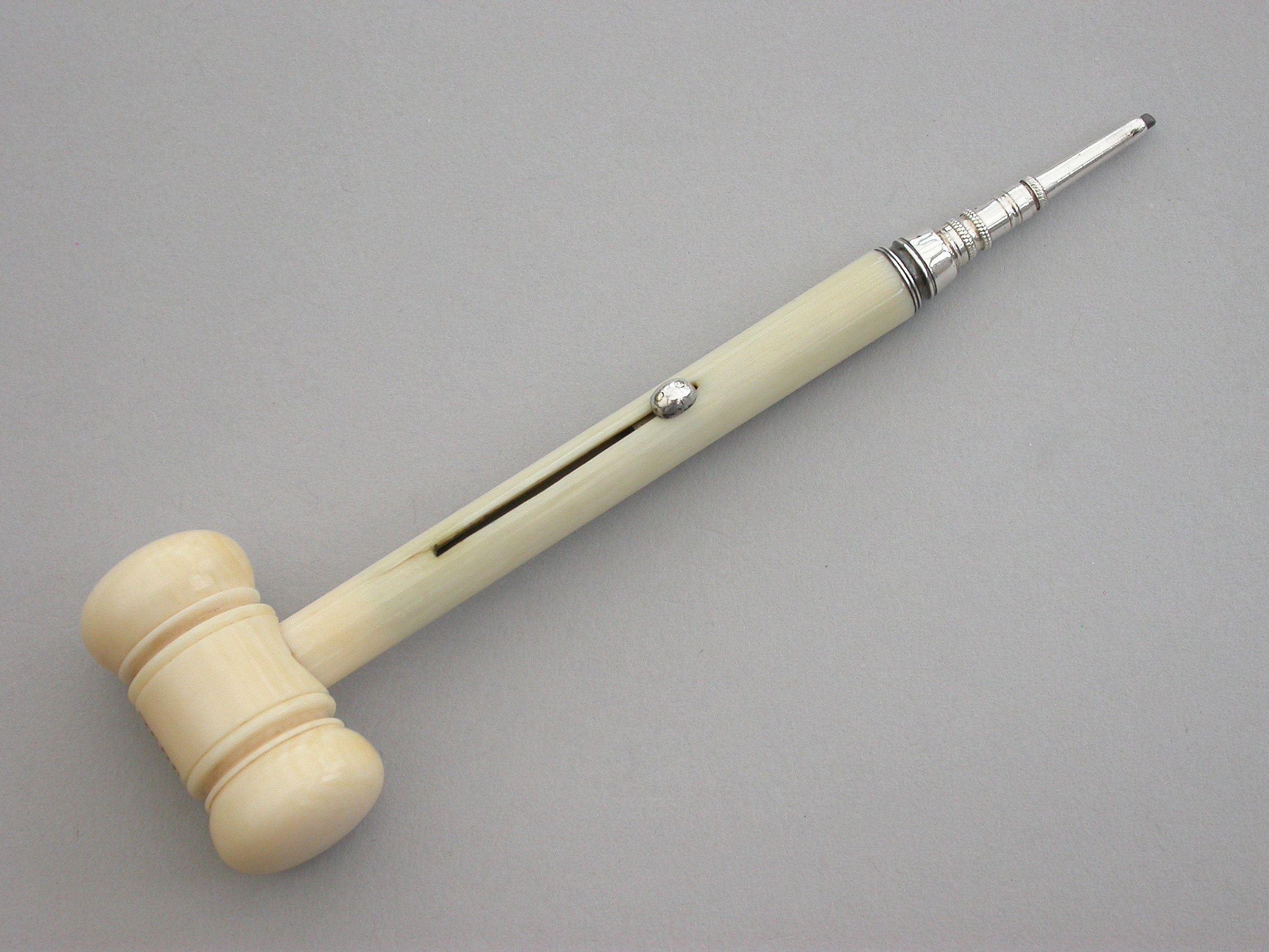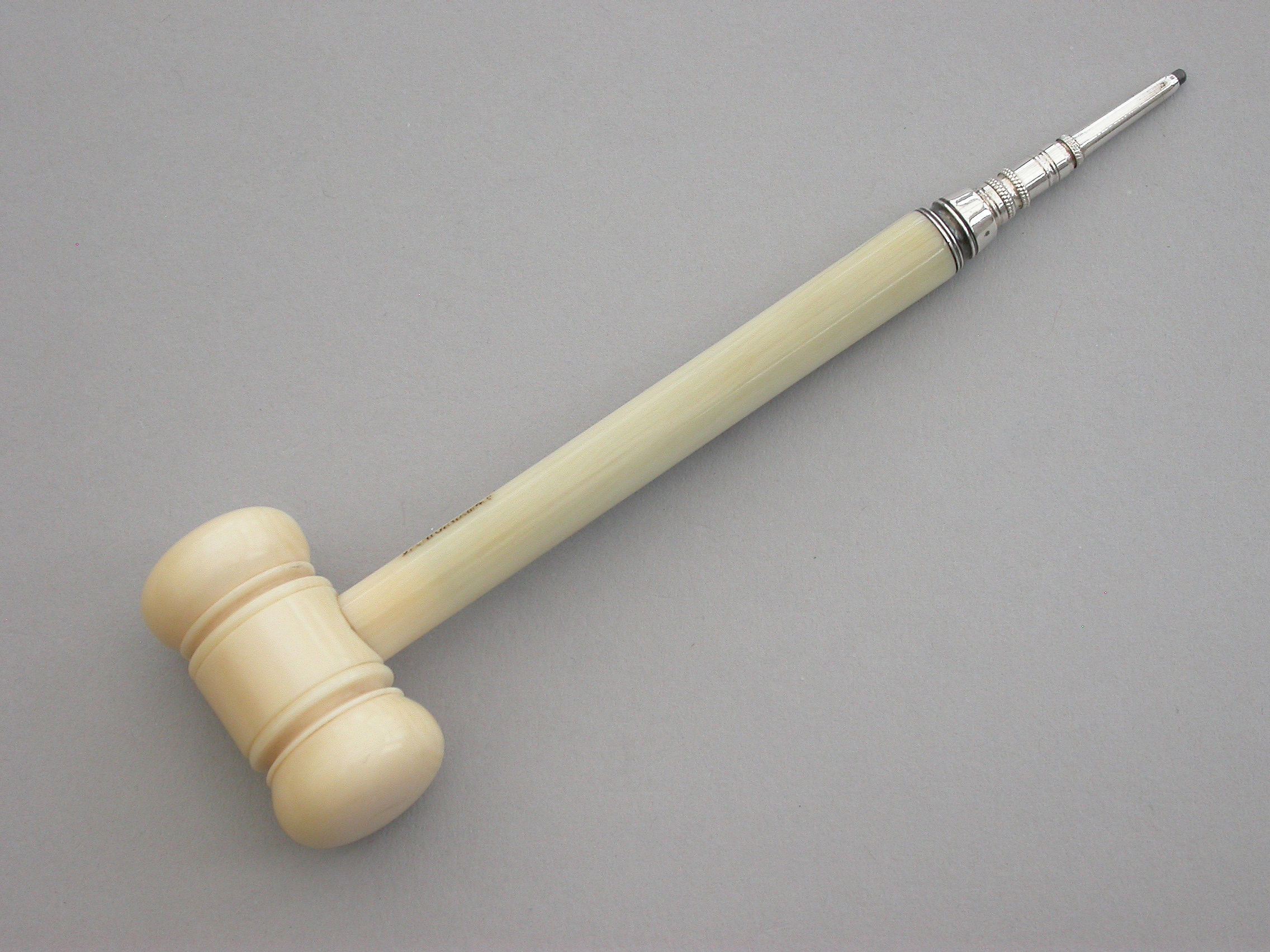A rare Victorian novelty silver mounted ivory Propelling Pencil made in the form of an Auctioneers Gavel, with push button sliding mechanism to open.