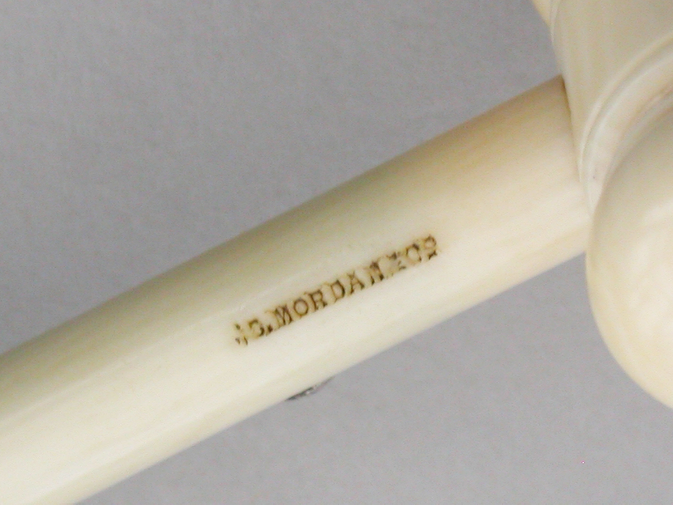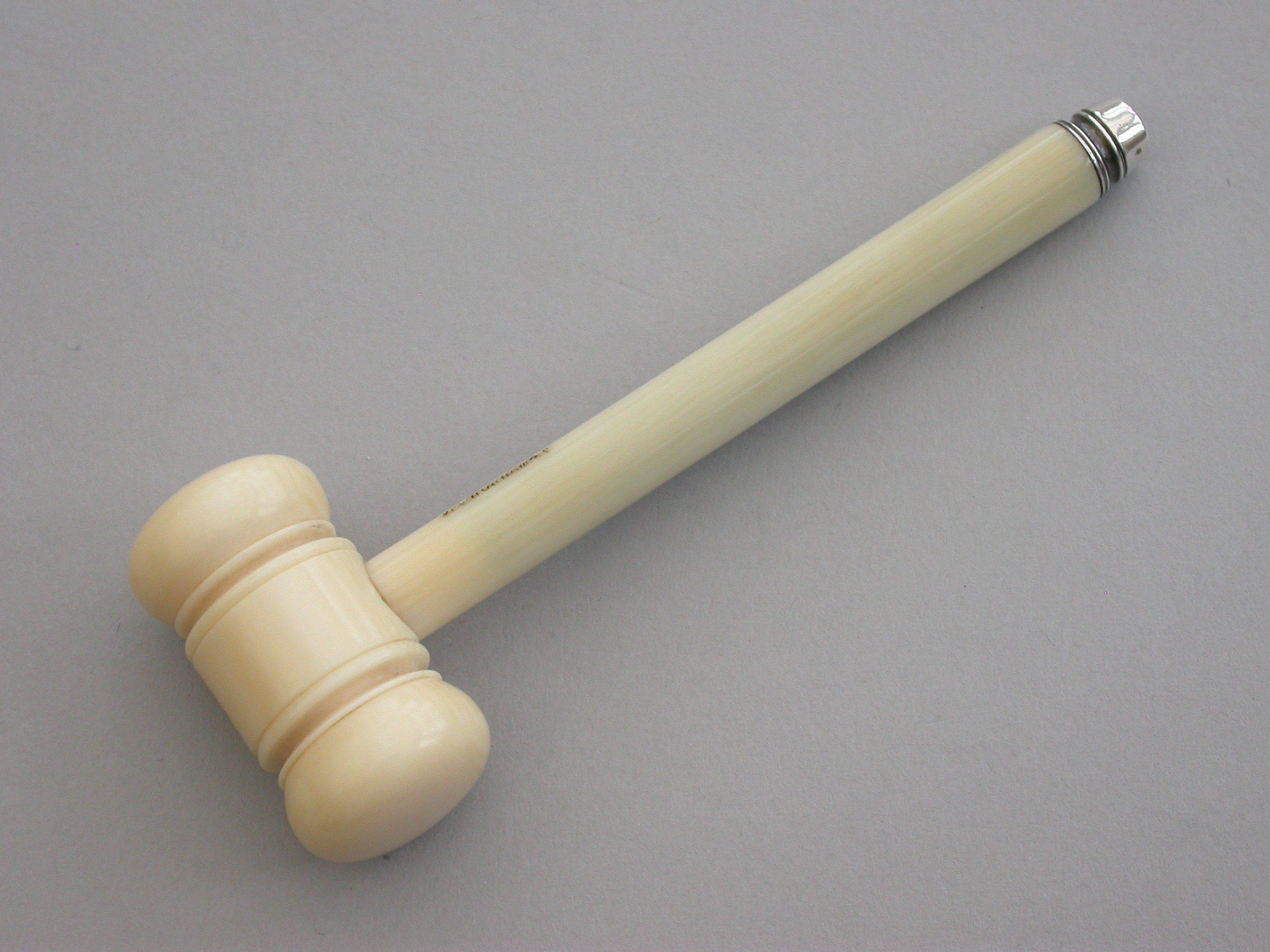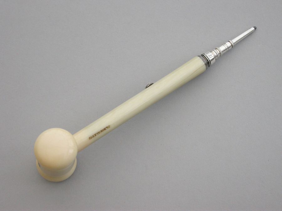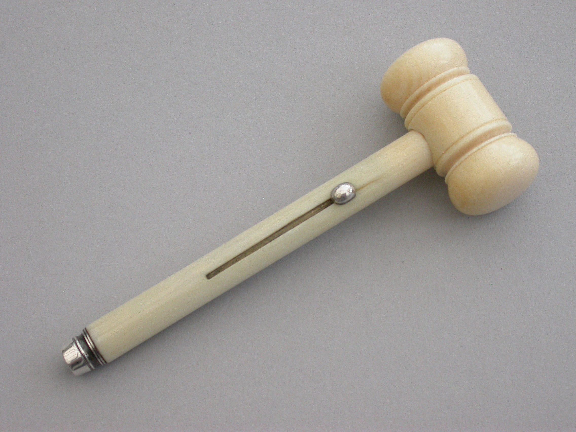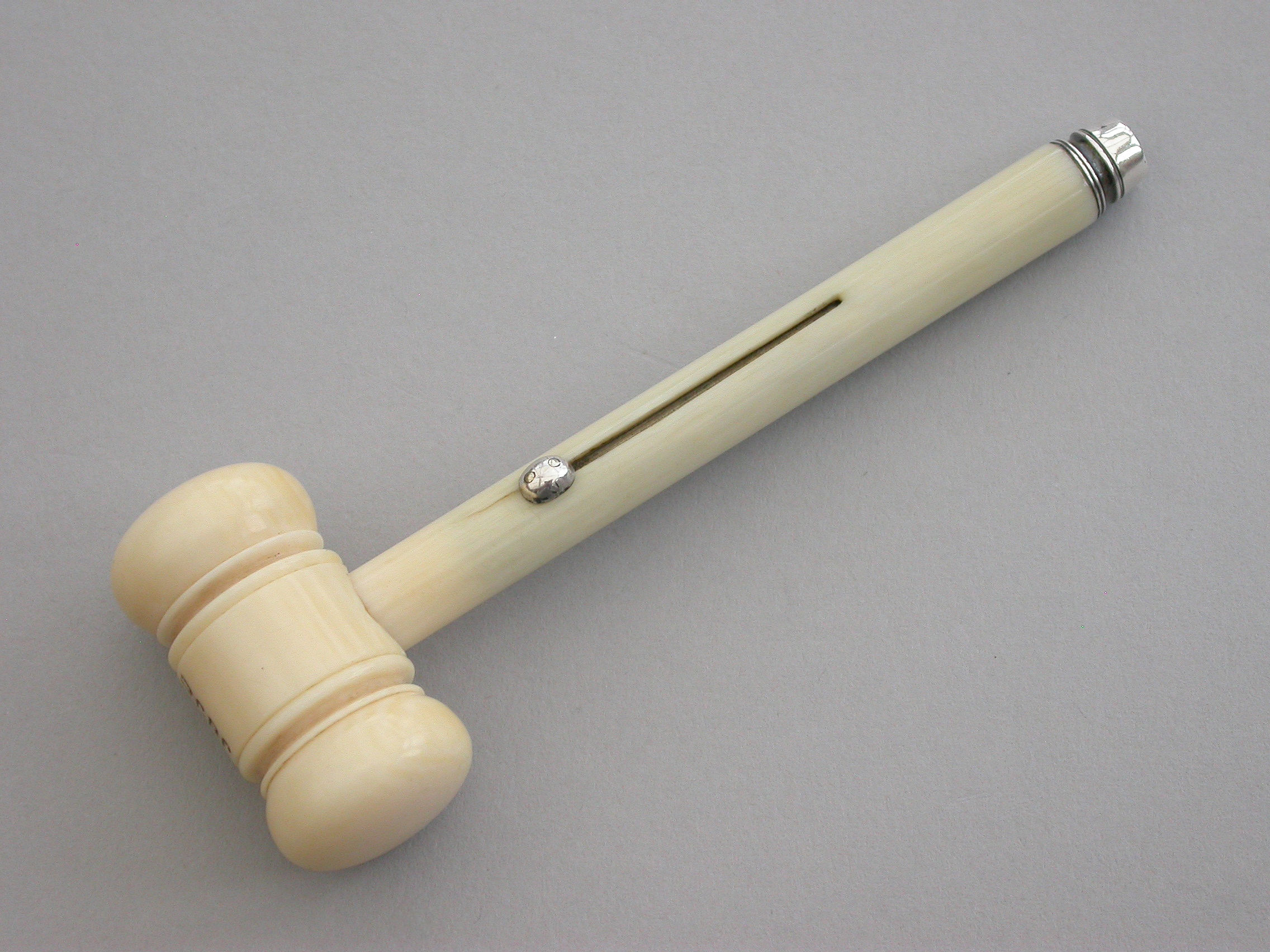 A rare Victorian novelty silver mounted ivory Propelling Pencil made in the form of an Auctioneers Gavel, with push button sliding mechanism to open.