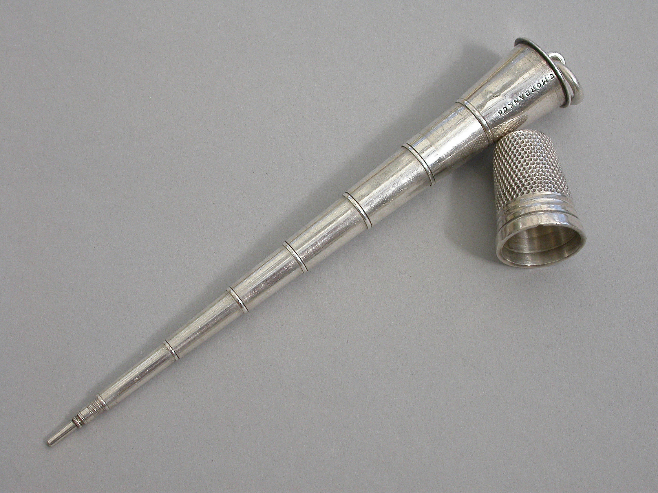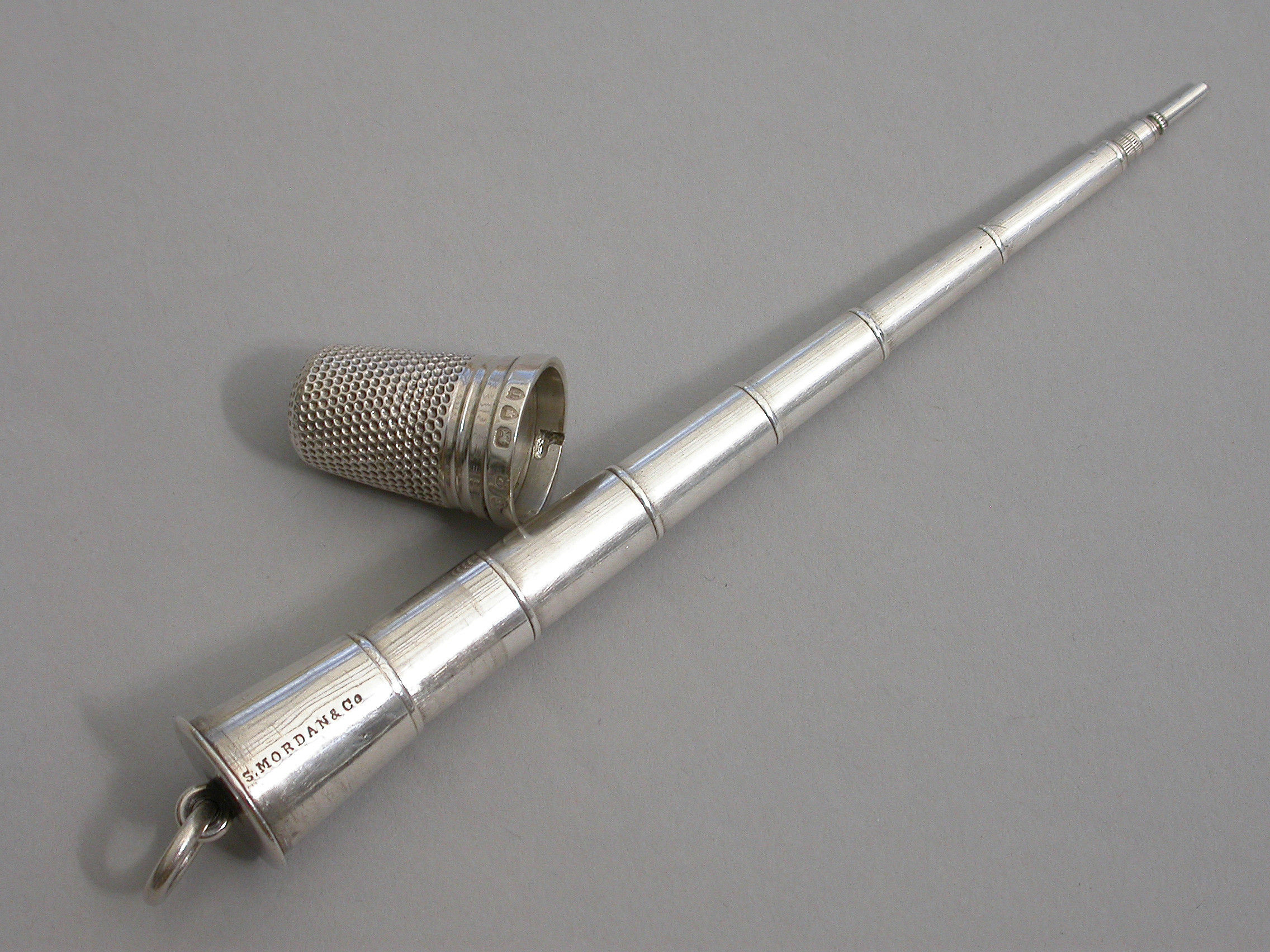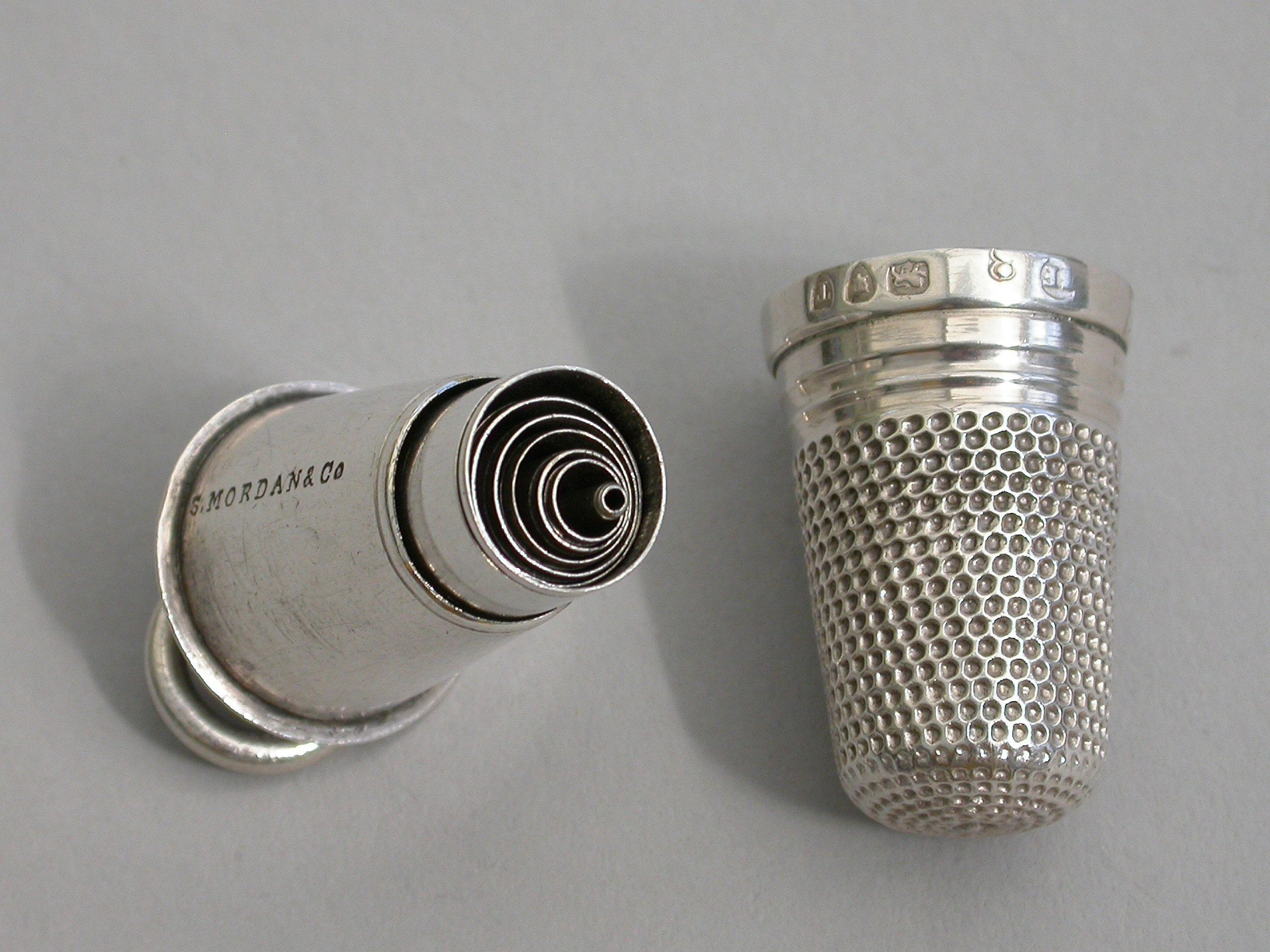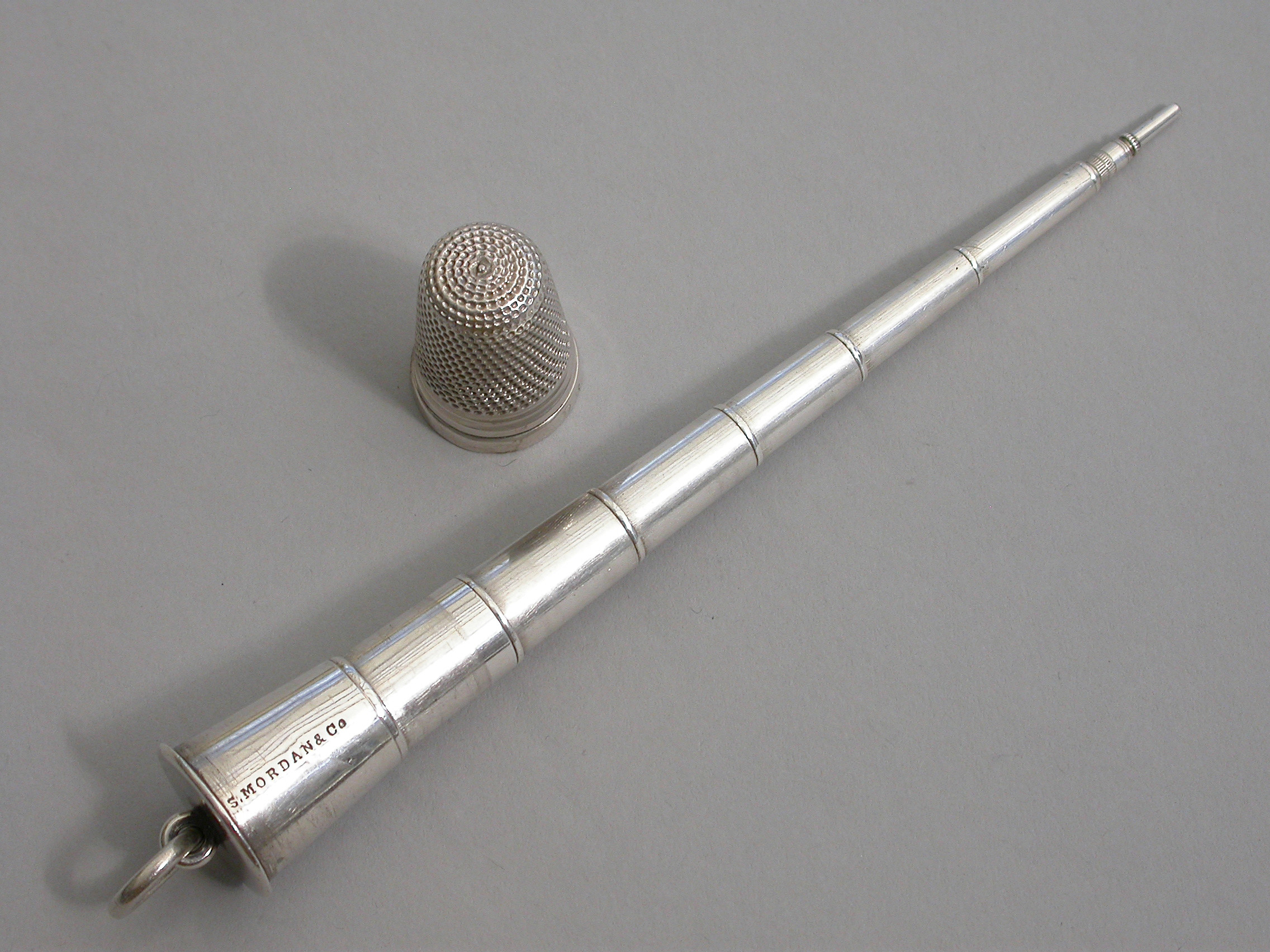 An extremely rare Victorian novelty silver Propelling Pencil with six drawer telescopic action and attached suspension ring, the whole fitting inside a silver thimble when collapsed, a bayonet fitting to secure.