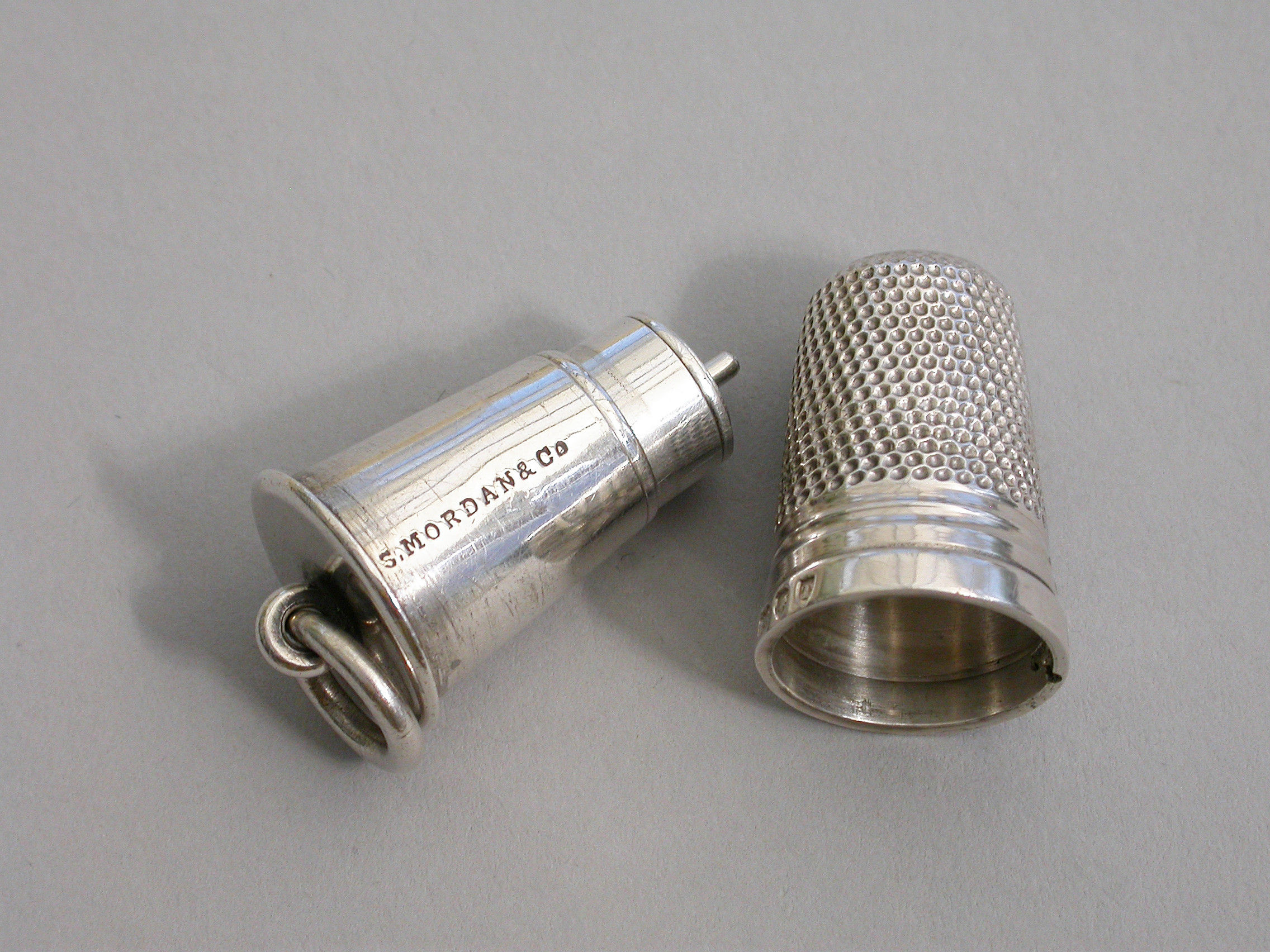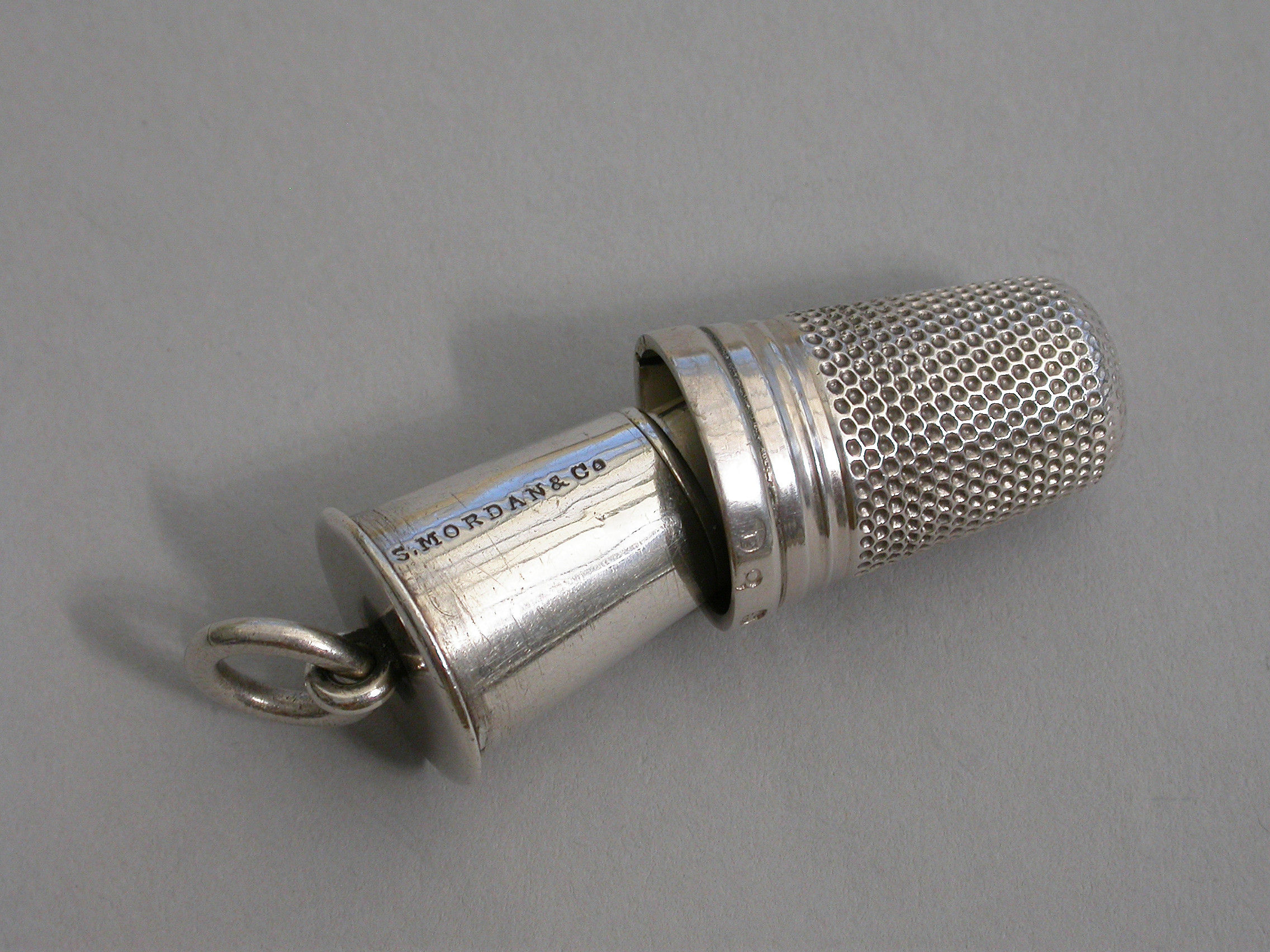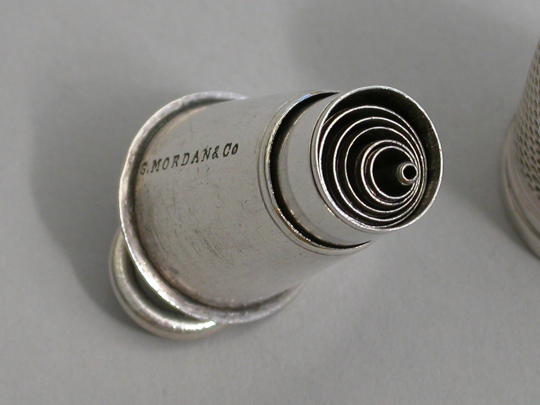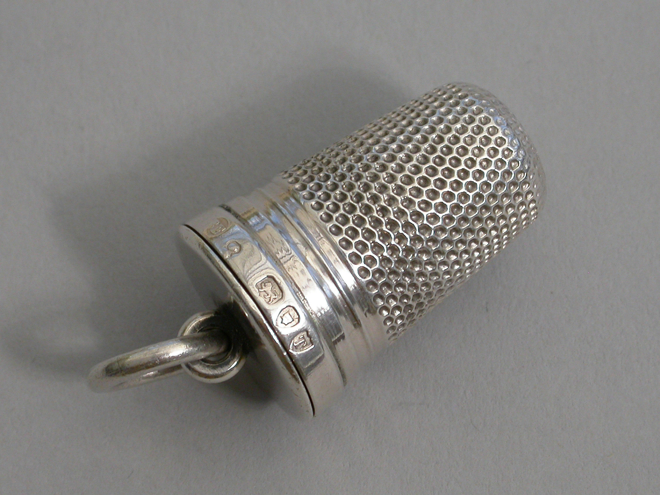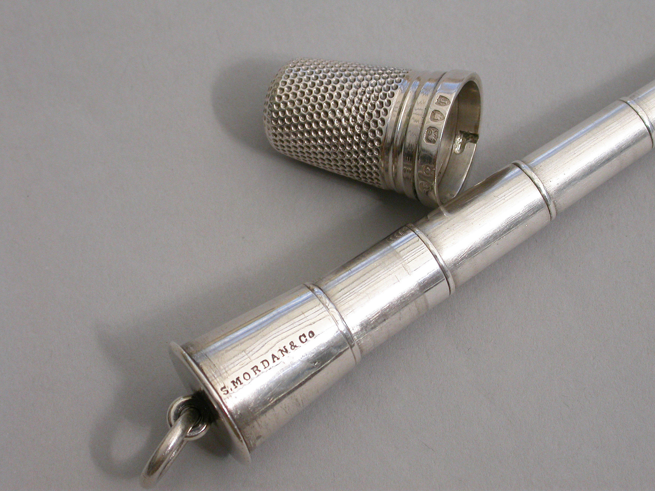 An extremely rare Victorian novelty silver Propelling Pencil with six drawer telescopic action and attached suspension ring, the whole fitting inside a silver thimble when collapsed, a bayonet fitting to secure.