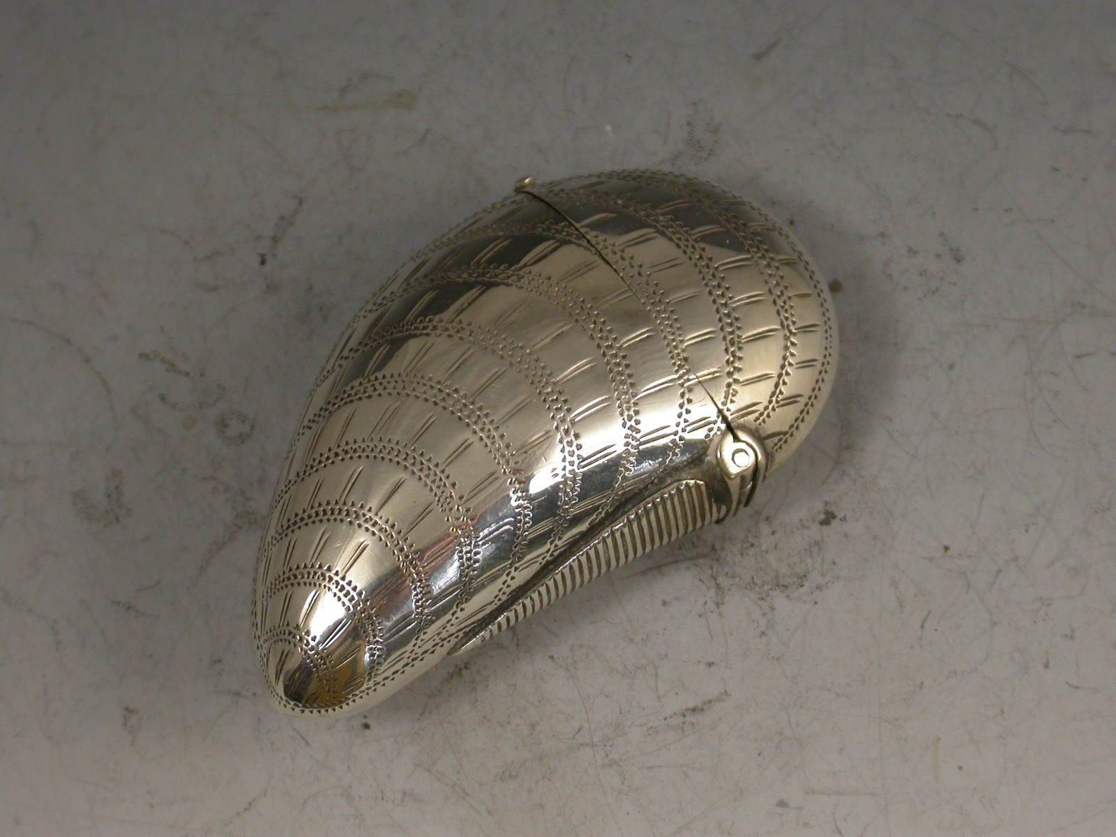 A rare Victorian novelty silver Vesta Case made in the form of a Mussel Shell with hinged flip-top lid and prick-dot engraved decoration to simulate a real shell. Engraved with contemporary initials 'AEC'.