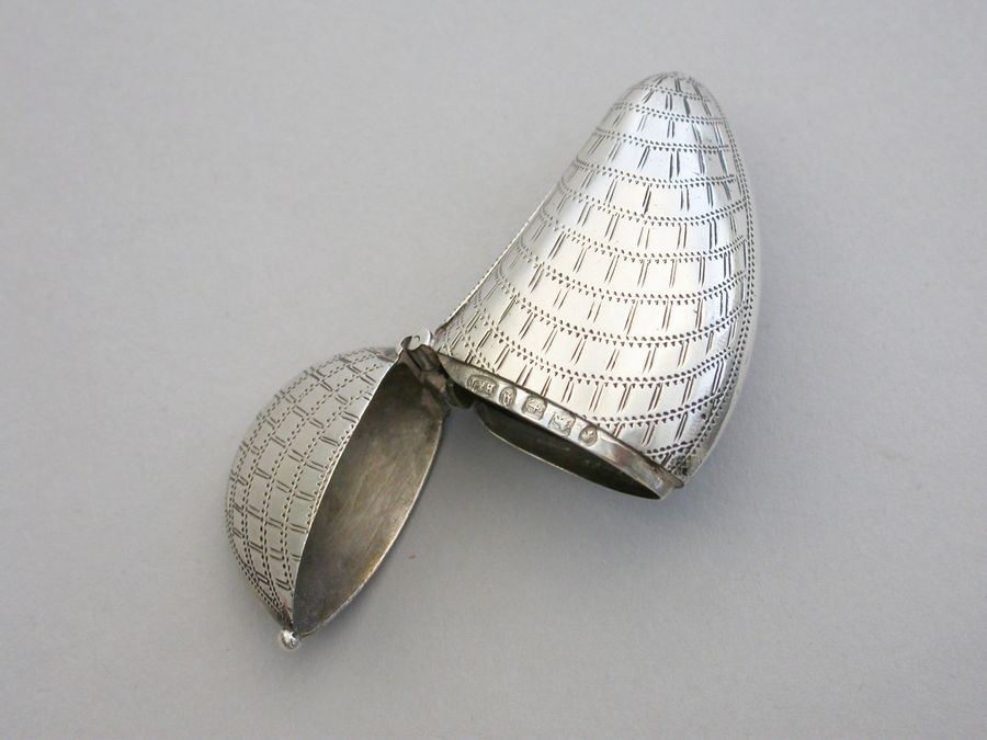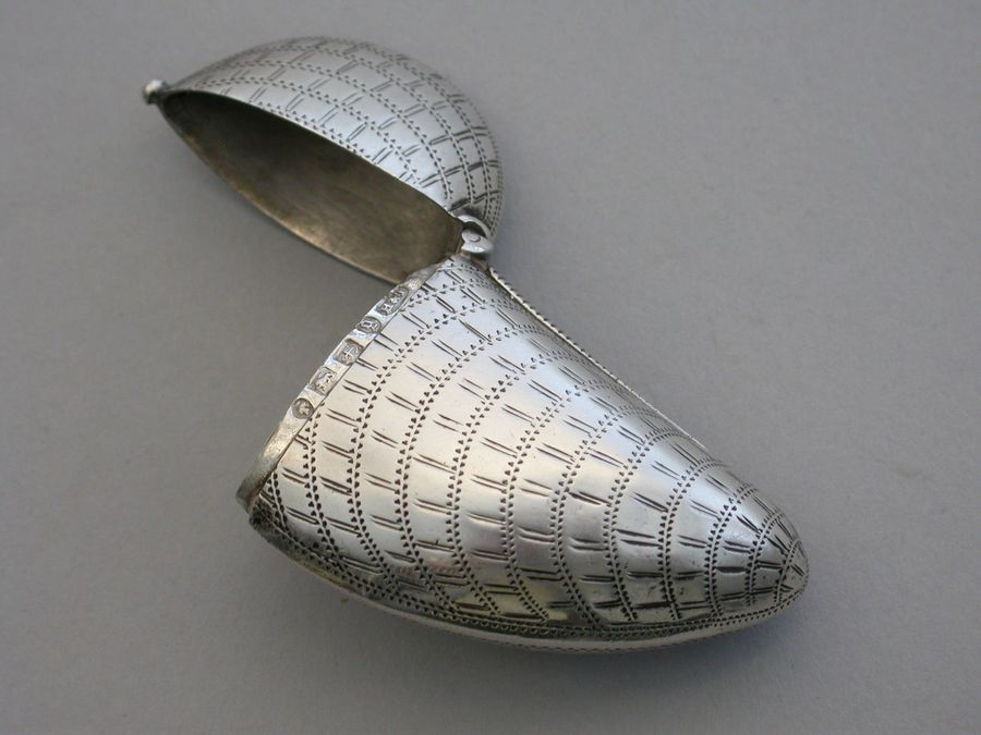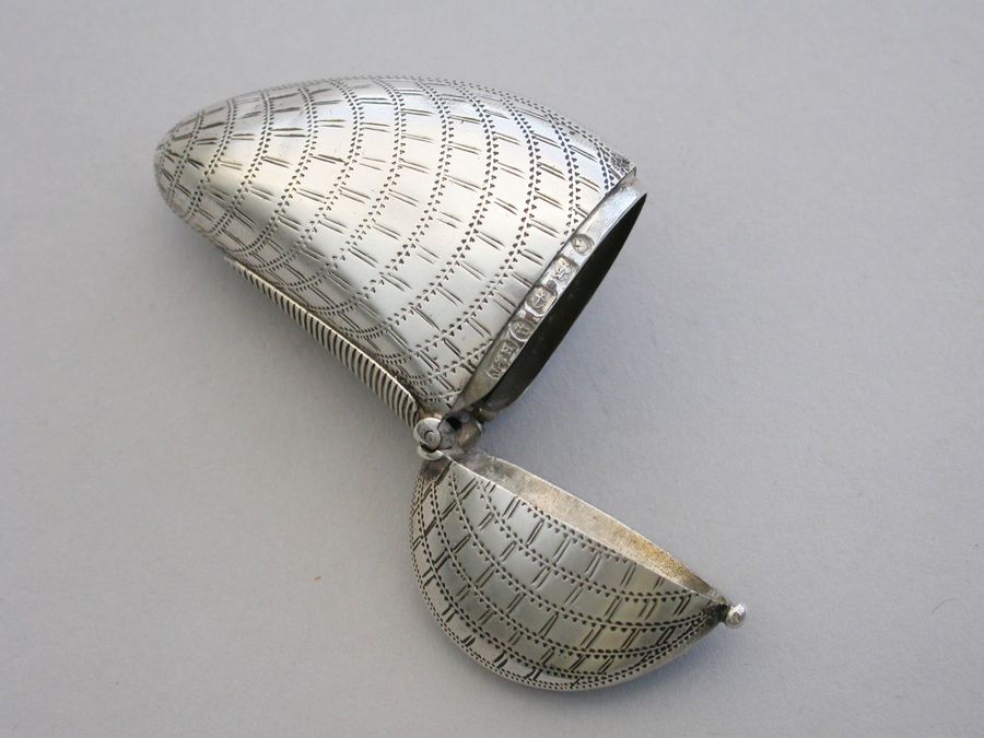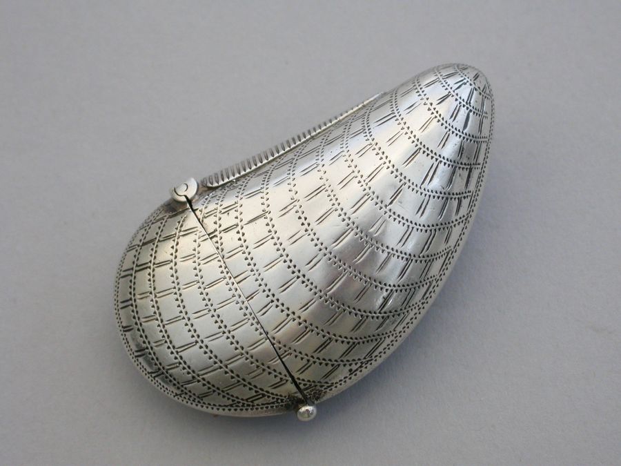 A rare Victorian novelty silver Vesta Case made in the form of a Mussel Shell, with hinged flip-top lid and prick-dot and scratch engraved decoration to simulate a real shell.