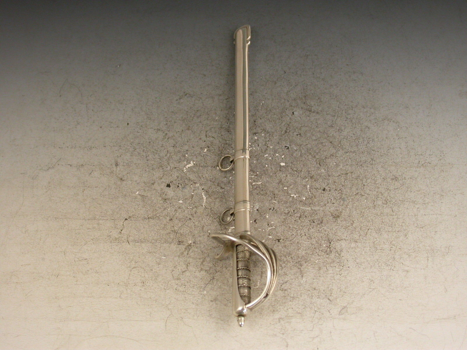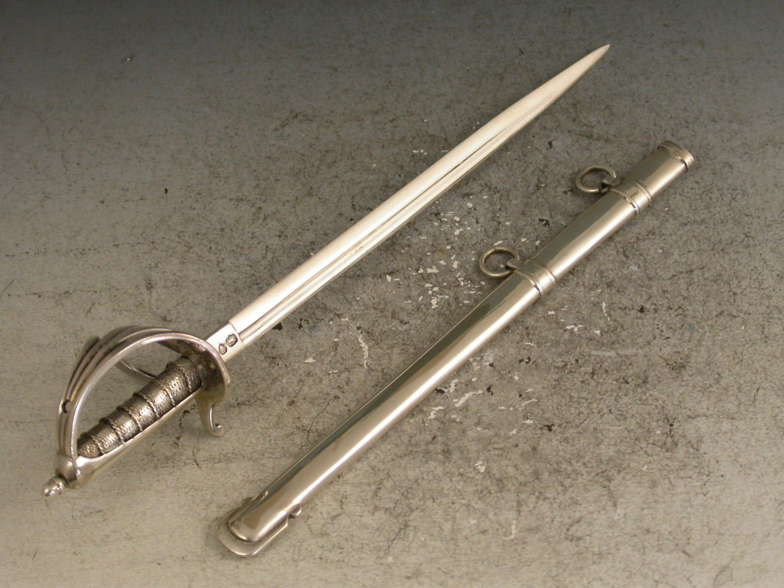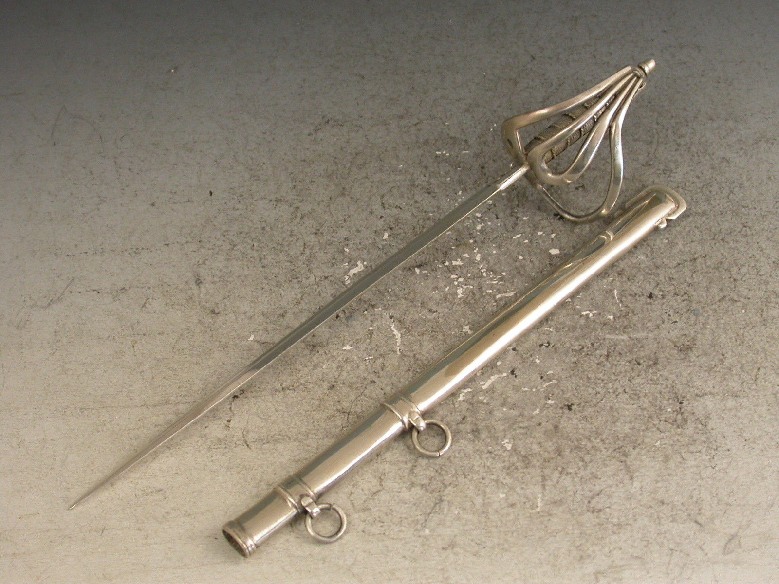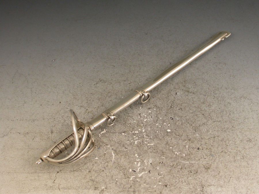 A rare Victorian novelty silver letter opener made in the form of an Officers Dress Sword, complete with scabbard and attached suspension rings.