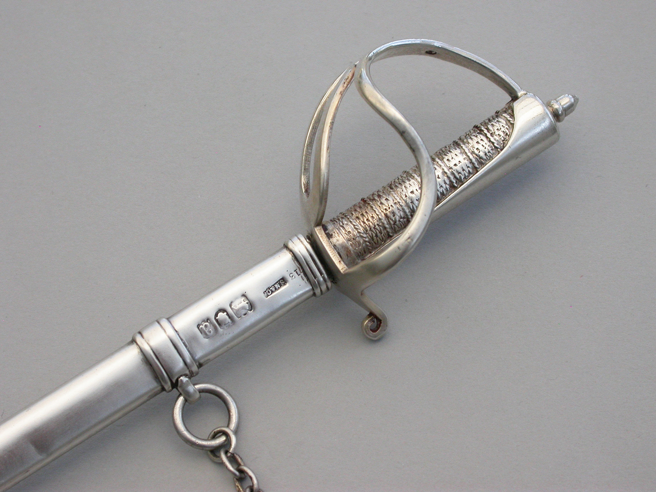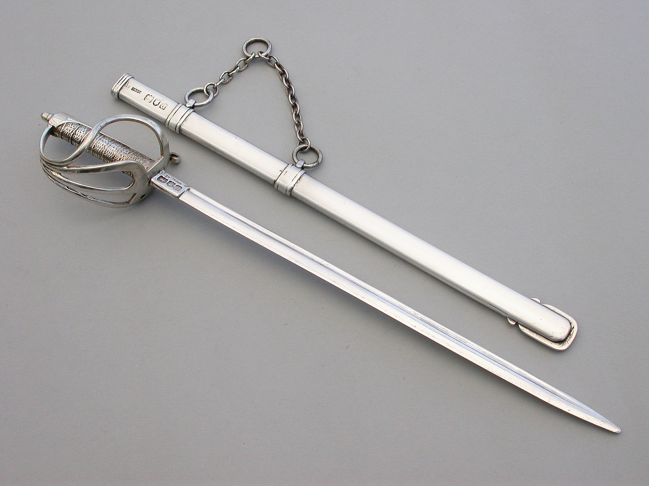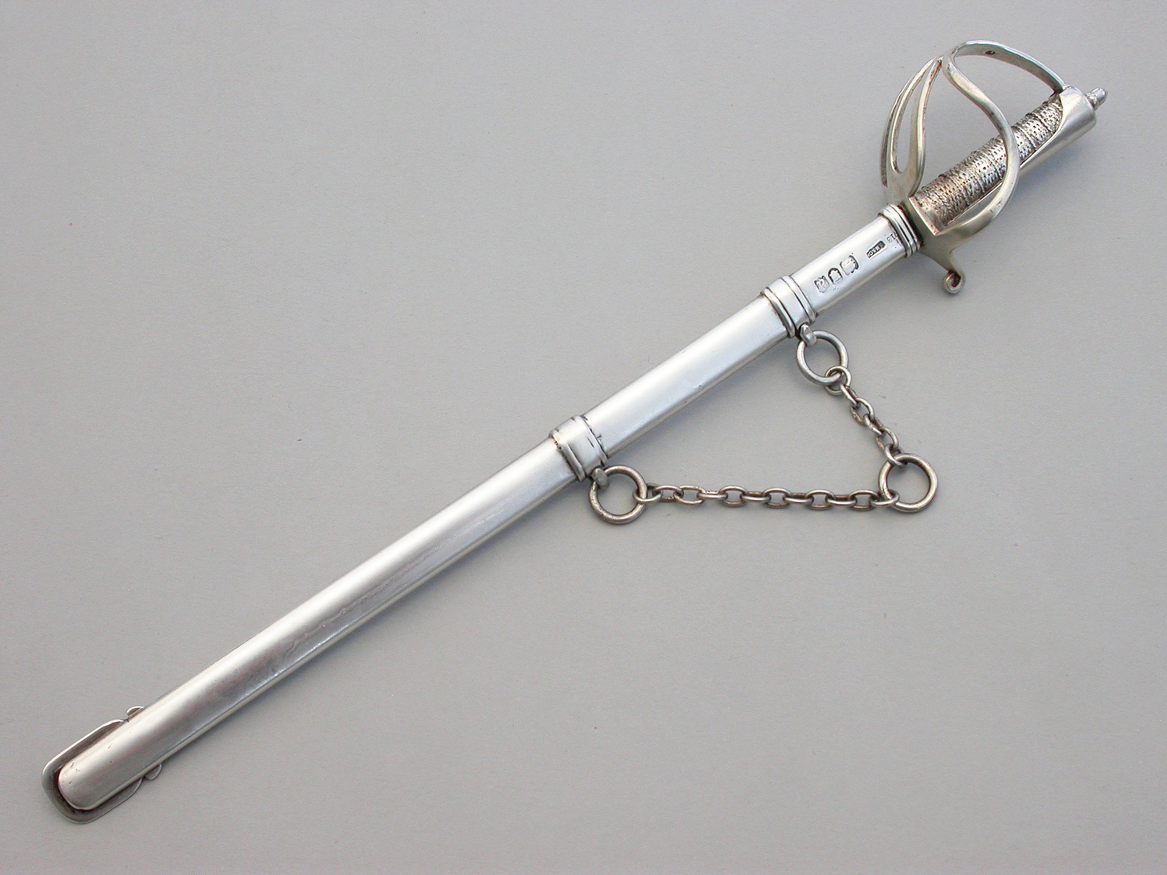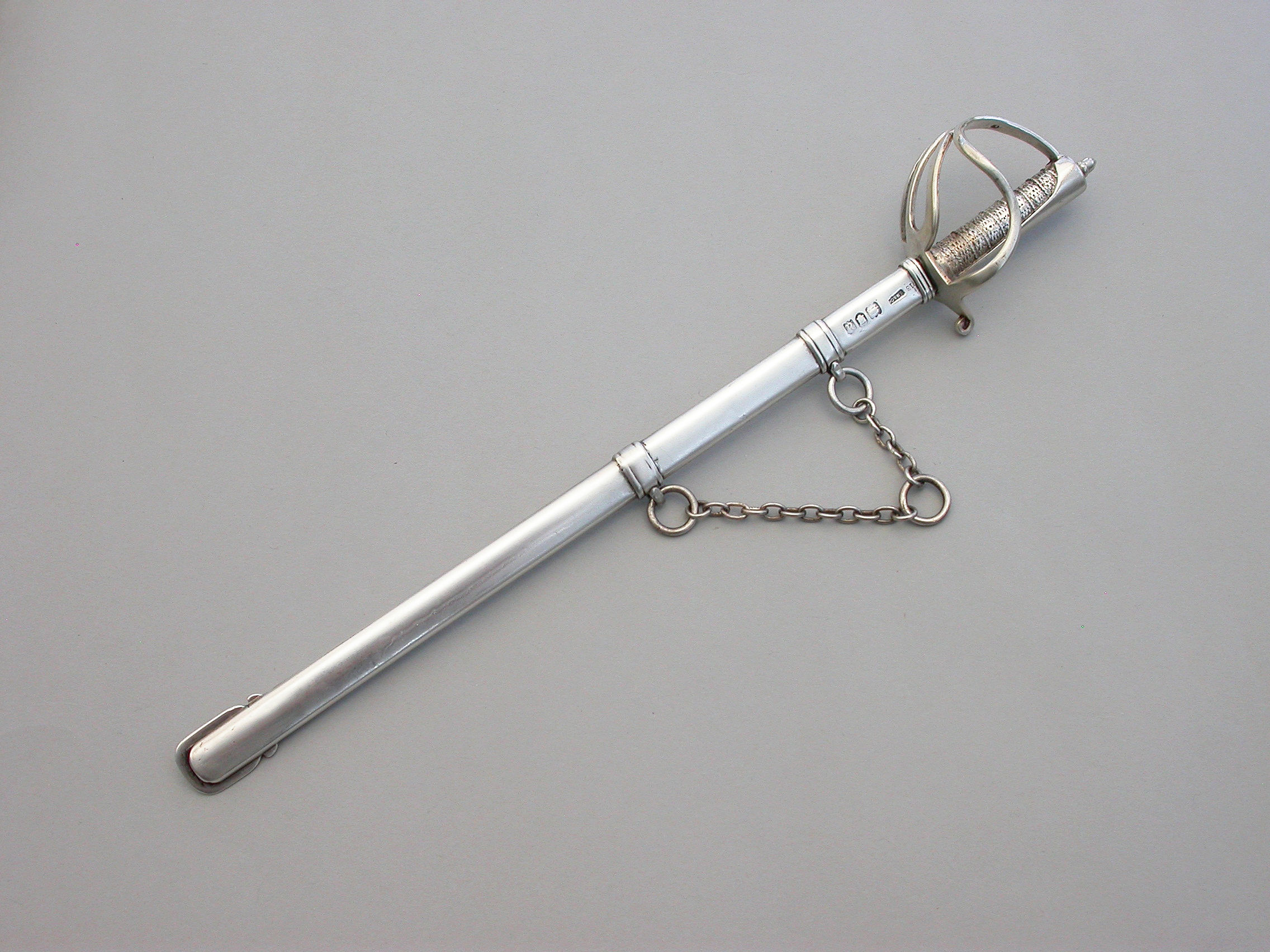 A rare Victorian novelty silver Letter Opener, made in the form of an Officers Dress Sword, complete with scabbard and suspension chain.