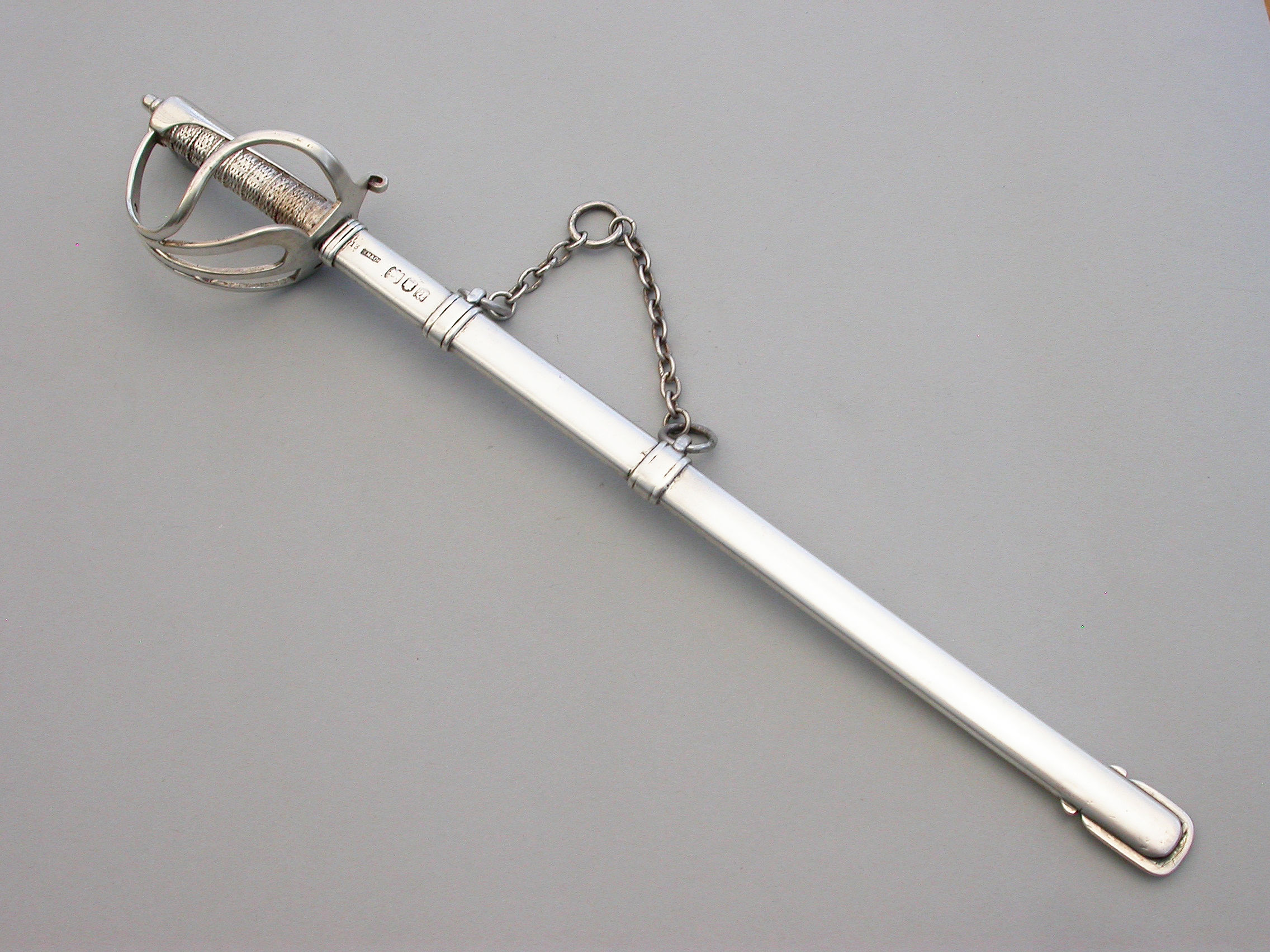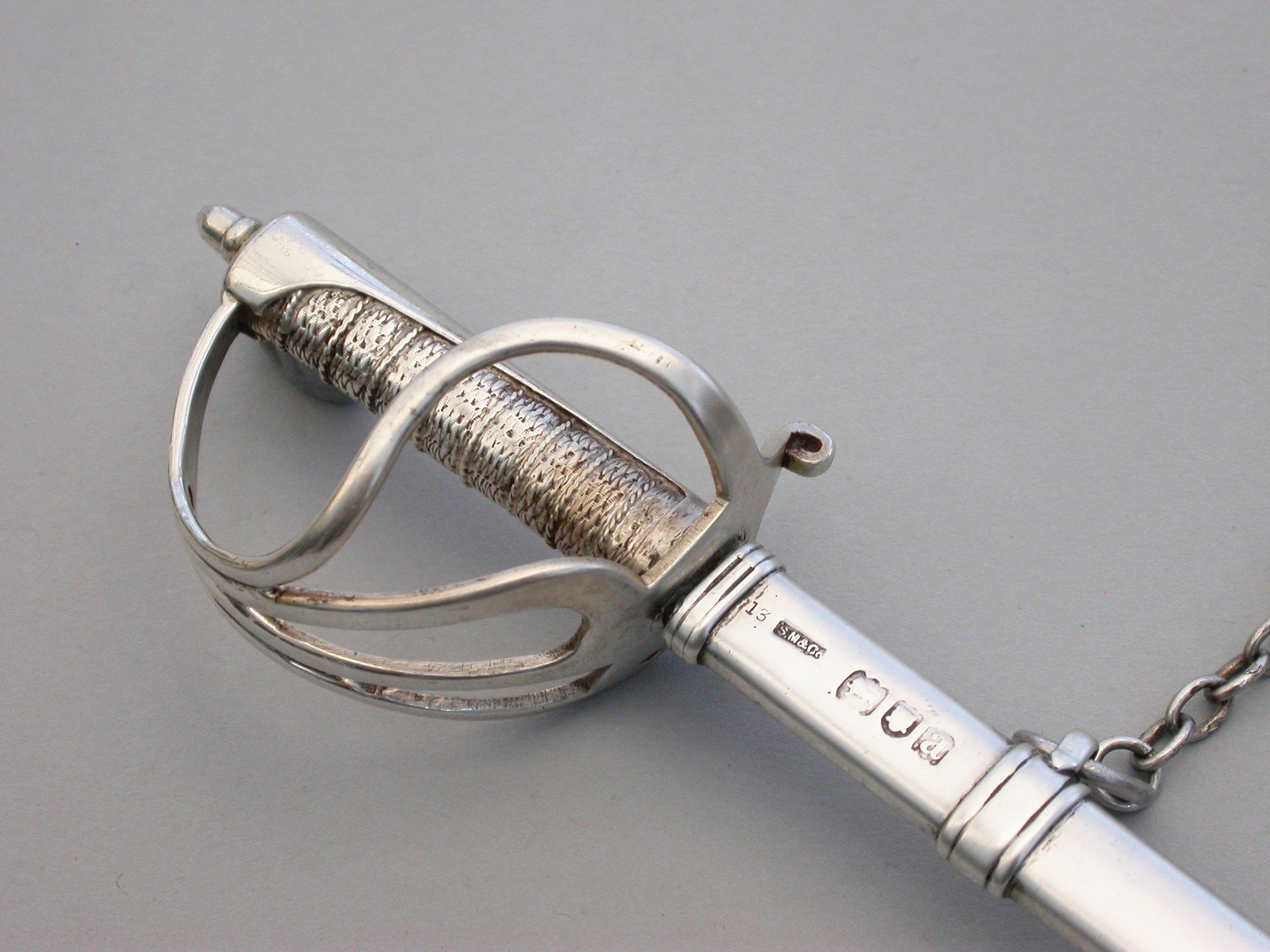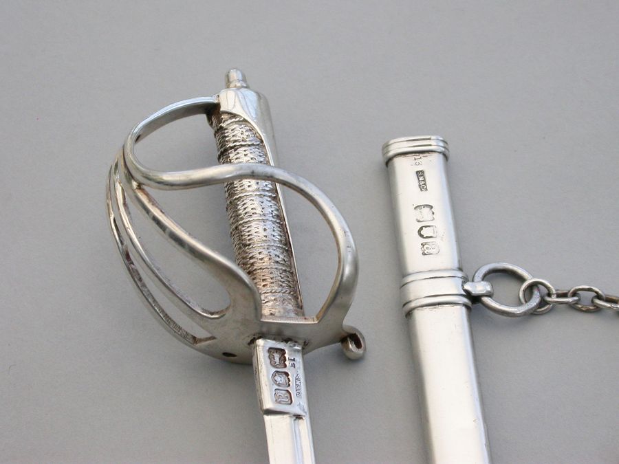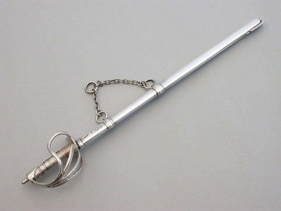 A rare Victorian novelty silver Letter Opener, made in the form of an Officers Dress Sword, complete with scabbard and suspension chain.