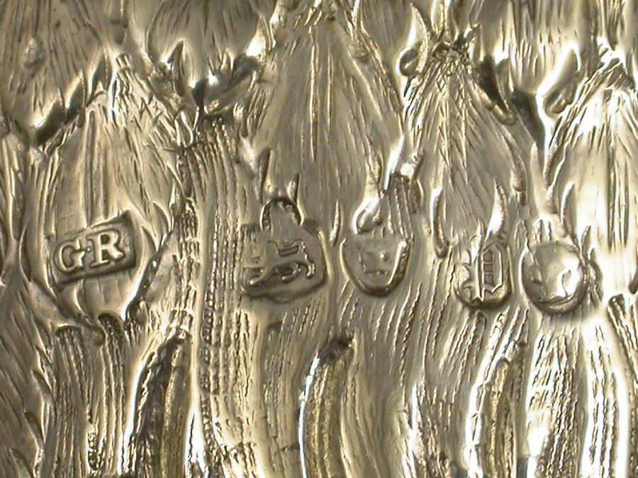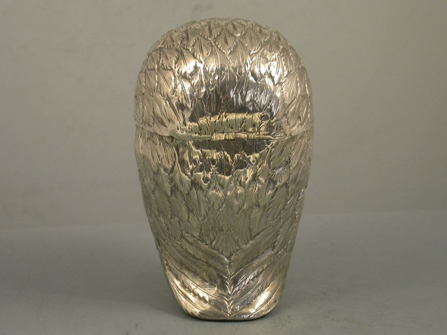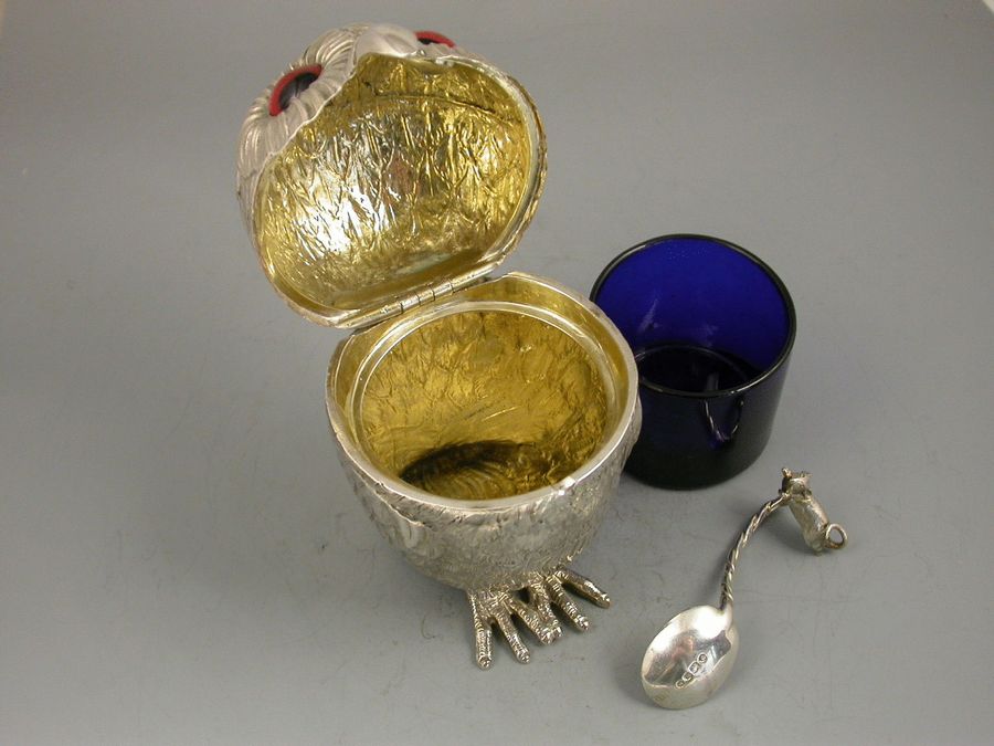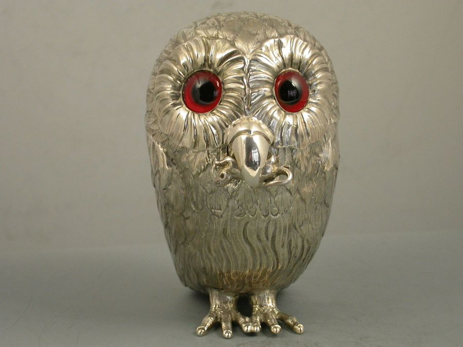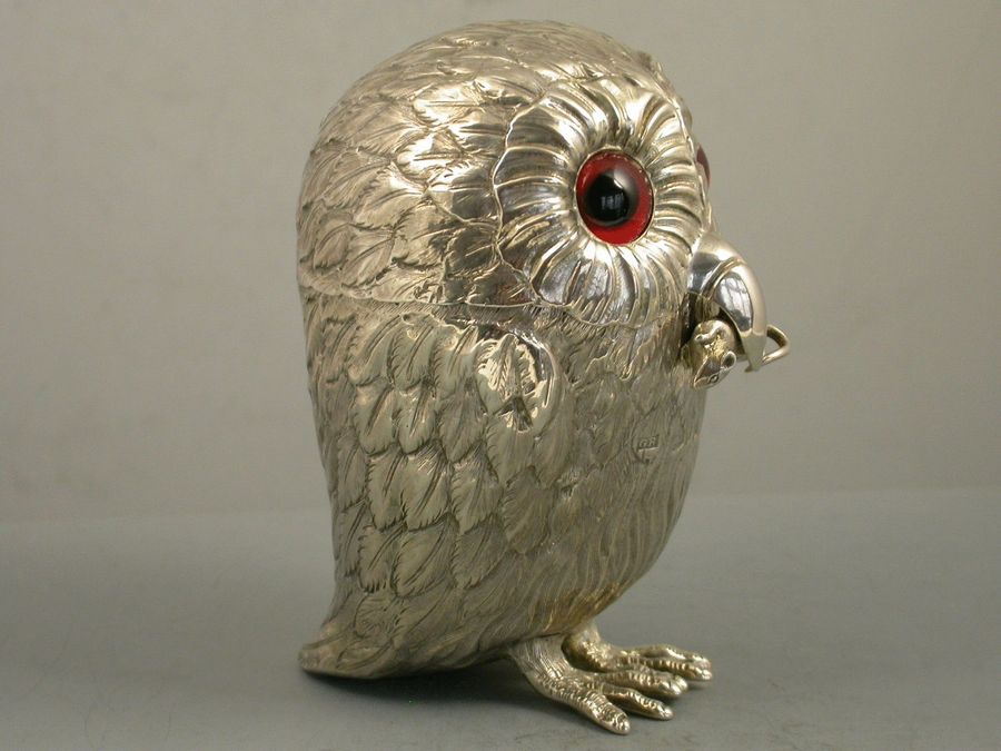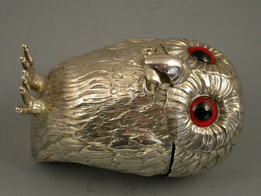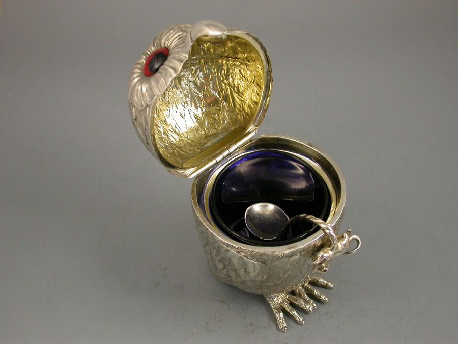 A fine qulaity Victorian novelty silver Mustard Pot in the form of an Owl, with textured plumage, red and black glass eyes and with a matching Spoon with mouse finial held in the owls beak. Hinged lid, silver gilt interior and blue glass liner.