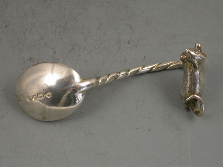 Victorian Novelty Silver Owl Mustard Pot with Mouse Spoon