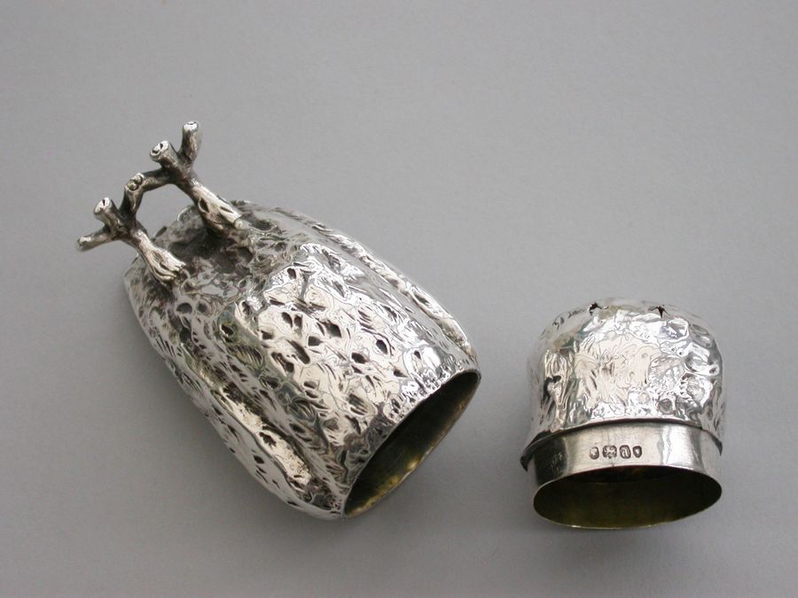 A good Victorian novelty silver Pepper, made in the form of a standing owl with amber glass eyes, pull-off pierced head and silver gilt interior.