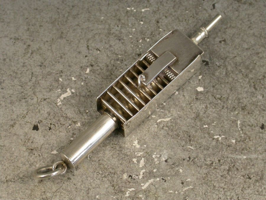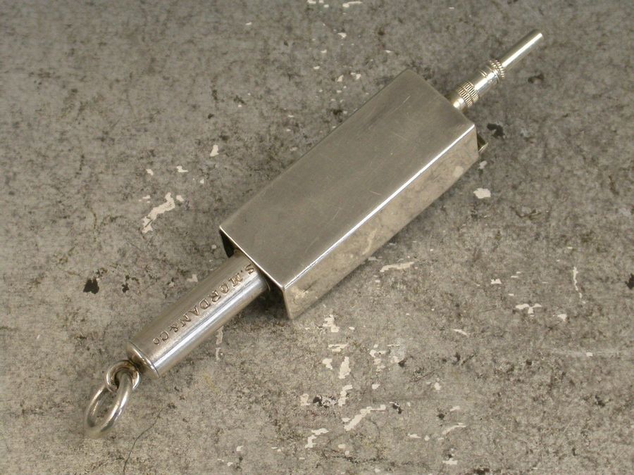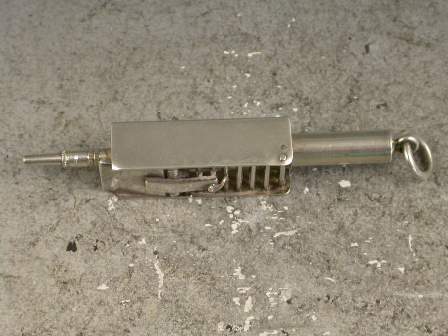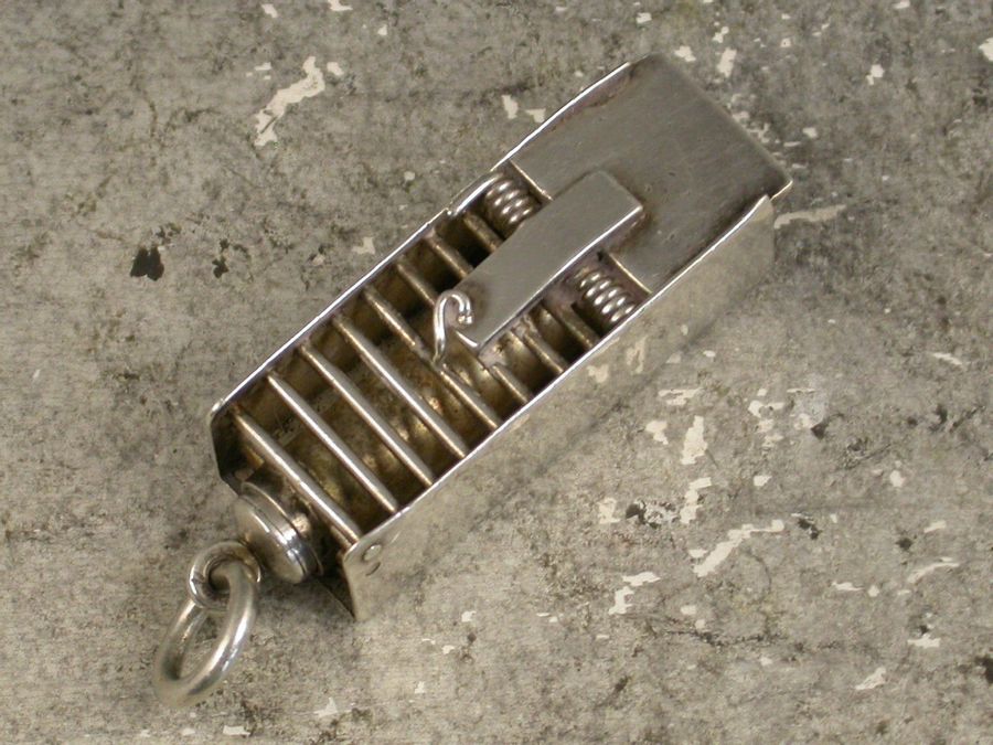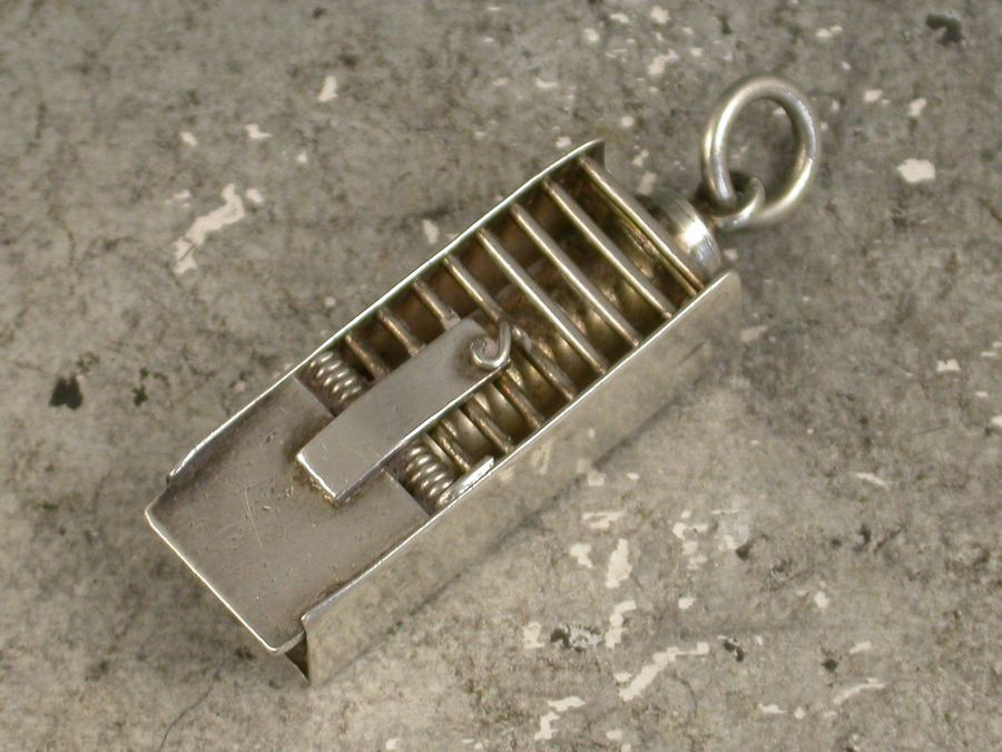 An extremely rare Victorian novelty silver telescopic Propelling Pencil formed as a Penny Mouse Trap, attached suspension ring.