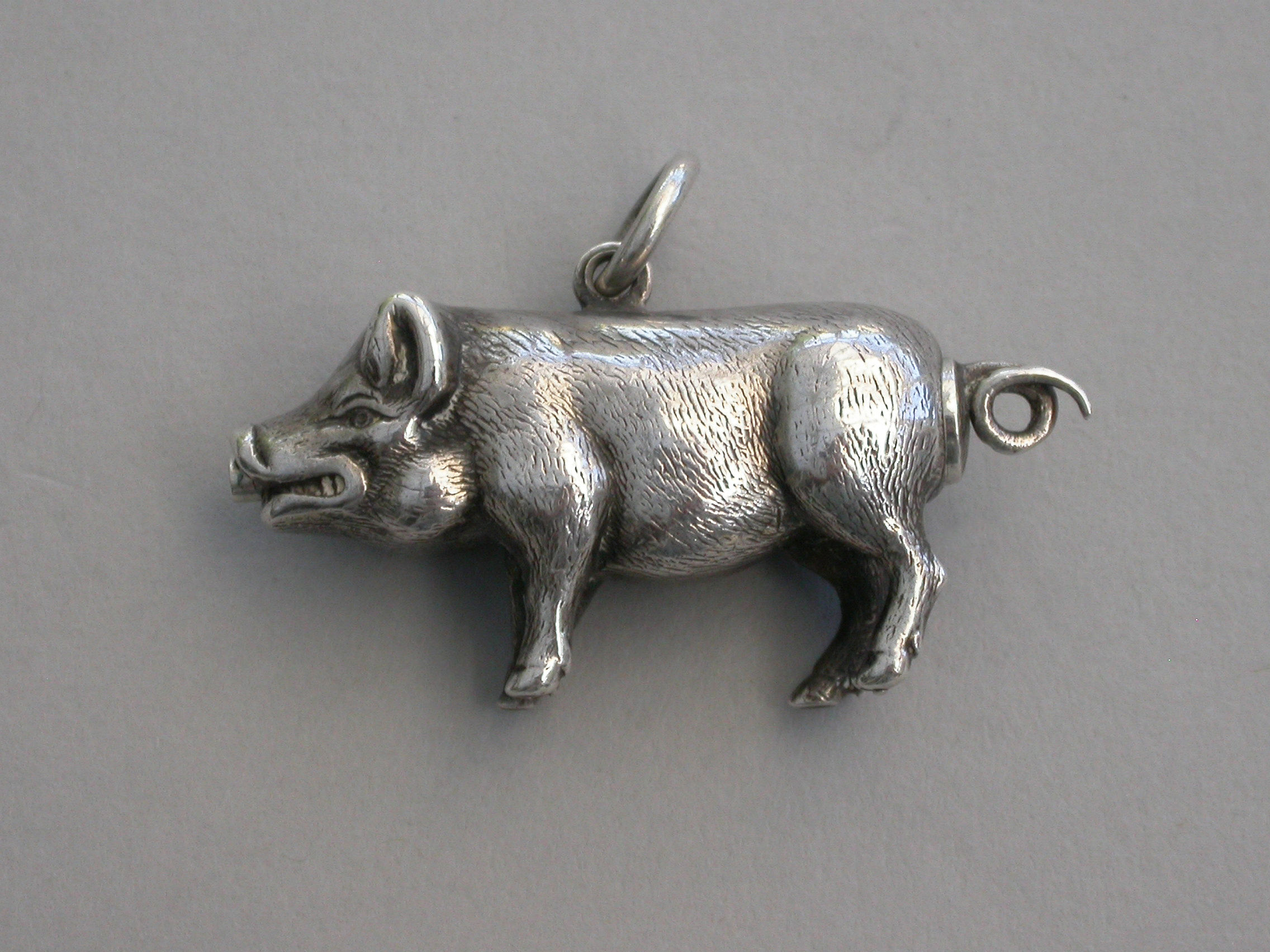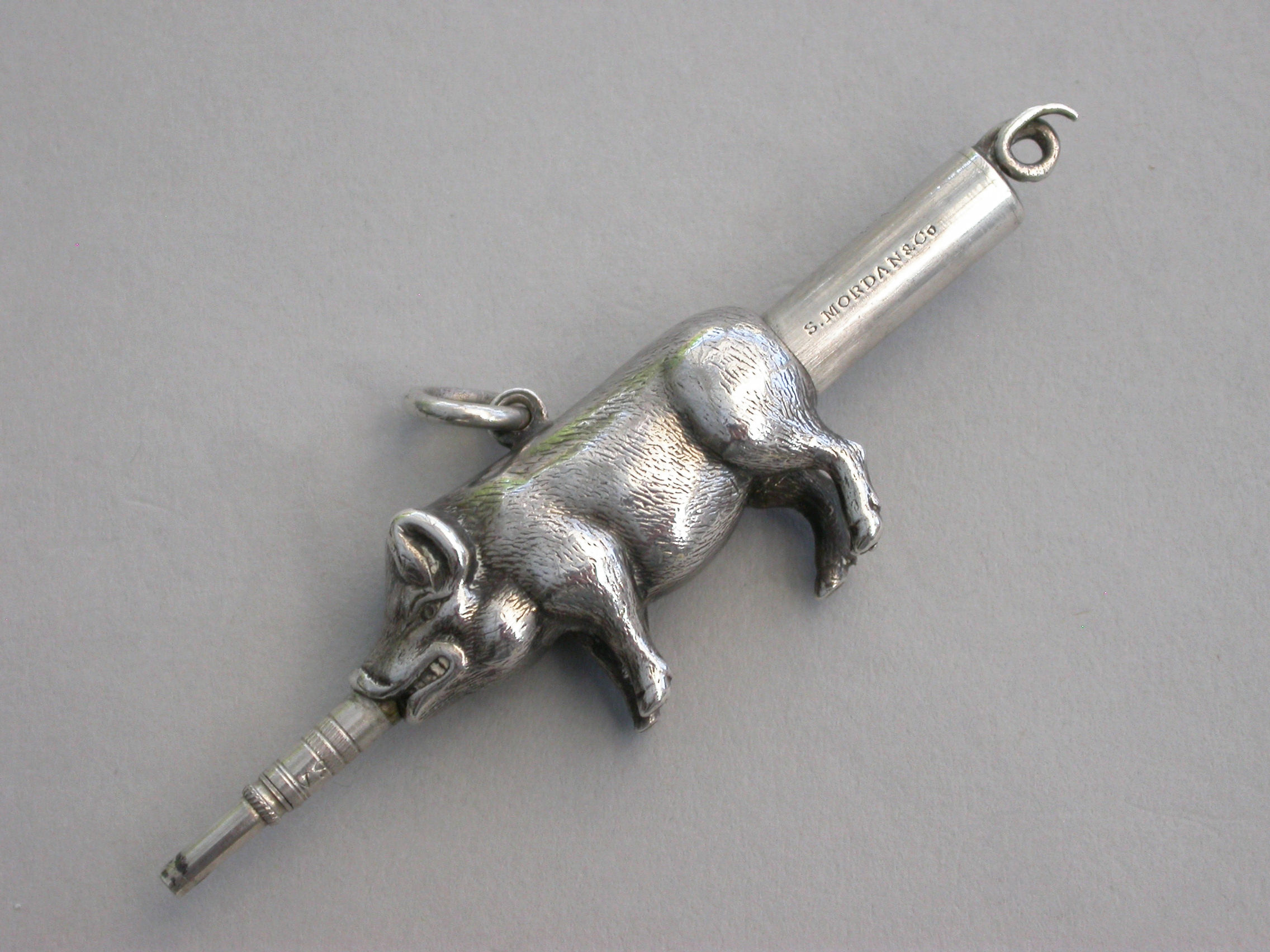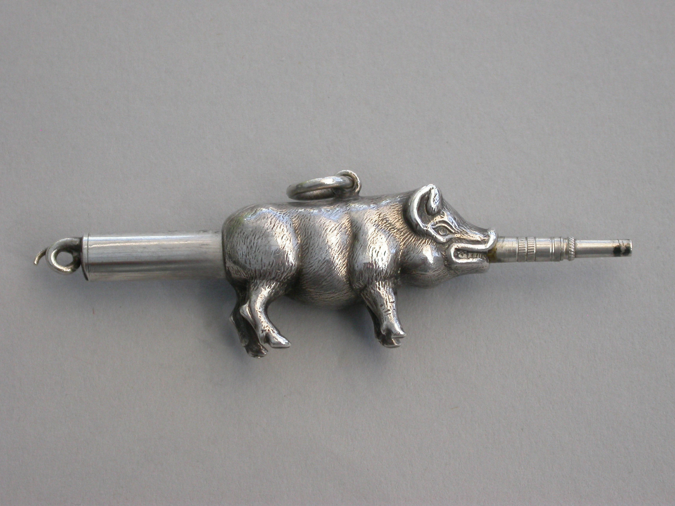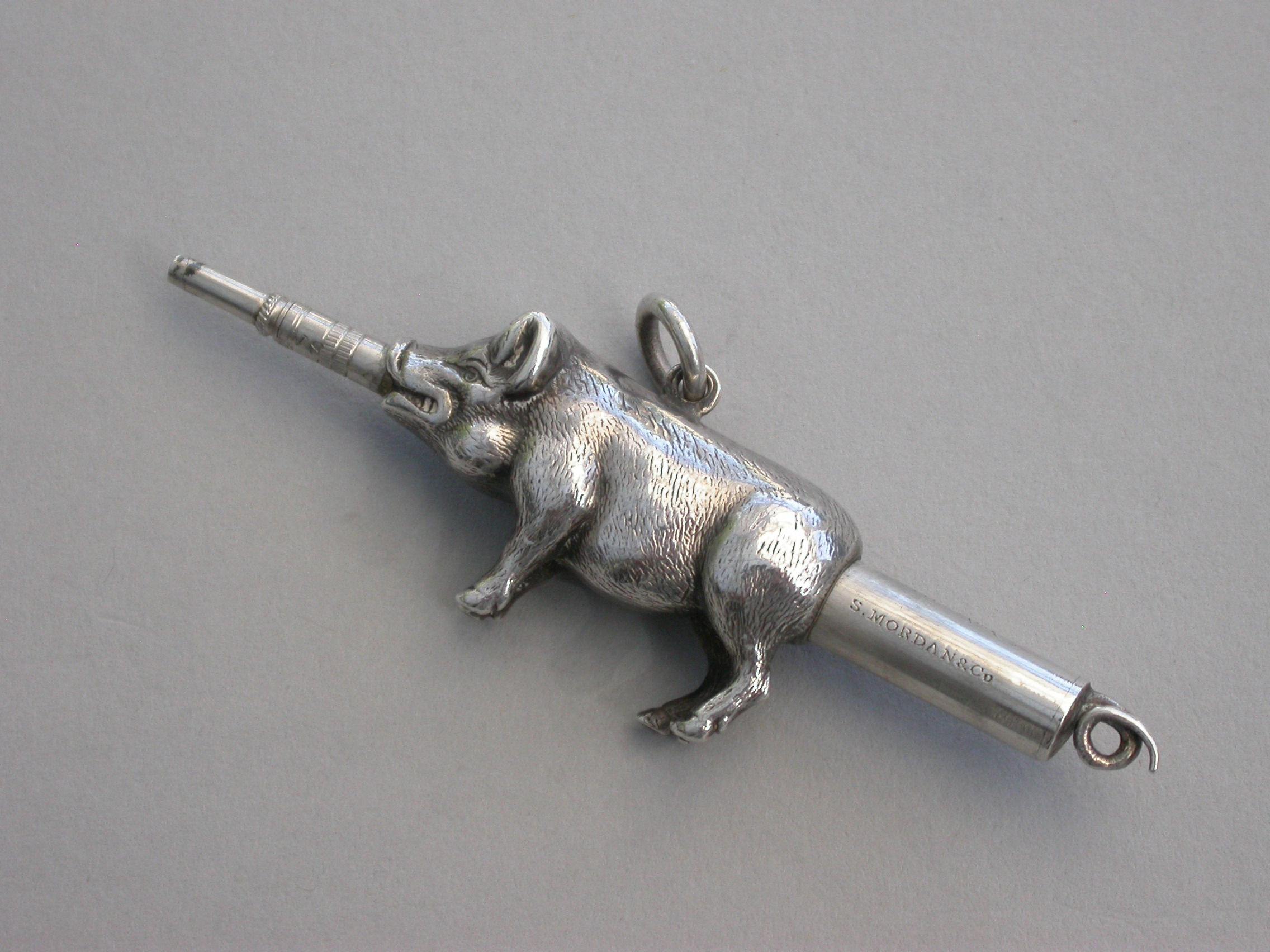 A rare Victorian novelty silver Propelling Pencil made in the form of a Pig, with attached suspension ring.
