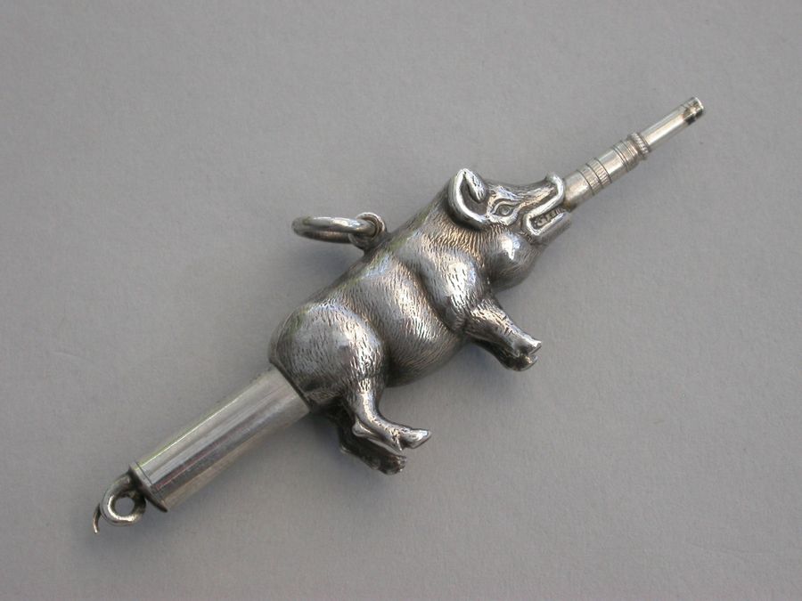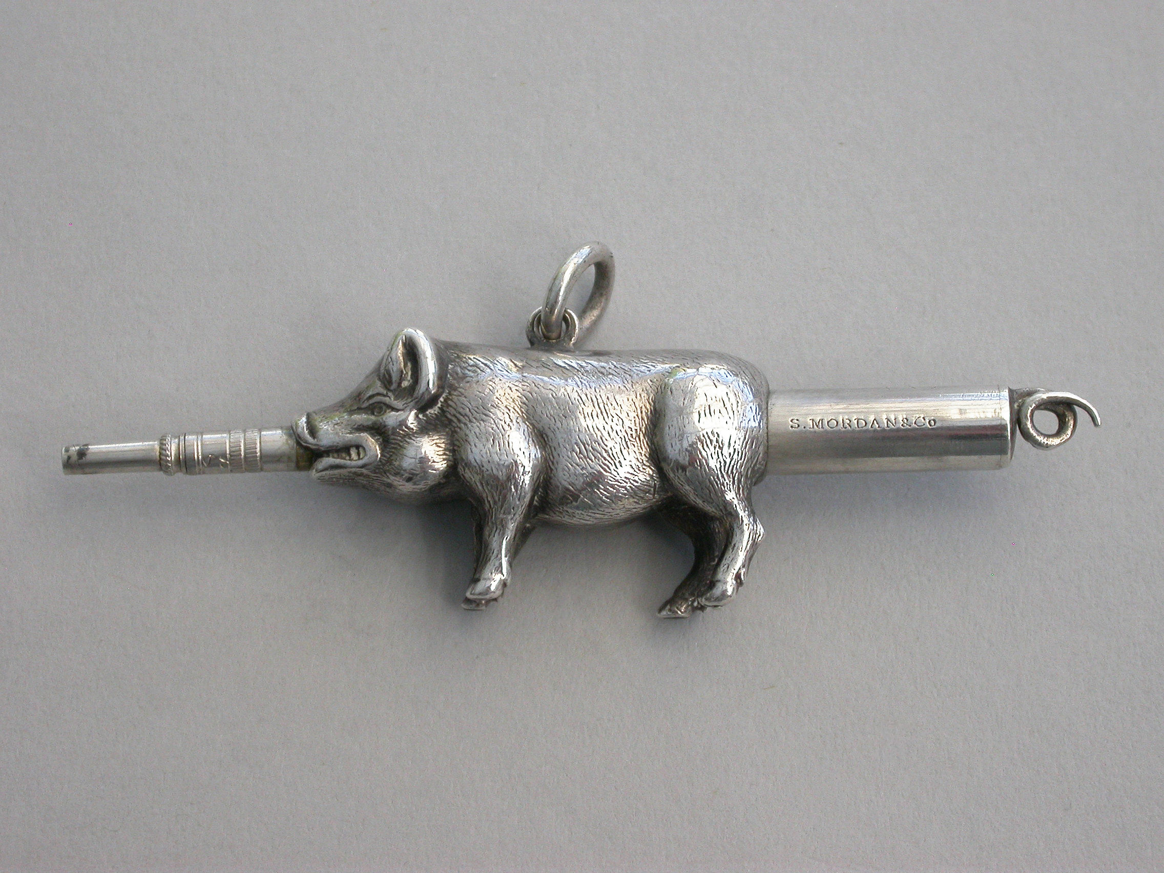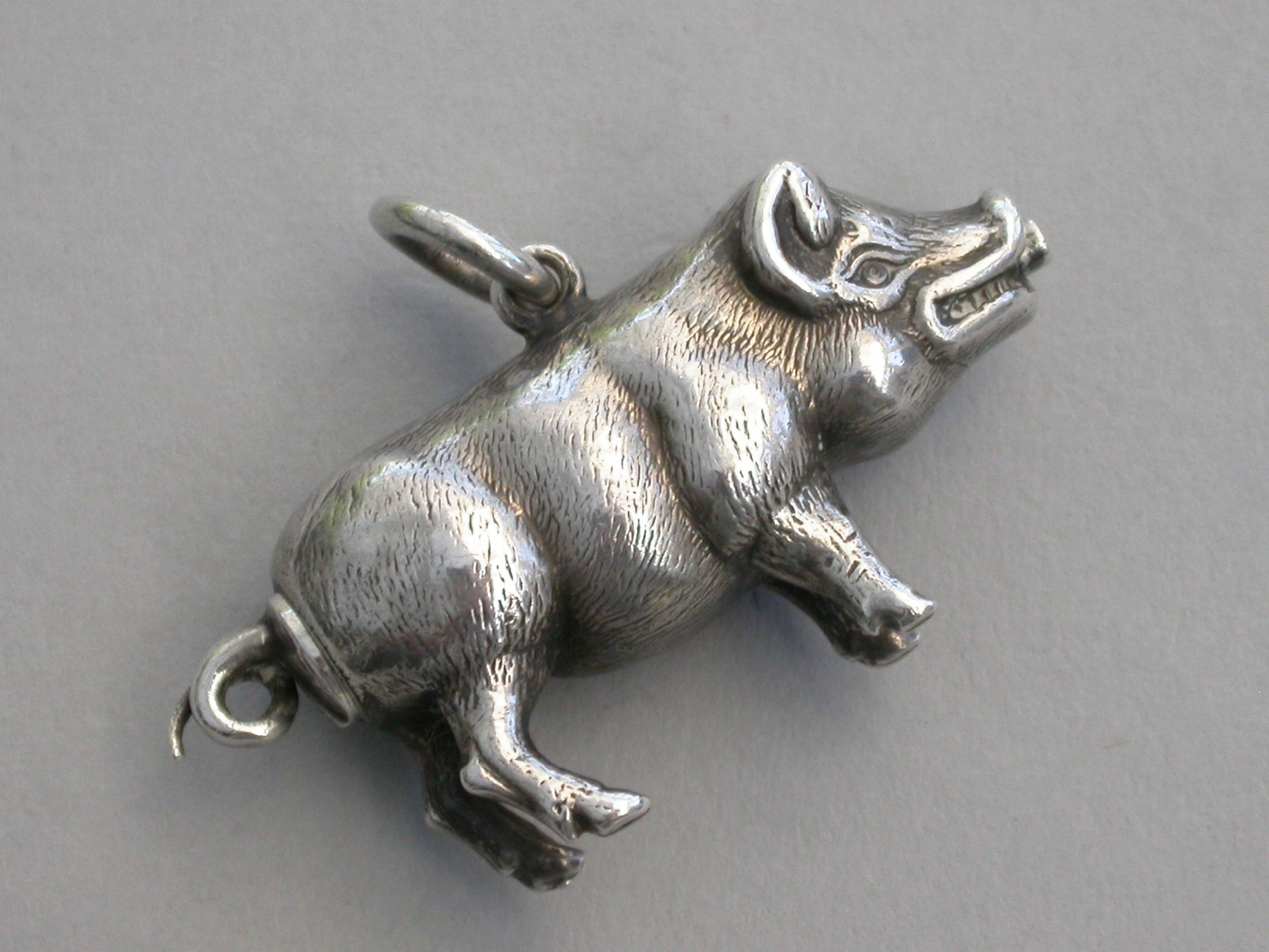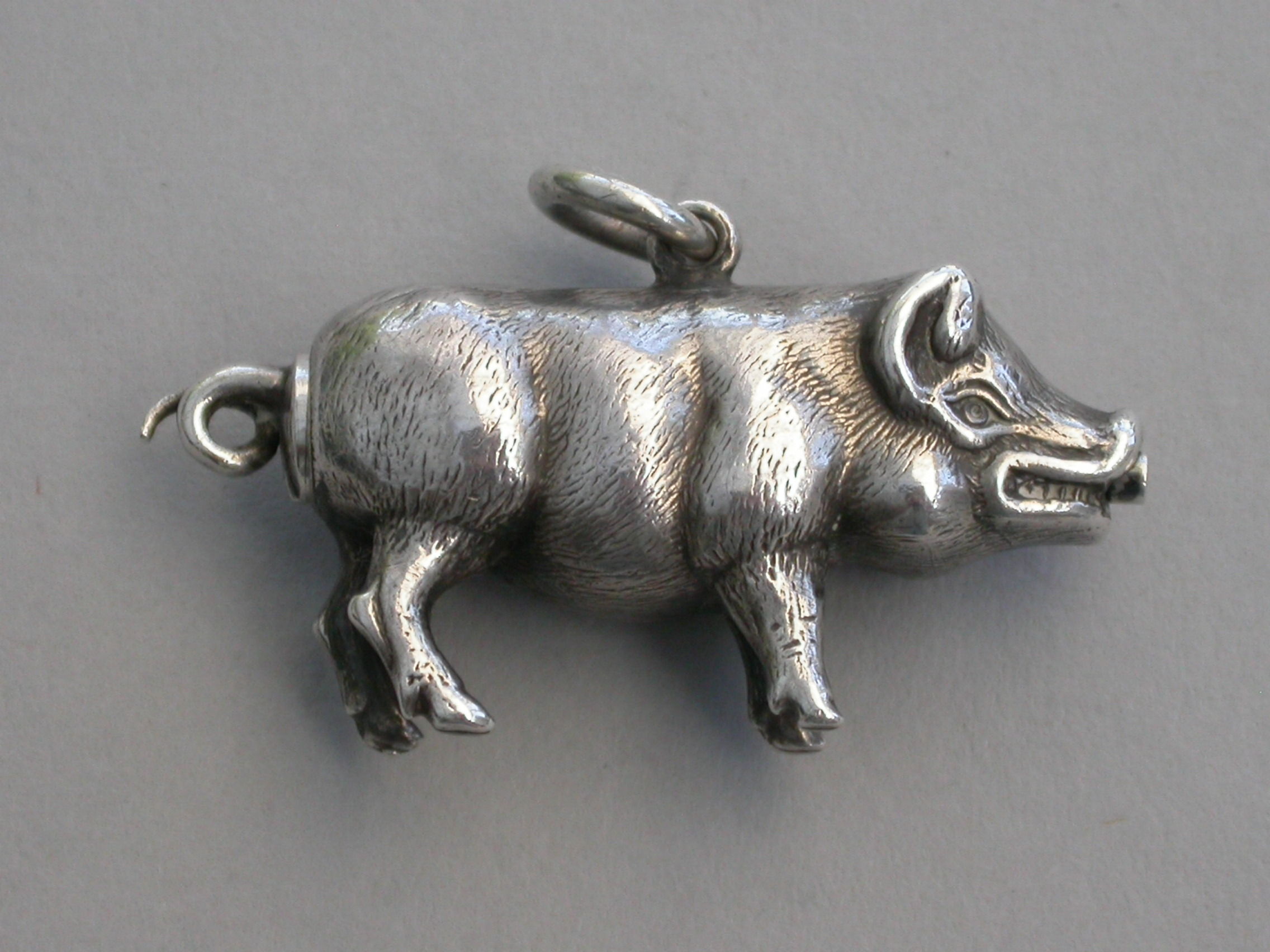 A rare Victorian novelty silver Propelling Pencil made in the form of a Pig, with attached suspension ring.