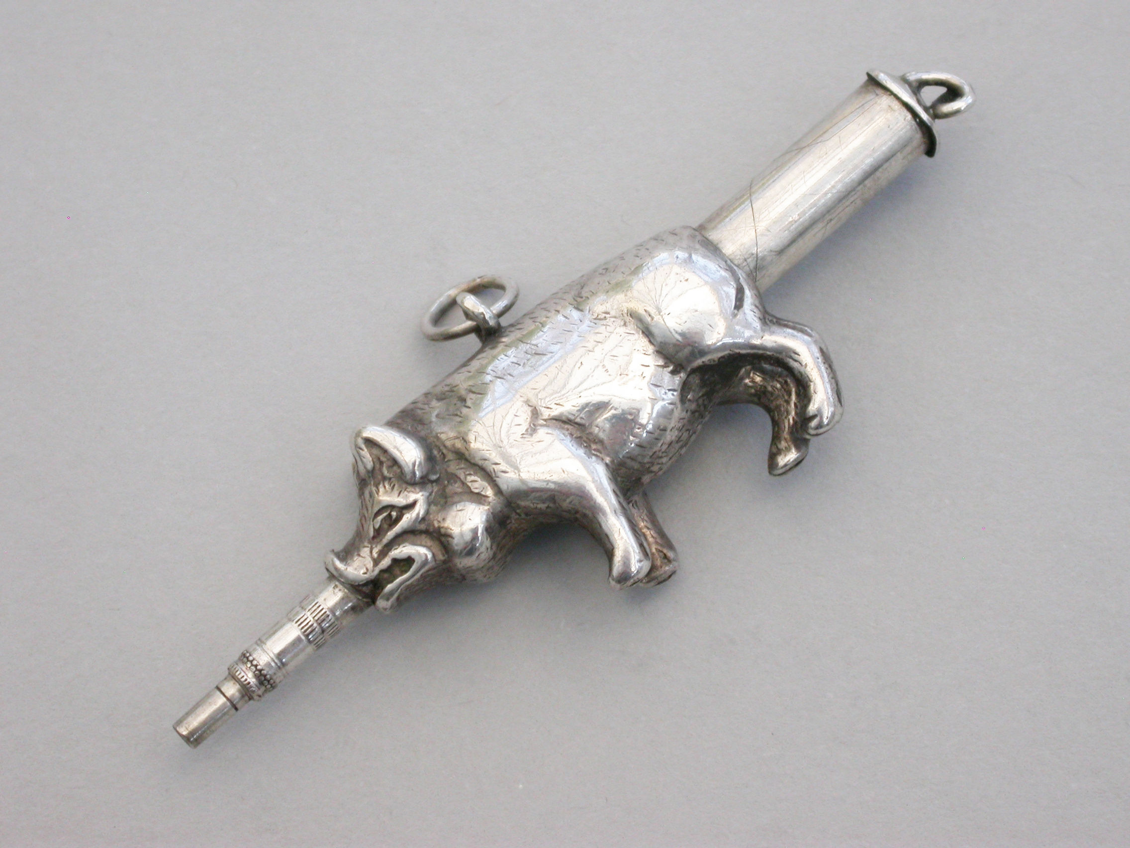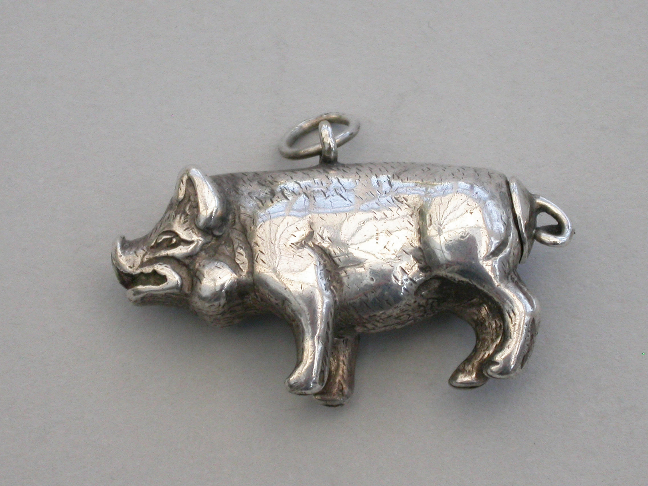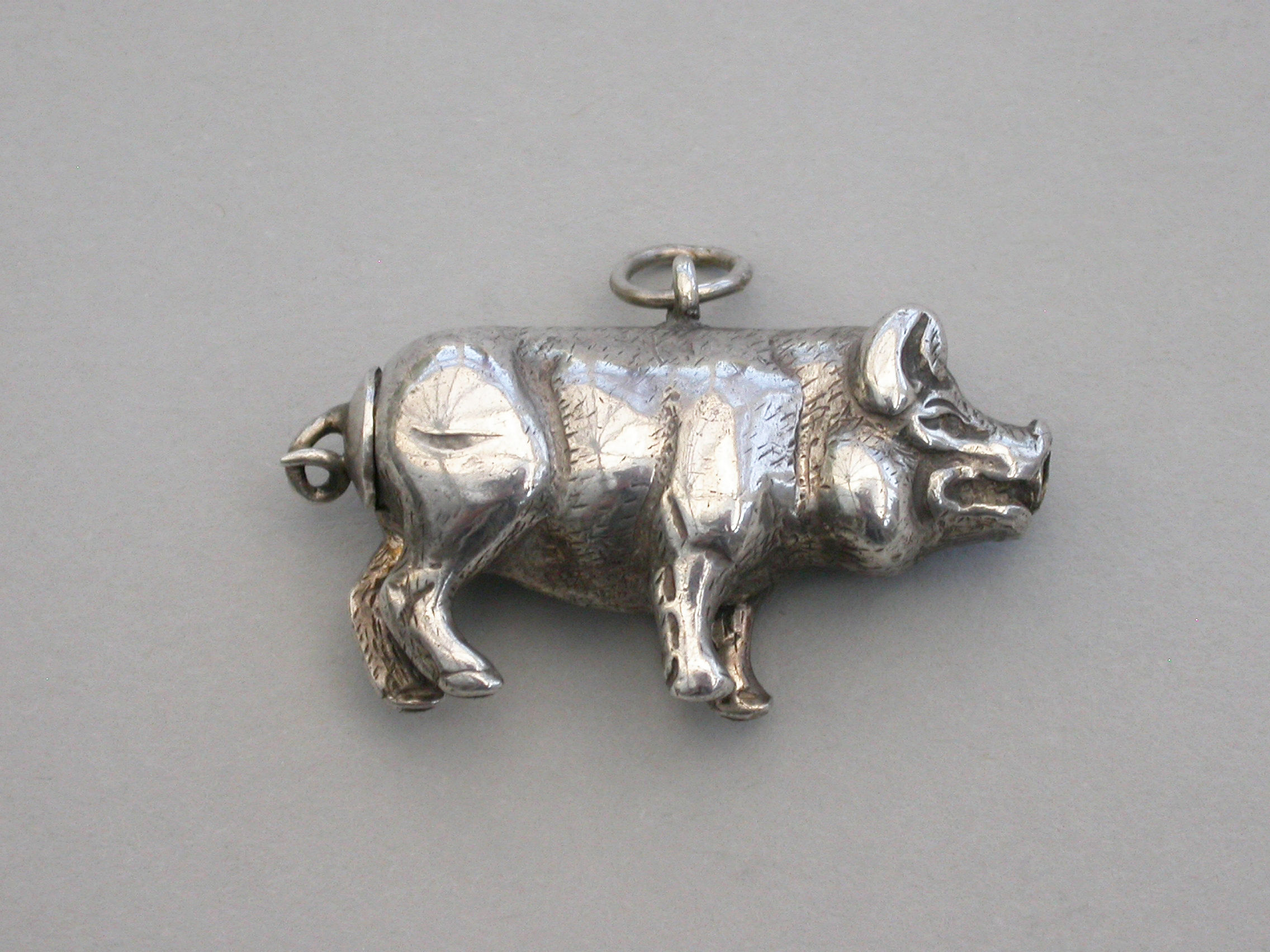 A rare Victorian novelty silver Propelling Pencil, made in the form of a Pig, with attached suspension ring.