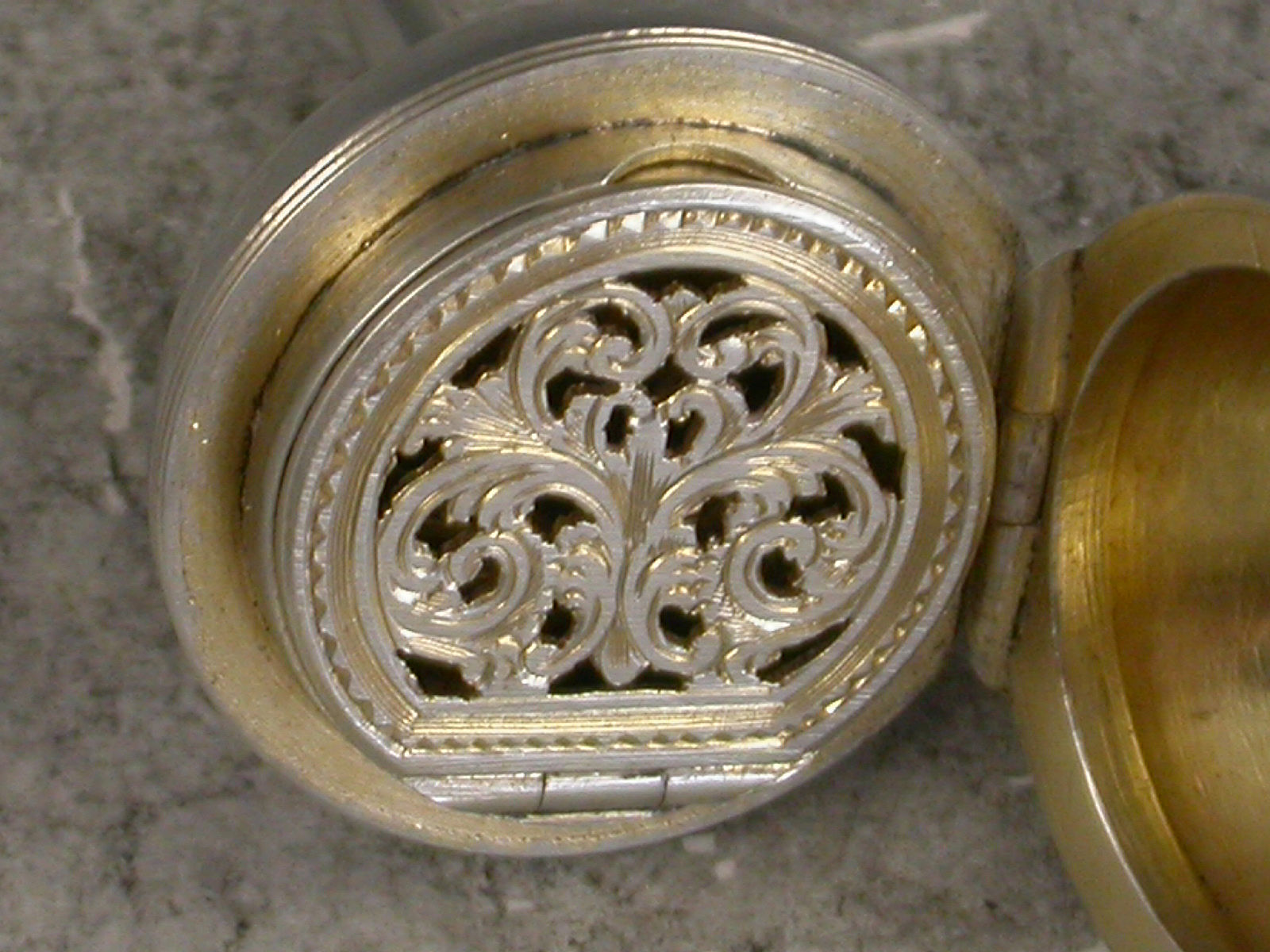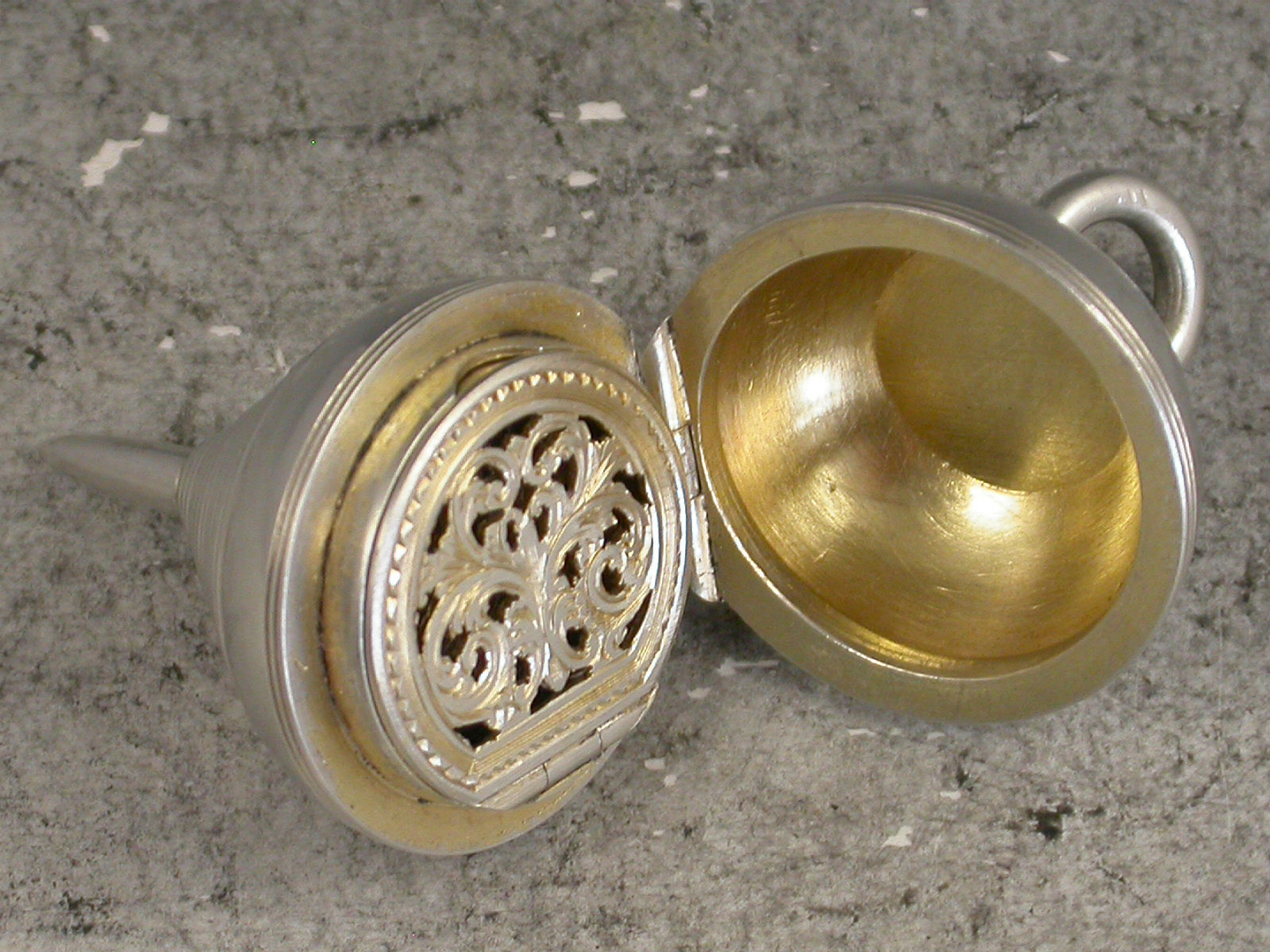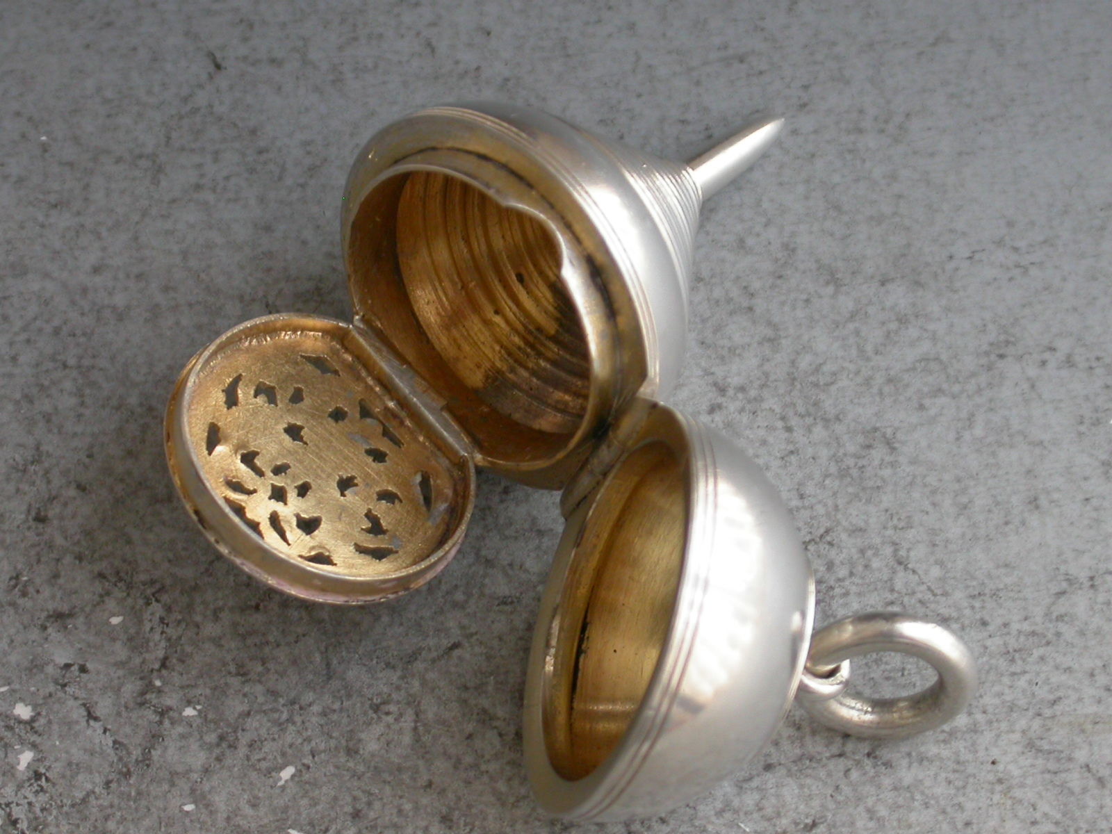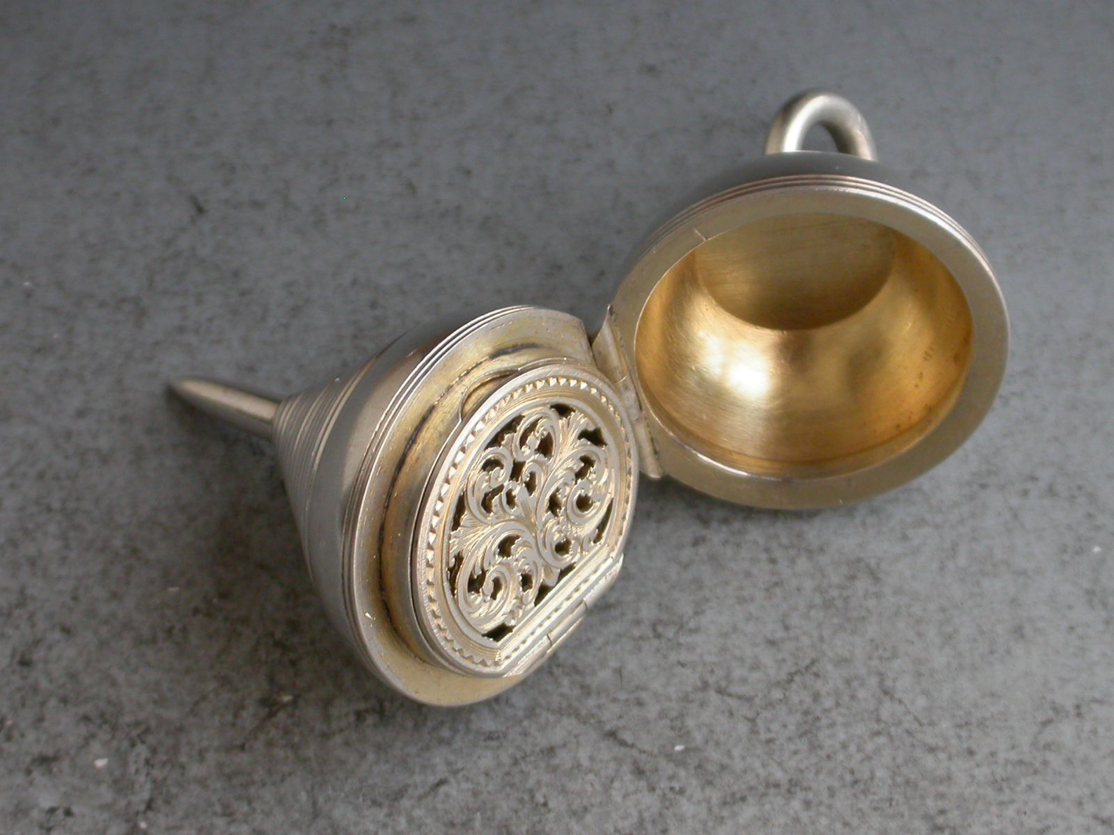 A rare Victorian novelty silver Vinaigrette made in the form of a Plumb Bob or a child's Spinning Peg Top, the hinged cover opening to reveal a silver gilt vinaigrette with foliate scroll pierced hinged grille. Attached suspension ring.
