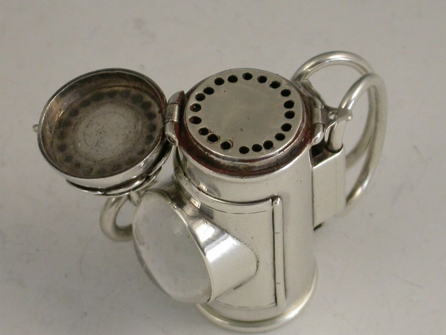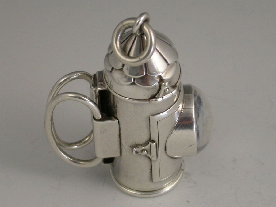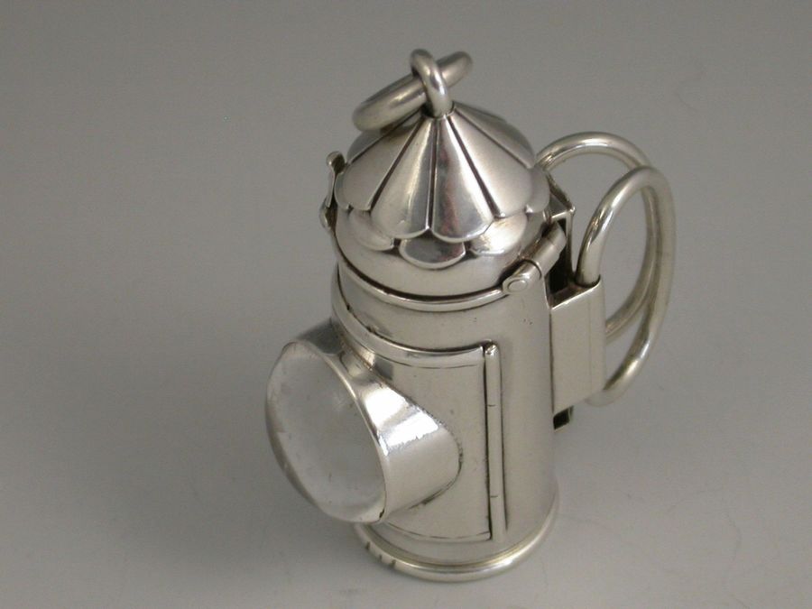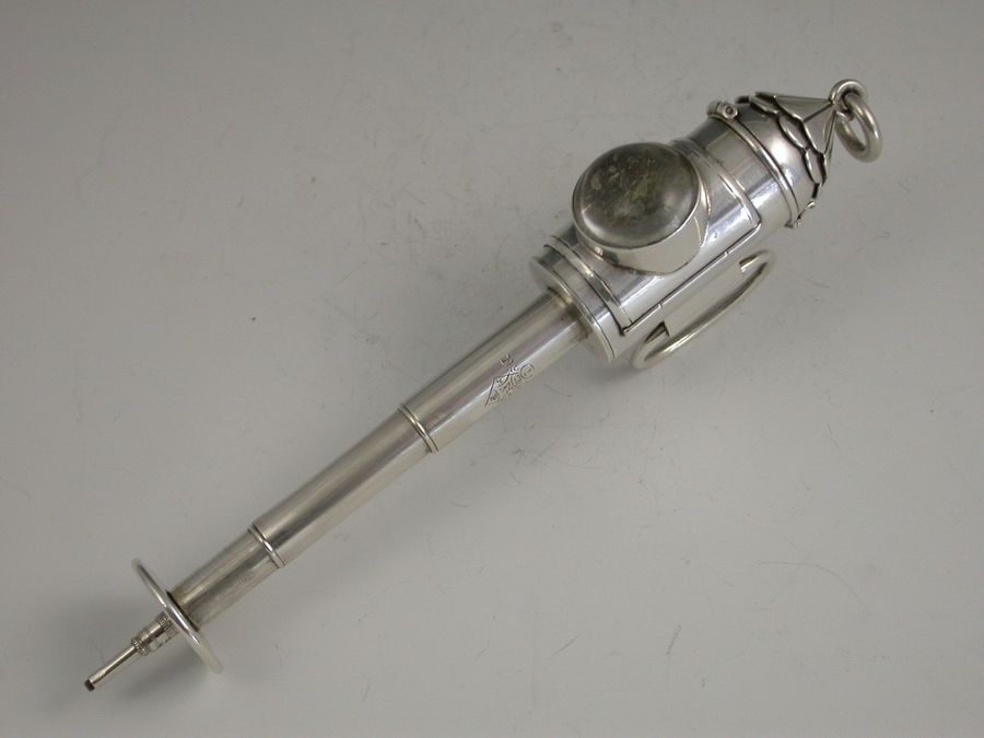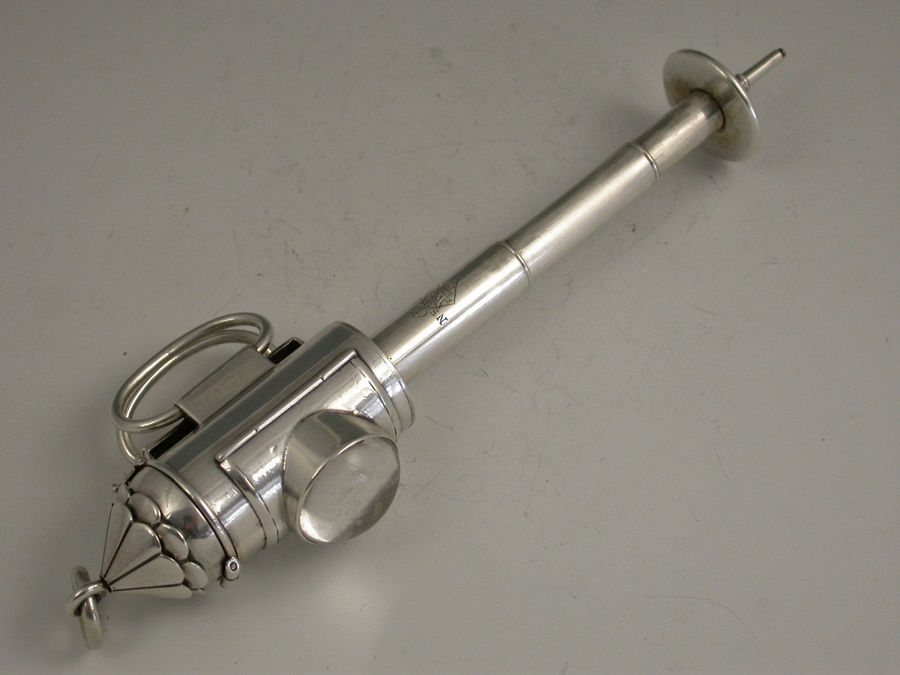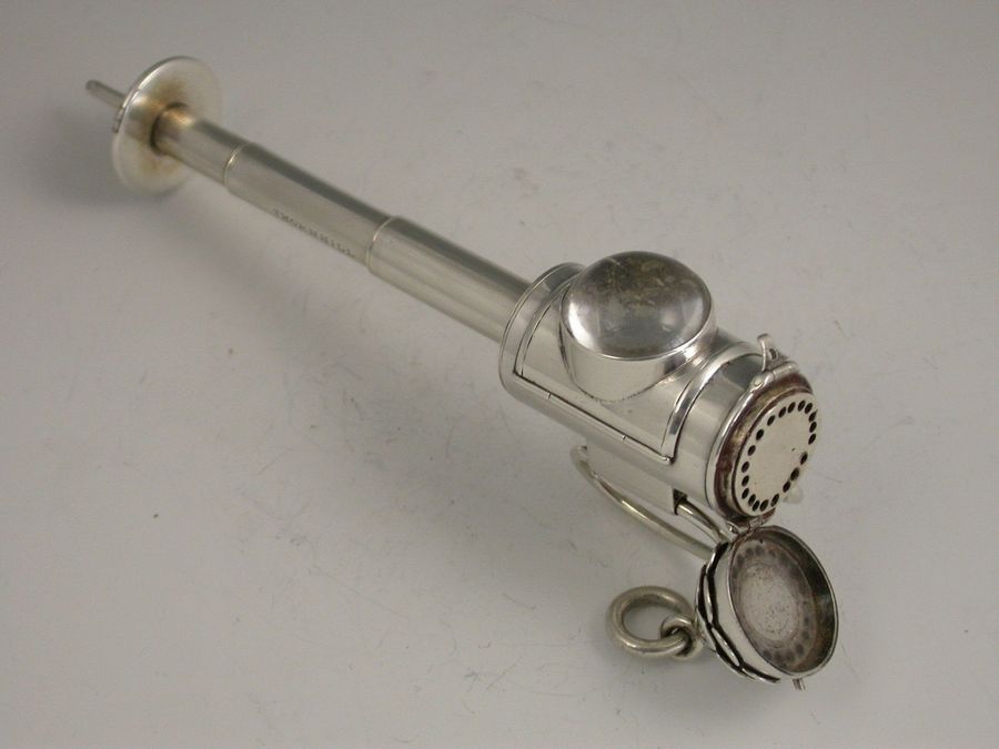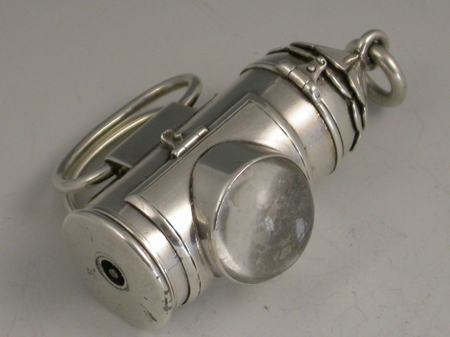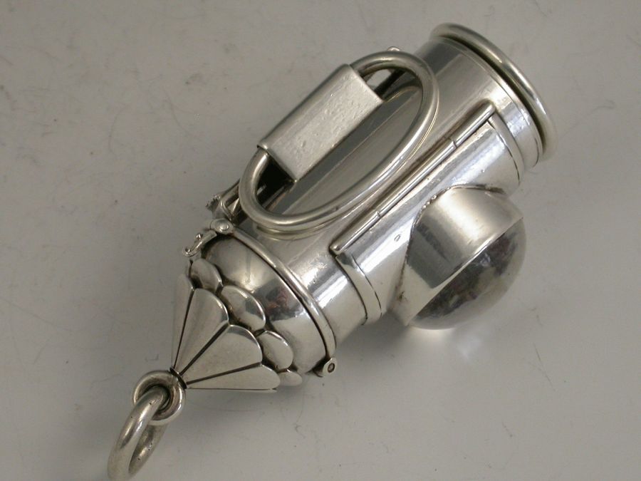 An extremely rare and large Victorian novelty silver 3-drawer telescopic Propelling Pencil, made in the form of Policeman's Bullseye Lantern. The hinged peaked cover opening to reveal a lead reservoir. The body with a circular domed glass magnifying lens with three foiled coloured backgrounds (red, green and clear) changed by rotating the top section. Two moveable oval handles and attached suspension ring. The large 3 drawer telescopic pencil pulling out from the base.