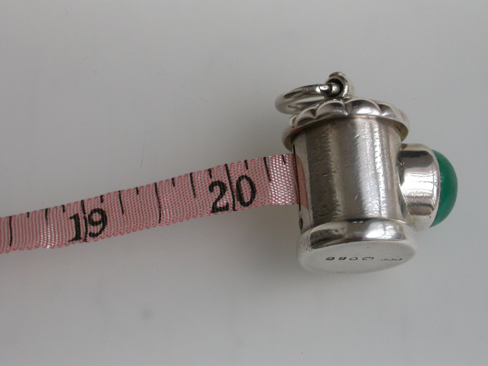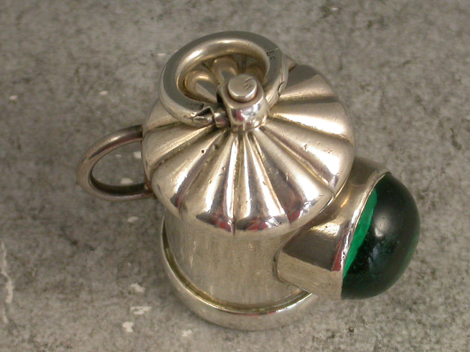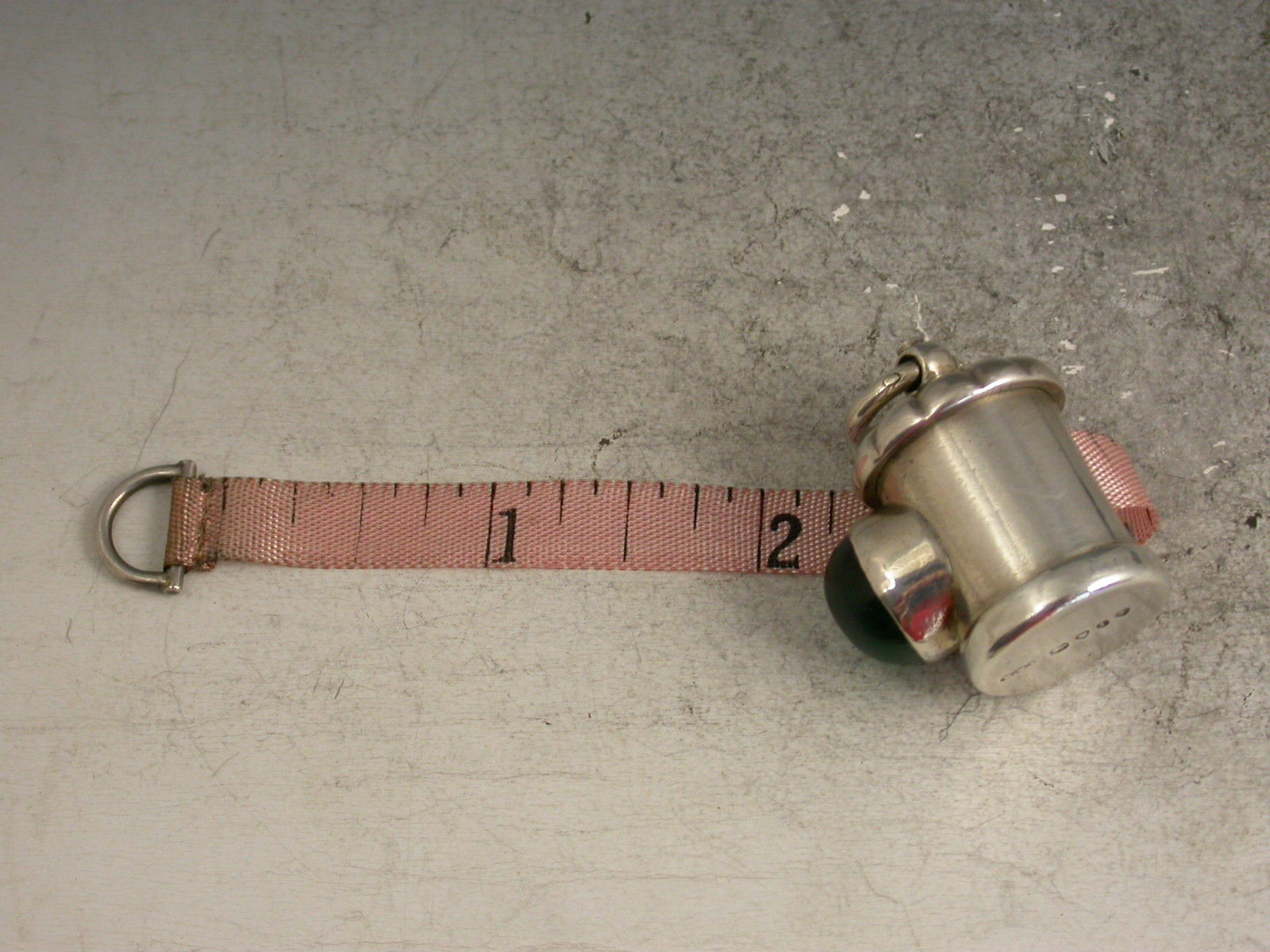 A very fine quality Victorian novelty cast silver Tape Measure made in the form of a Policeman's Bullseye Lantern, with intaglio initials 'DN' under the domed green glass lens. The twenty plus inch original silk tape complete and with sprung rewinding mechanism operated by the button on top of the lid.