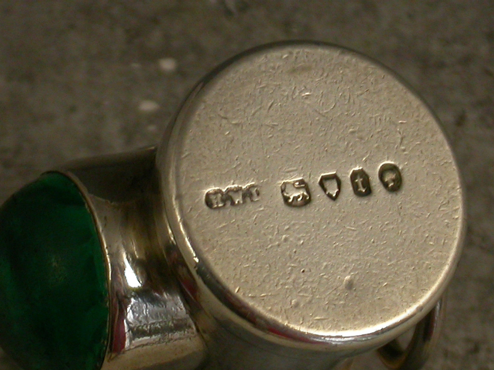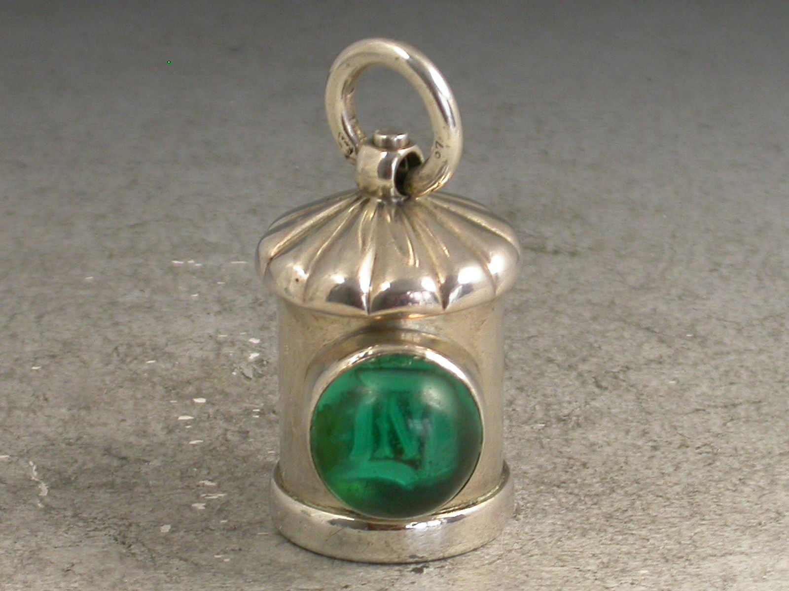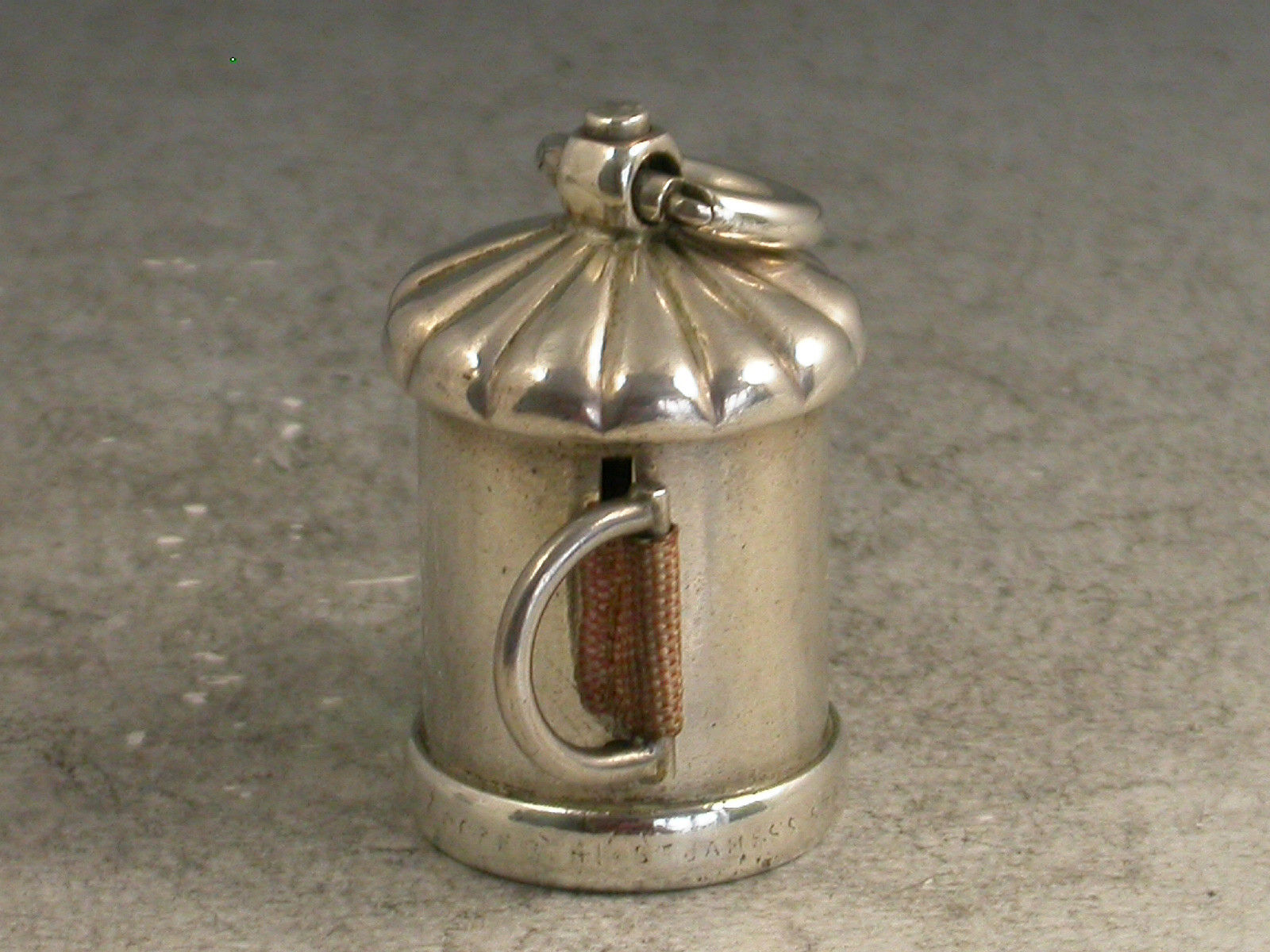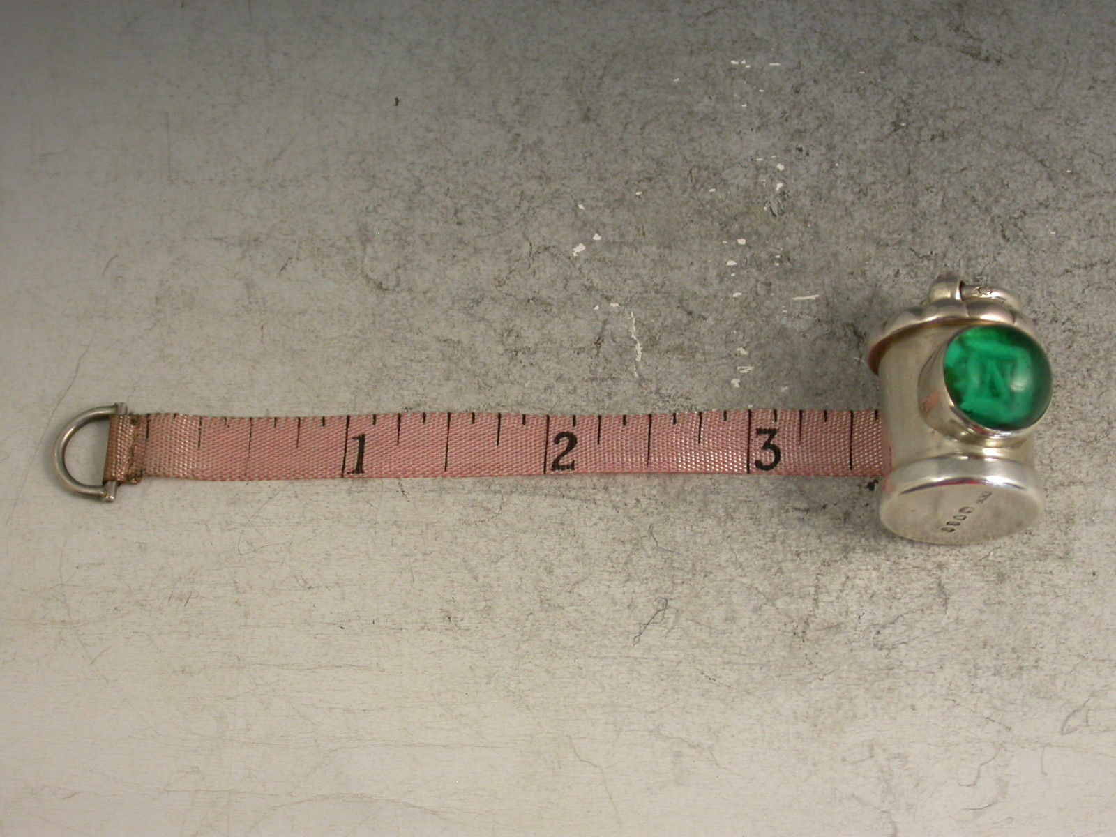 A very fine quality Victorian novelty cast silver Tape Measure made in the form of a Policeman's Bullseye Lantern, with intaglio initials 'DN' under the domed green glass lens. The twenty plus inch original silk tape complete and with sprung rewinding mechanism operated by the button on top of the lid.