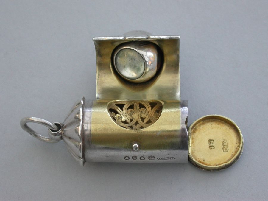 A rare small Victorian novelty silver Vinaigrette formed as a Policeman's Bullseye Lantern, with fluted domed top and suspension ring, the front hinged cover mounted with a revolving ball set with white, red and green glass and opening to reveal an incurving leaf pierced grille, hinged base and silver gilt interior.