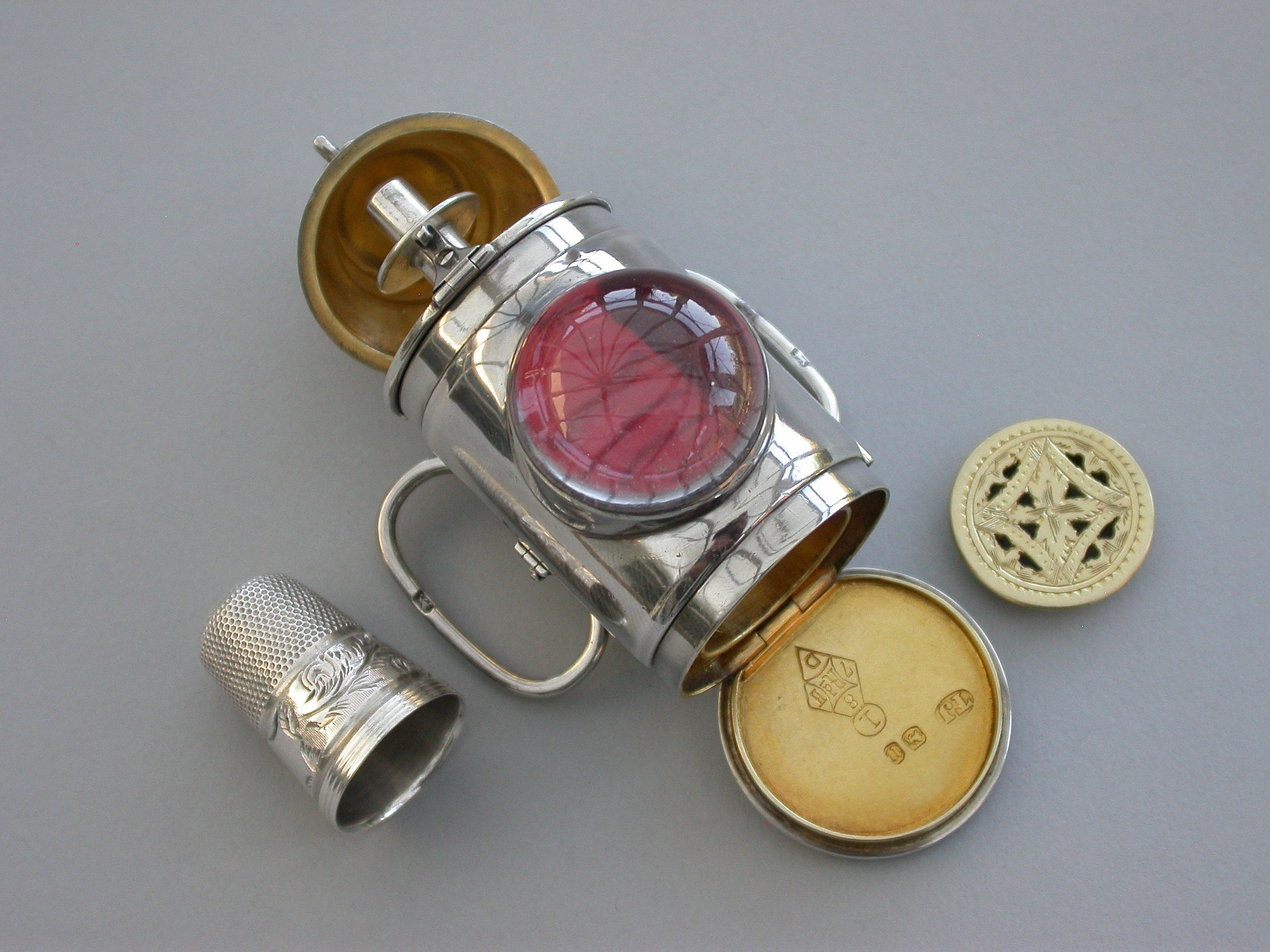A rare Victorian novelty silver combination Vinaigrette & Sewing Etui formed as a Policeman's Bullseye Lantern, with mock opening door, two tier fluted domed top opening by a catch to reveal the etui including thimble, bobbin and tape measure. A large domed crystal lens to the front with red foiled background. The plain hinged base containing the vinaigrette with pierced silver gilt lift-out grille. Belt fittings to the rear.