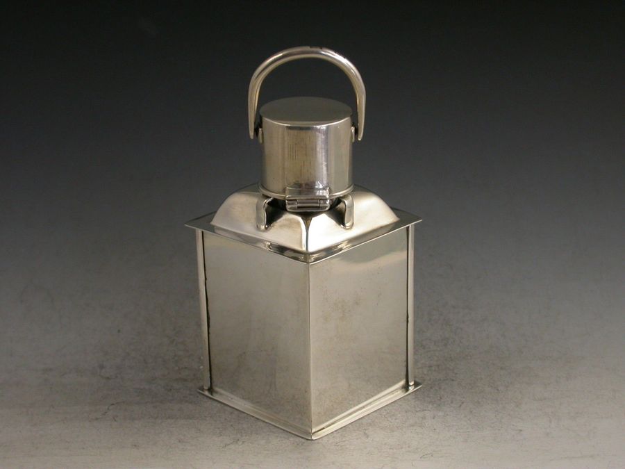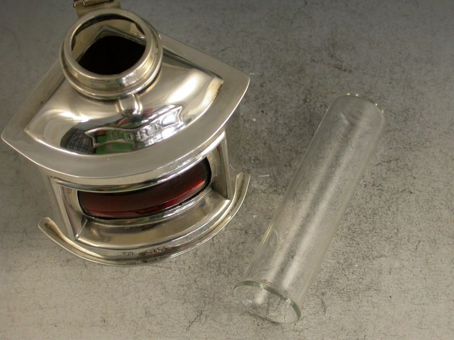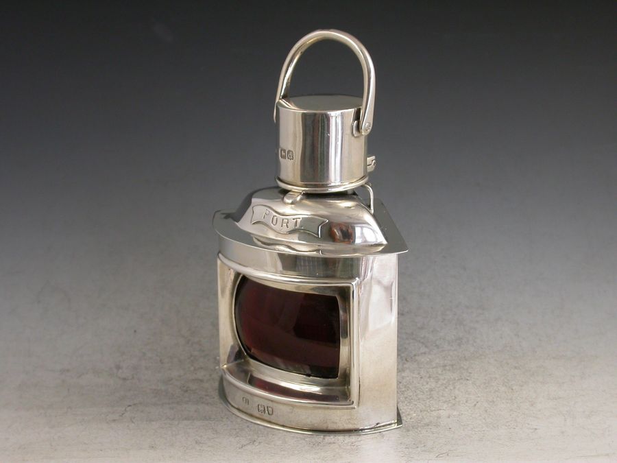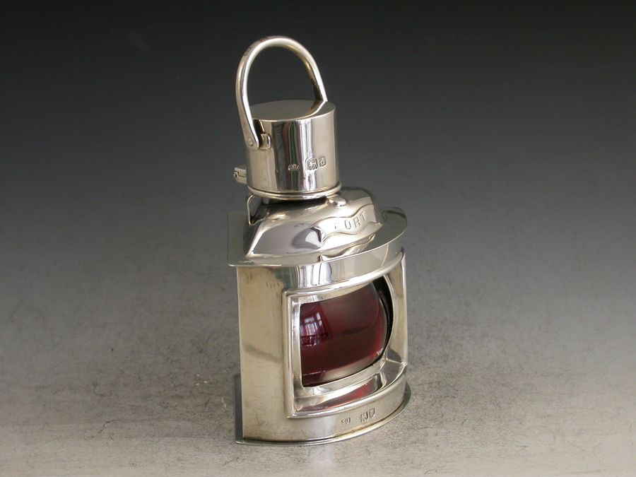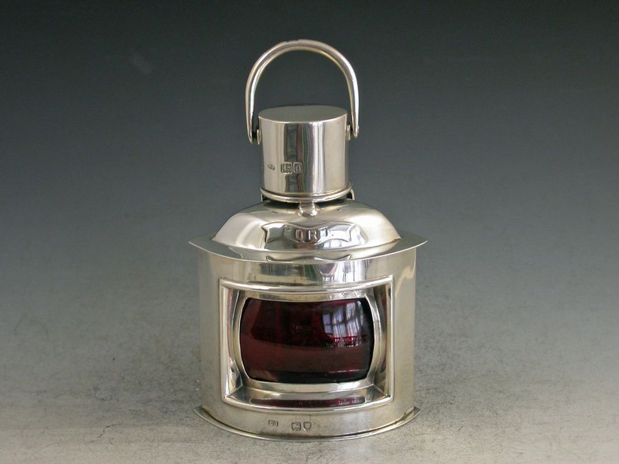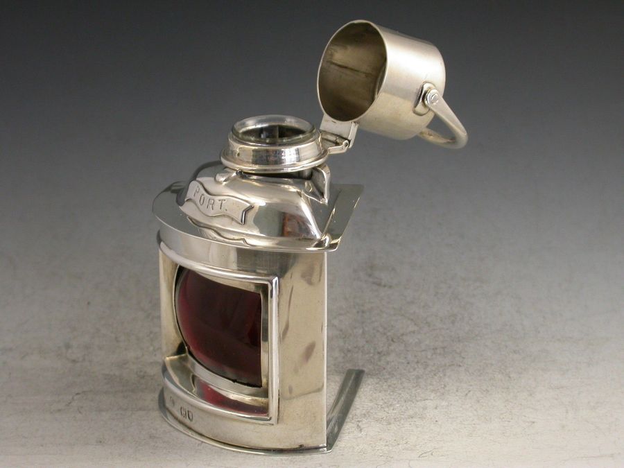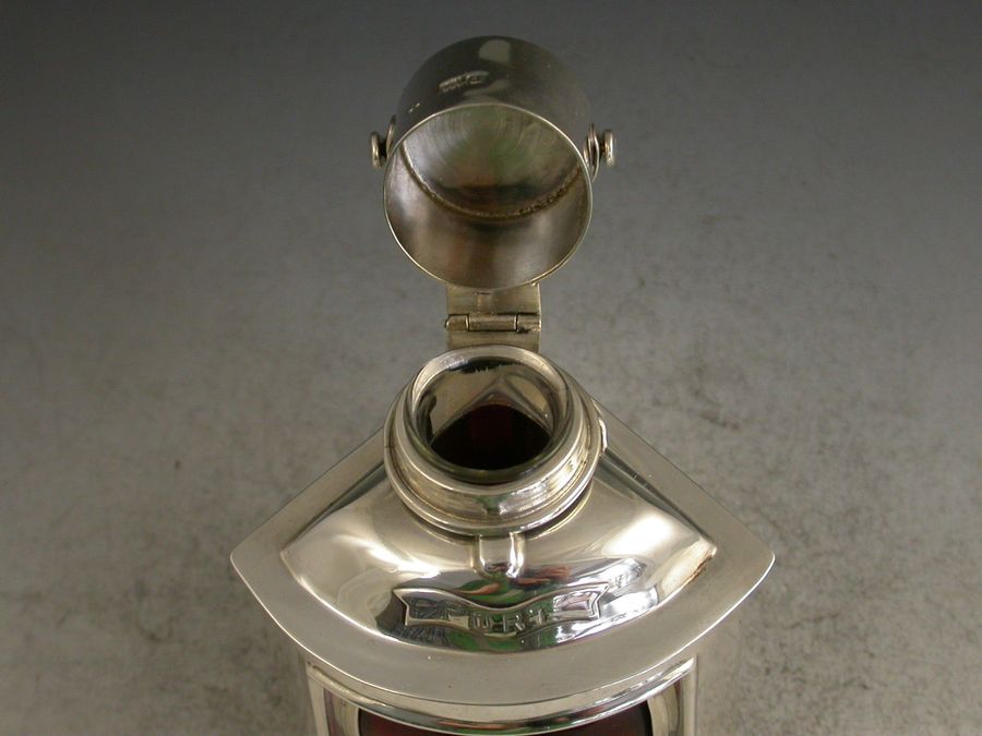 A good Victorian novelty silver Inkwell made in the form of a ""PORT"" Ships Lantern, with red glass lens, hinged cover and swing handle. Internal tubular glass well.