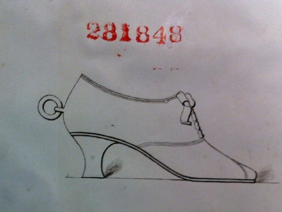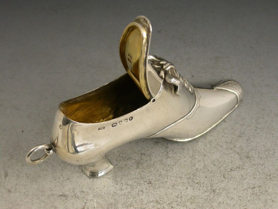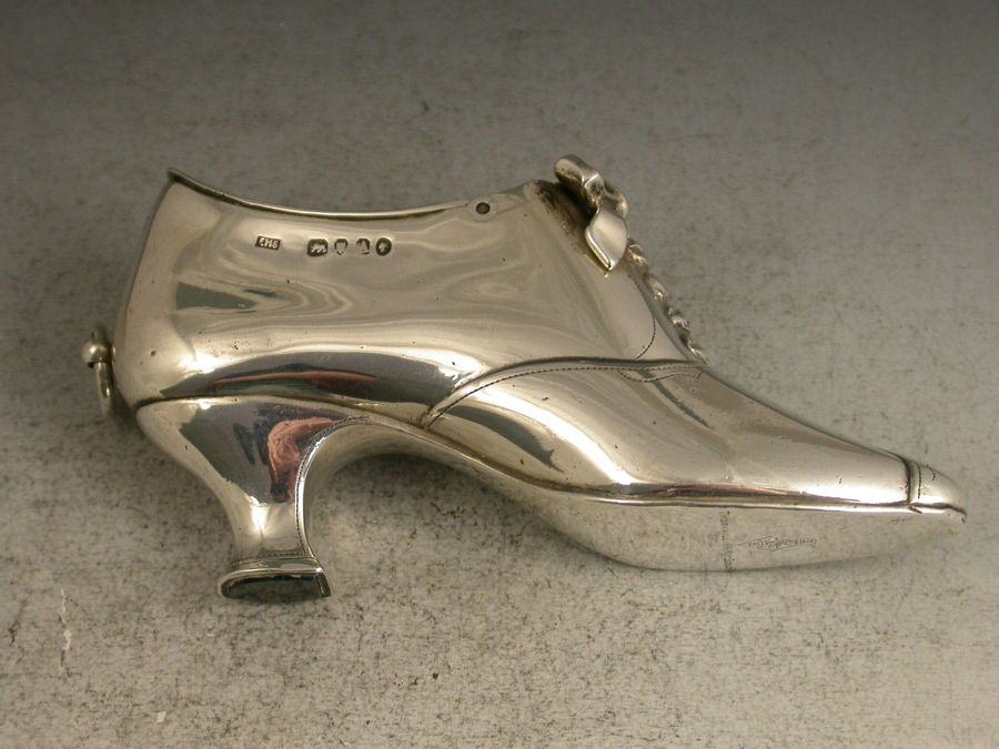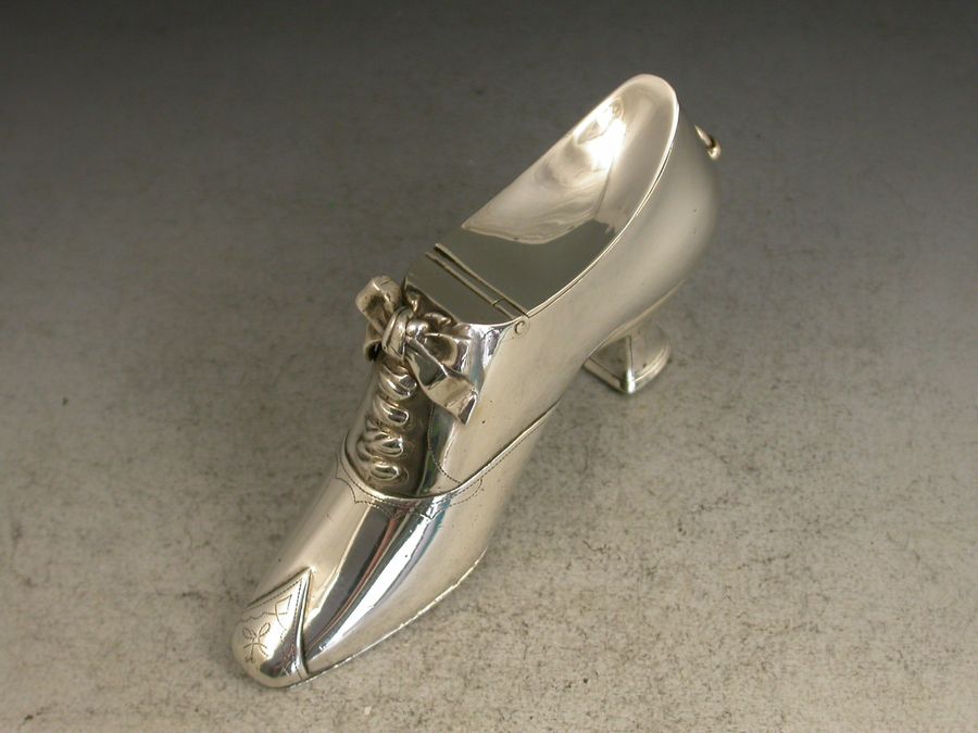 A very unusual Victorian novelty cast silver Box made in the form of a high heeled lace-up Shoe, a bloodstone Seal matrix to the base of the heel, the curved hinged lid opening to reveal a gilded interior. Attached suspension ring.