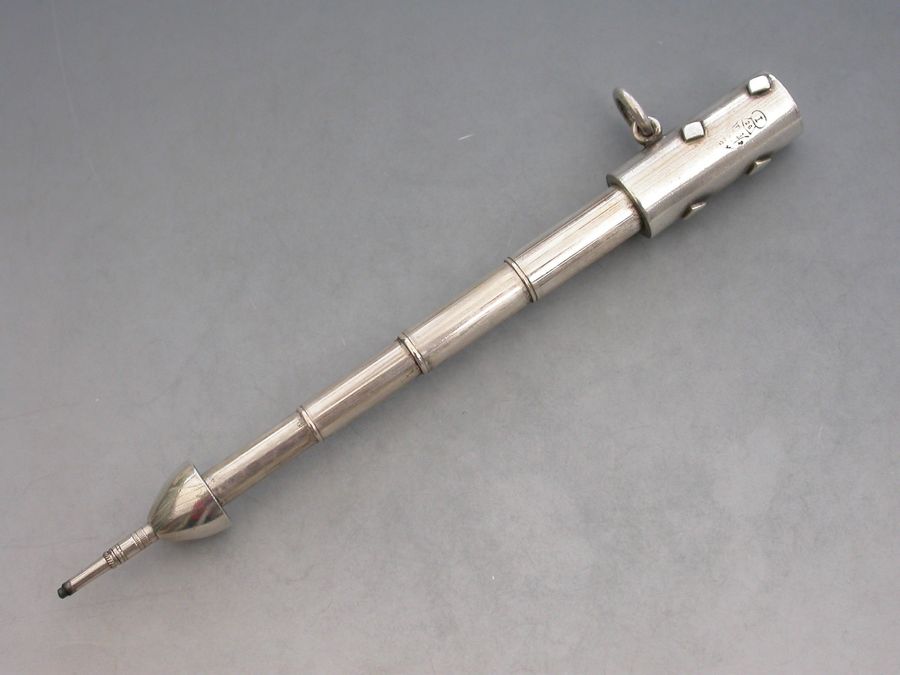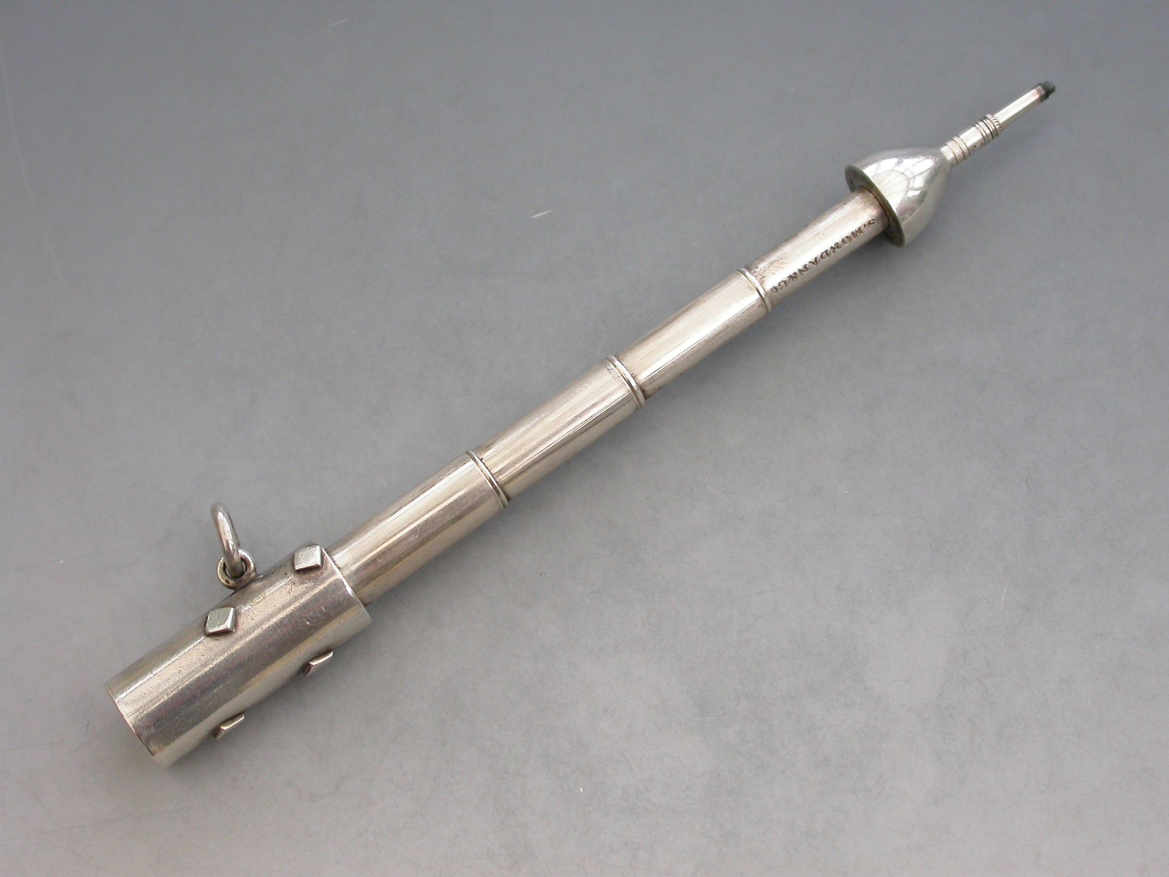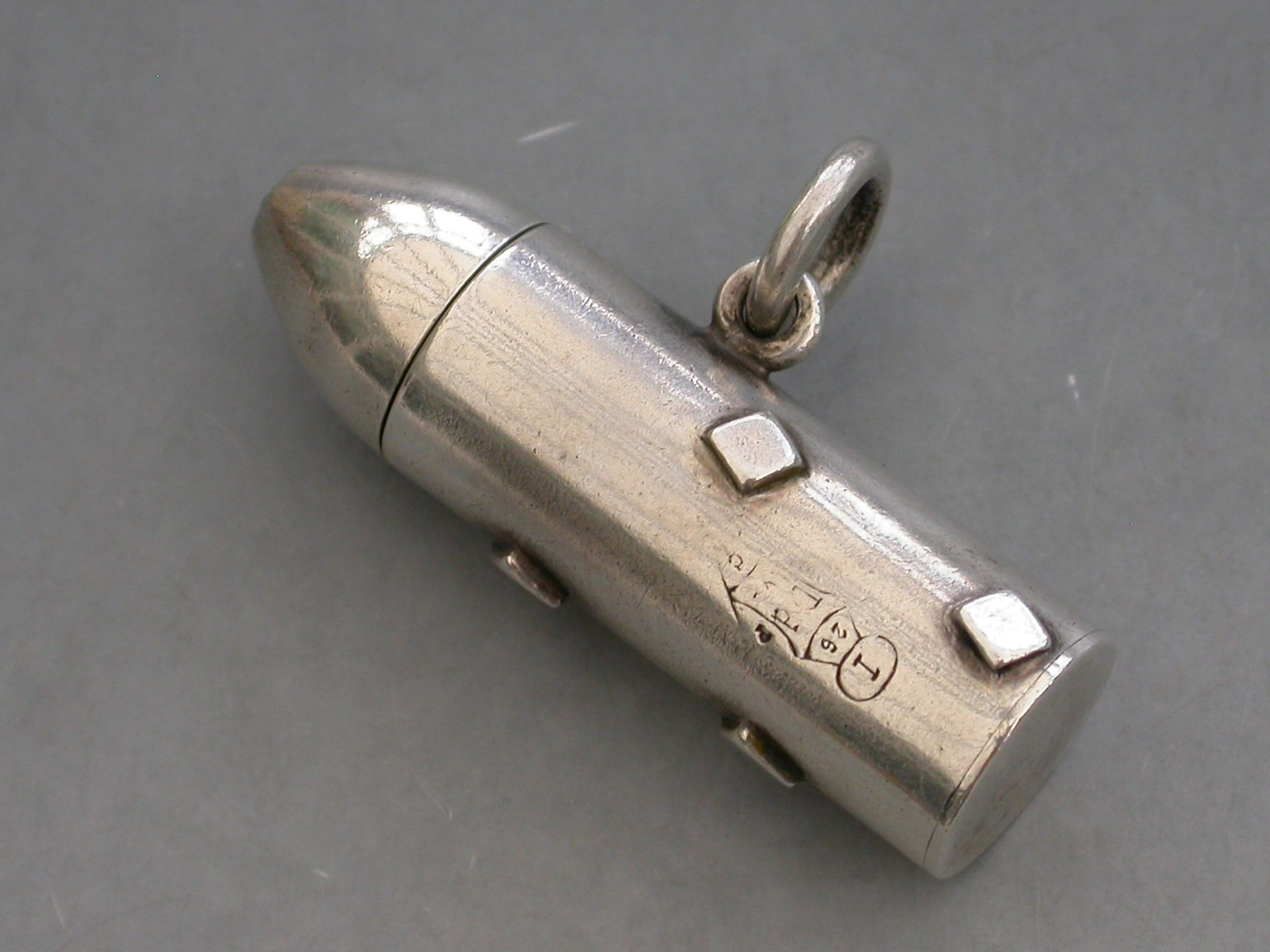 A rare novelty silver Propelling Pencil made in the form of a Rifled Muzzle Loading Artillery Shell with studs applied to the outer case and attached suspension ring.