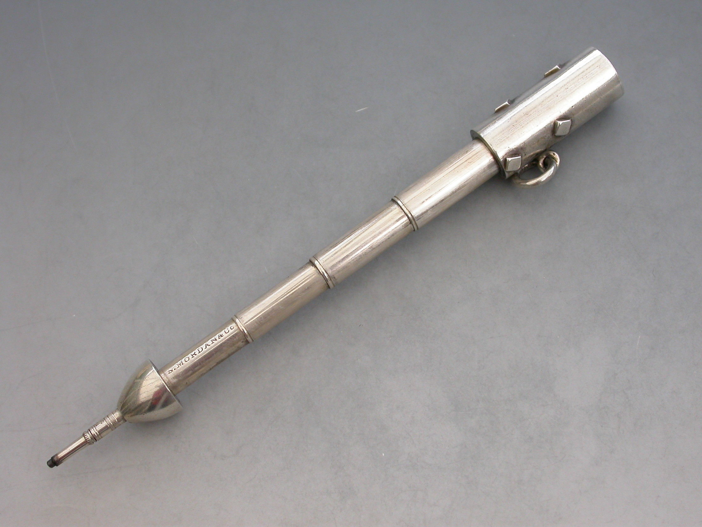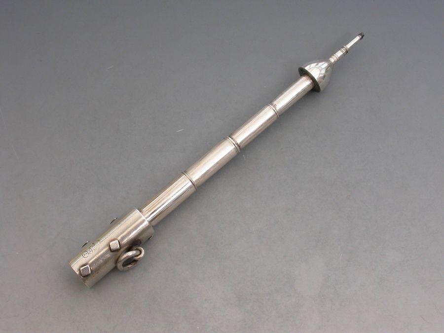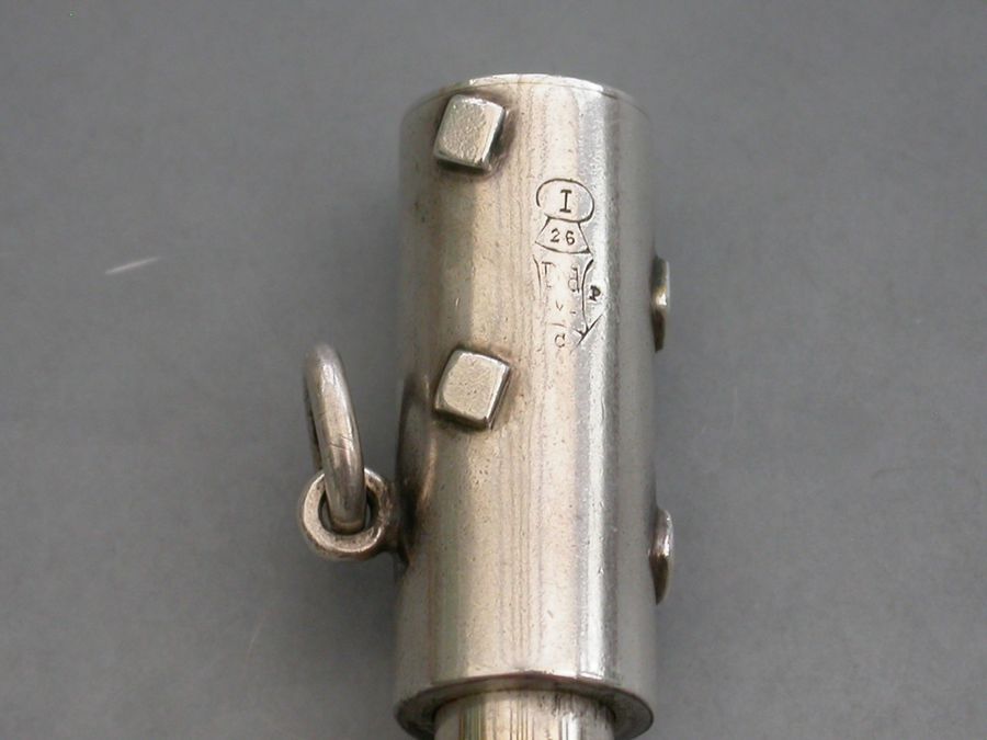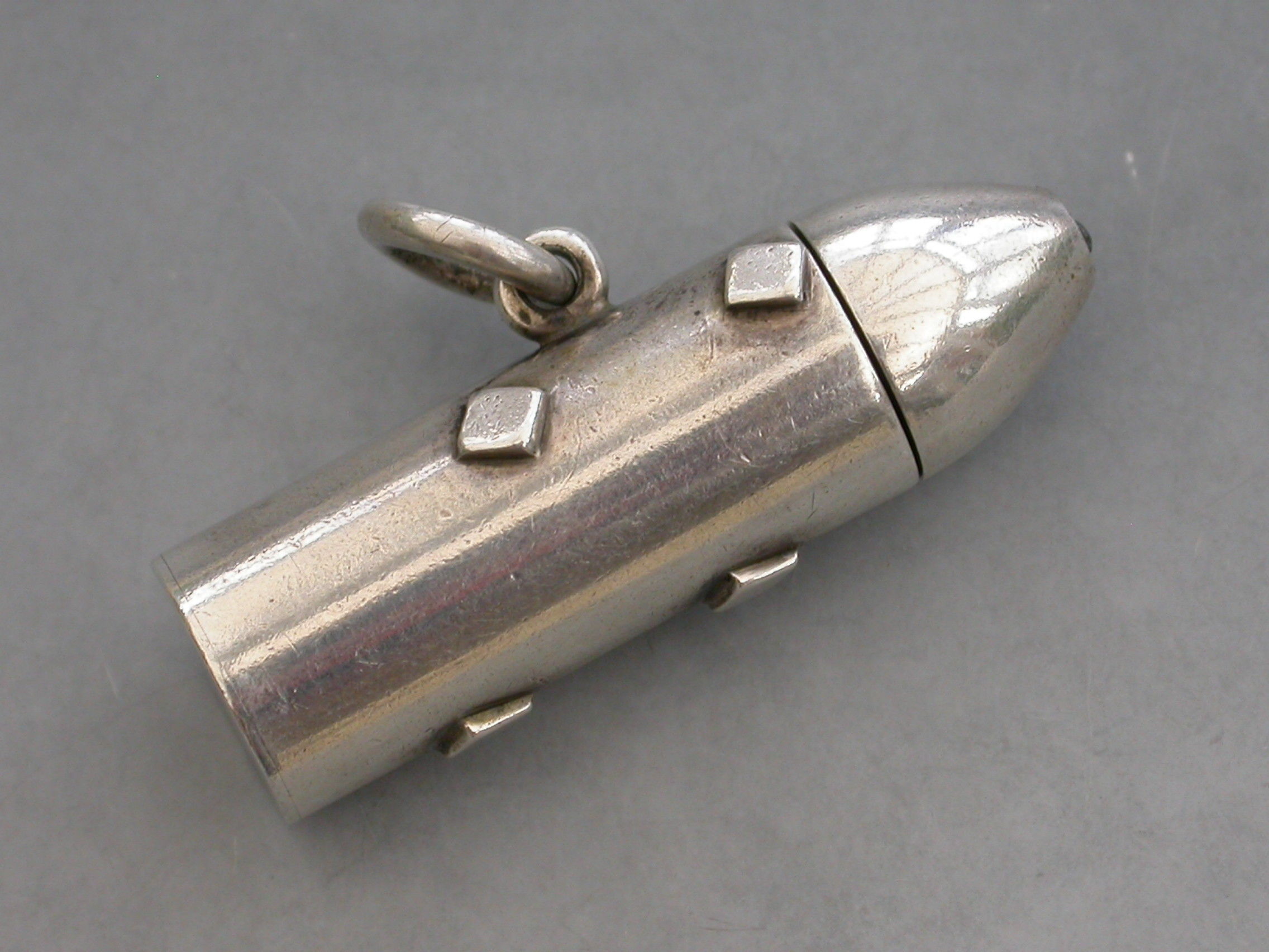 A rare novelty silver Propelling Pencil made in the form of a Rifled Muzzle Loading Artillery Shell with studs applied to the outer case and attached suspension ring.