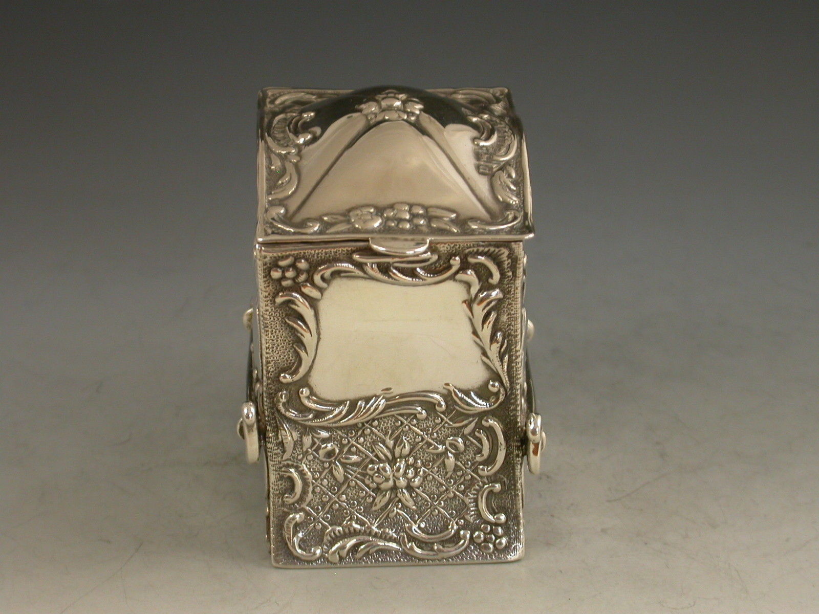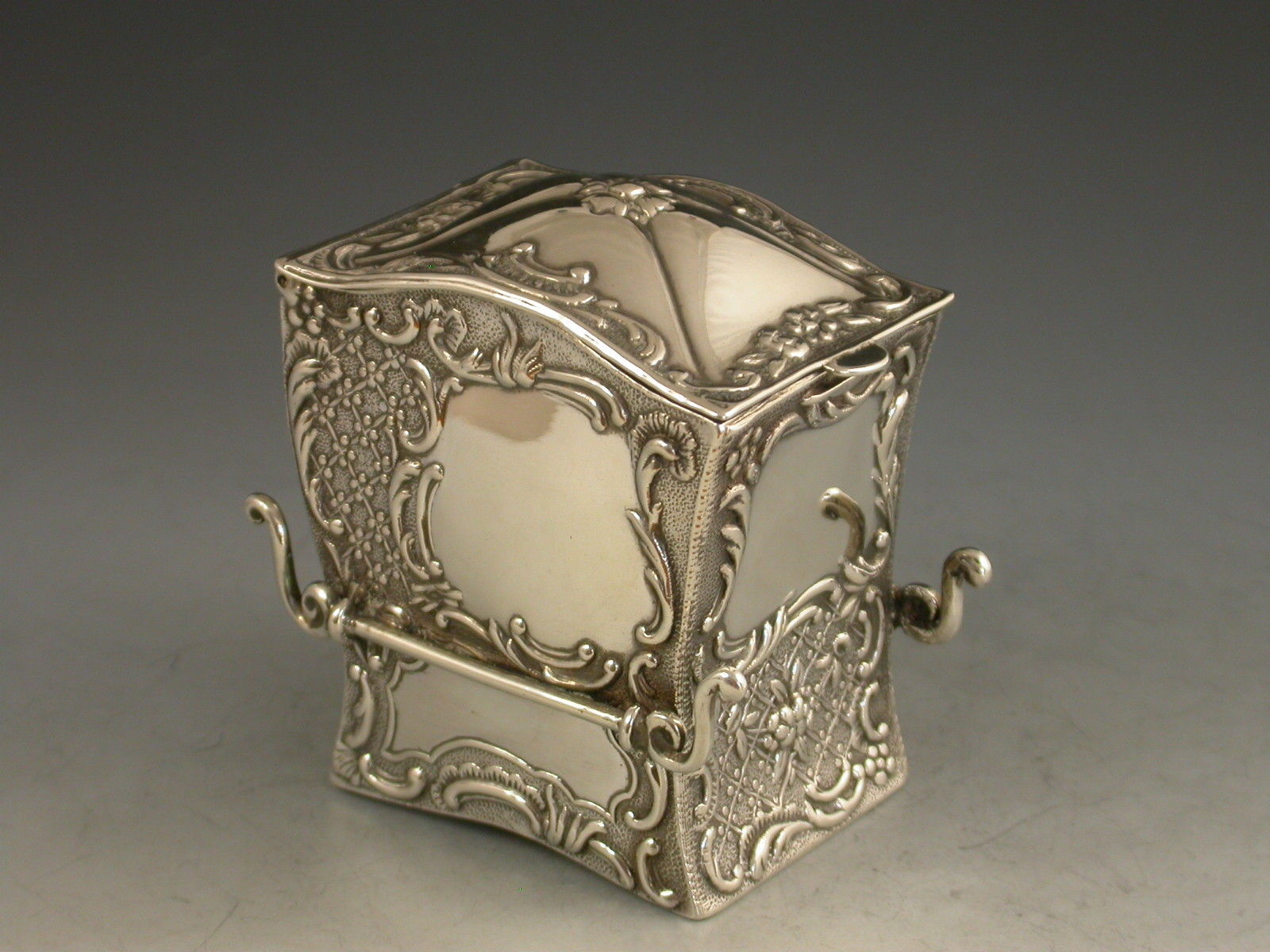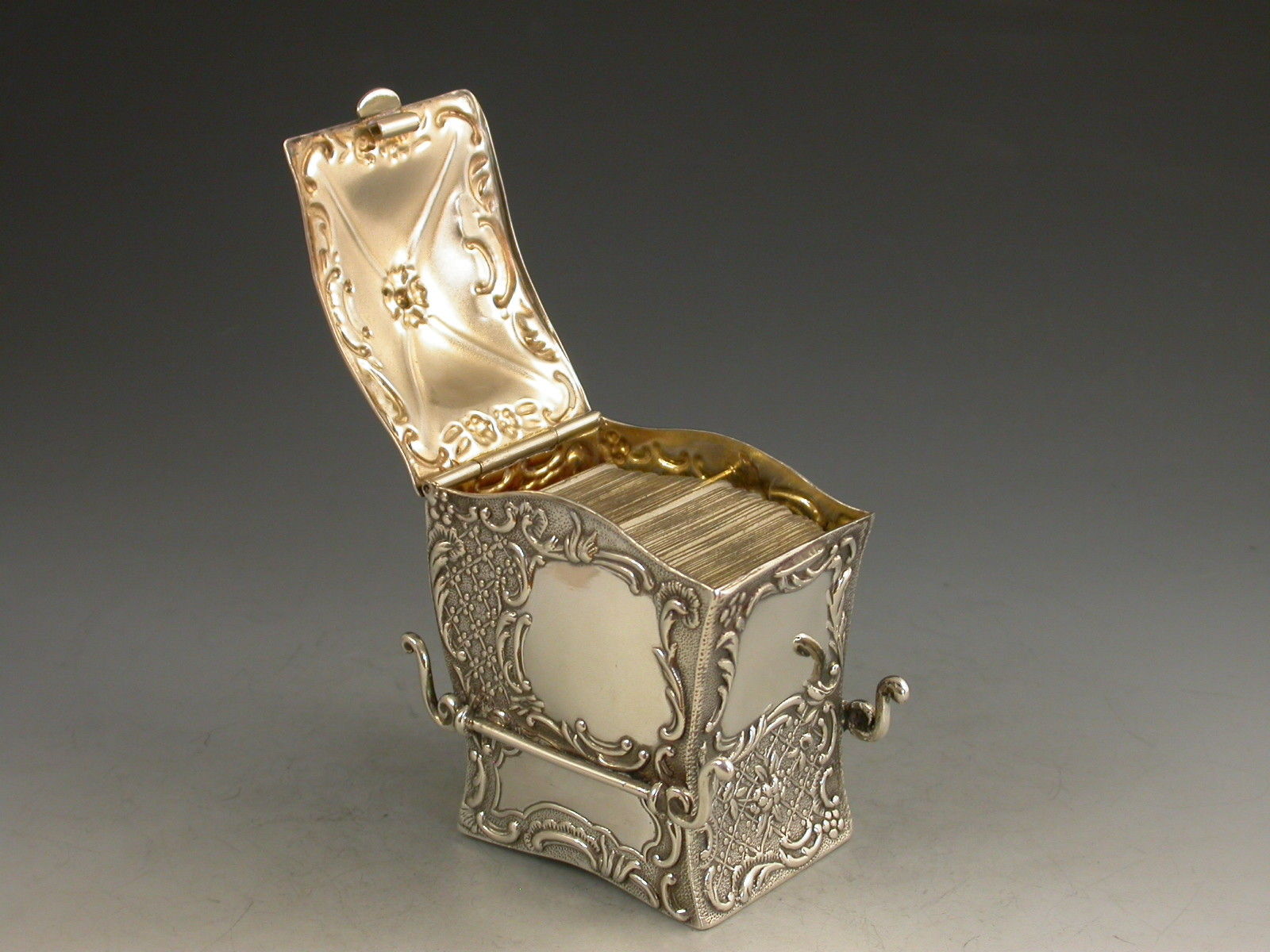 A rare Victorian novelty silver miniature twin pack Playing Cards Box modelled in the form a Sedan Chair, with hinged domed lid and each panel chased and embossed with intricate repousse scroll work, vacant caroutches to the front and sides. The silver gilt interior containing two complete packs of contemporary miniature playing cards.