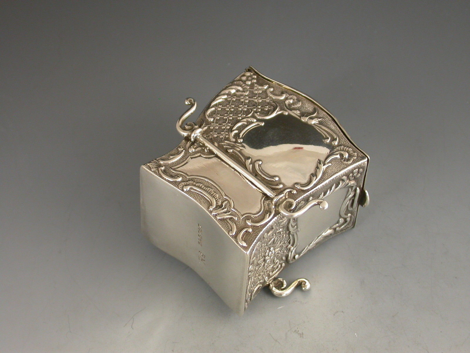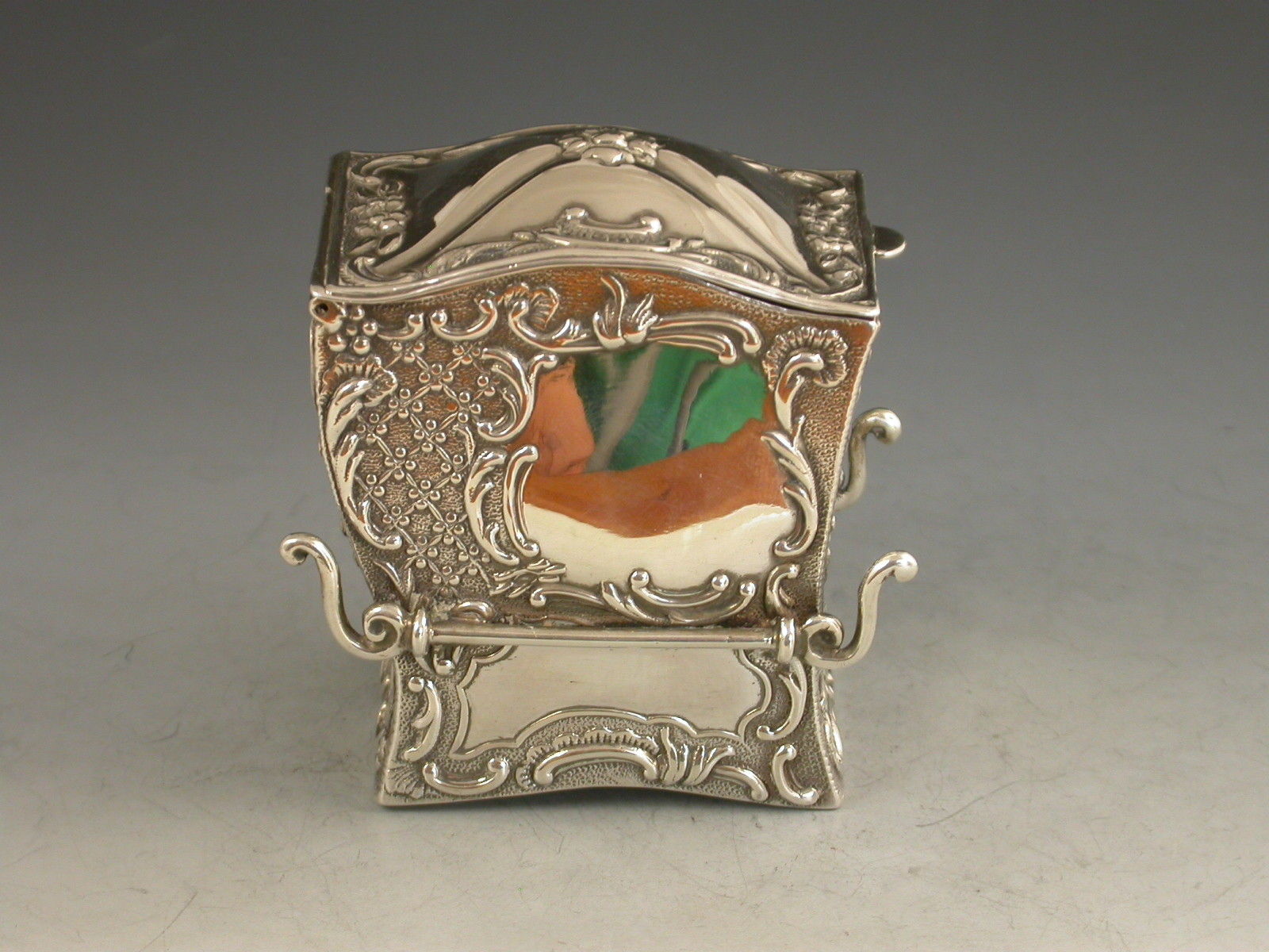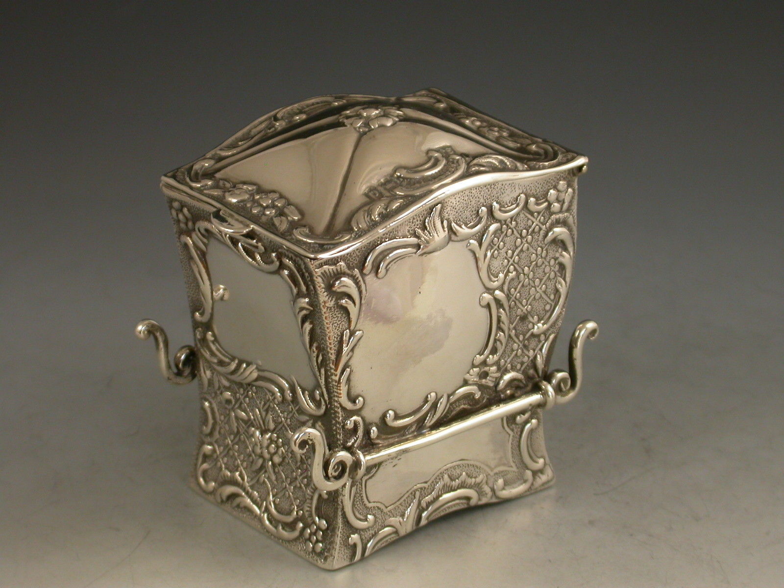 A rare Victorian novelty silver miniature twin pack Playing Cards Box modelled in the form a Sedan Chair, with hinged domed lid and each panel chased and embossed with intricate repousse scroll work, vacant caroutches to the front and sides. The silver gilt interior containing two complete packs of contemporary miniature playing cards.