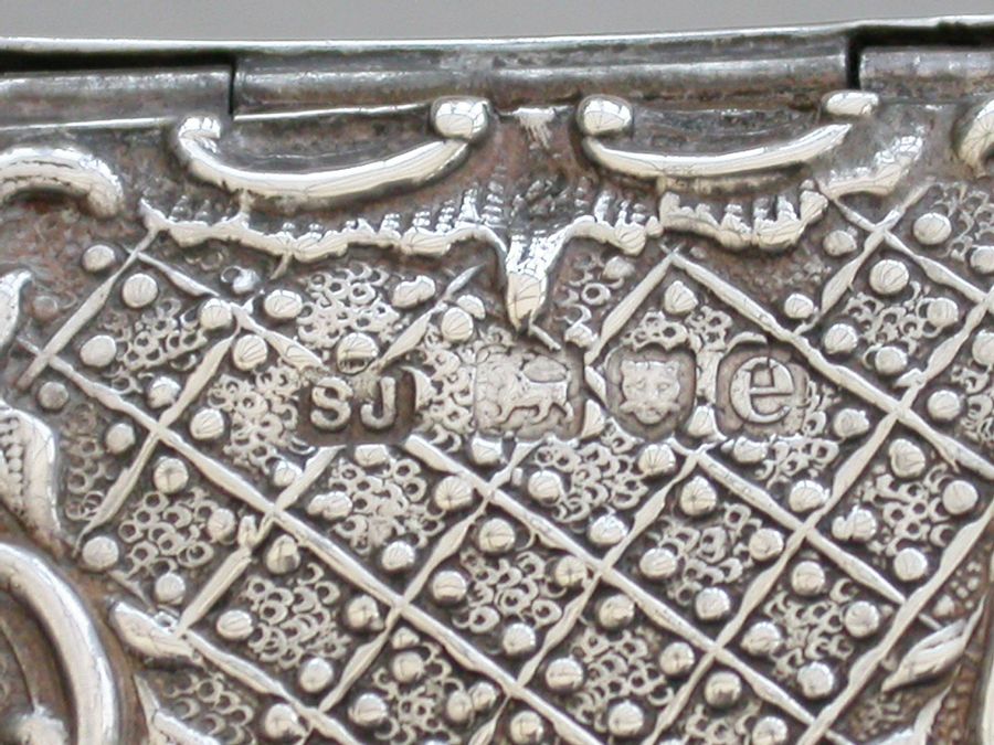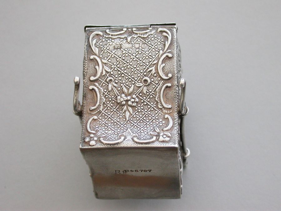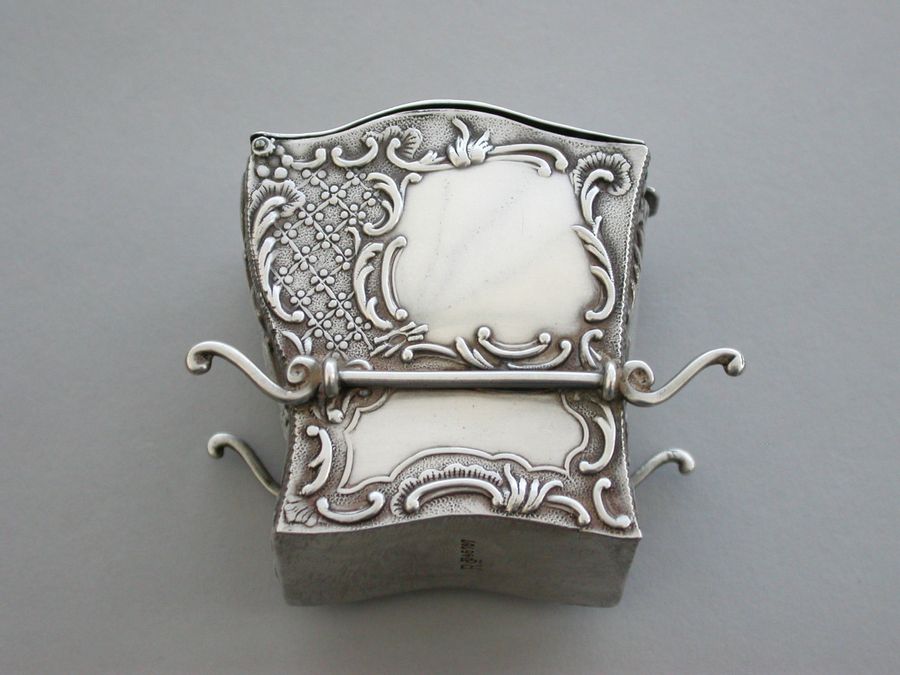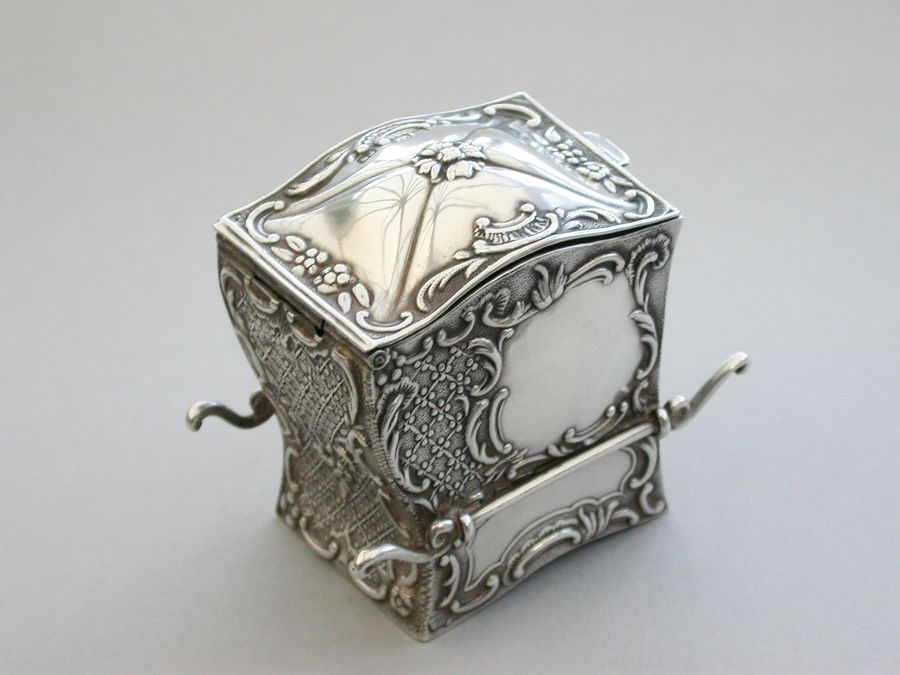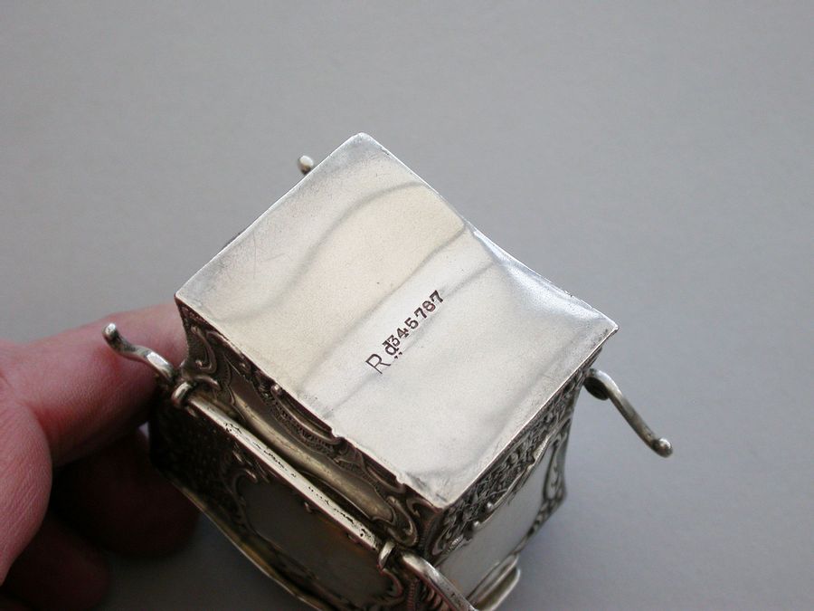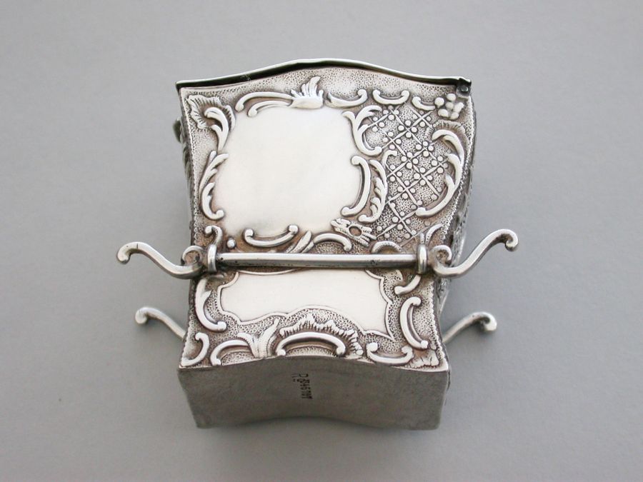 A rare late Victorian novelty silver miniature twin pack Playing Cards Box modeled in the form a Sedan Chair, with hinged domed lid and each panel chased and embossed with intricate repousse scroll work, vacant caroutches to the front and sides. The silver gilt interior containing two complete packs of contemporary miniature playing cards.