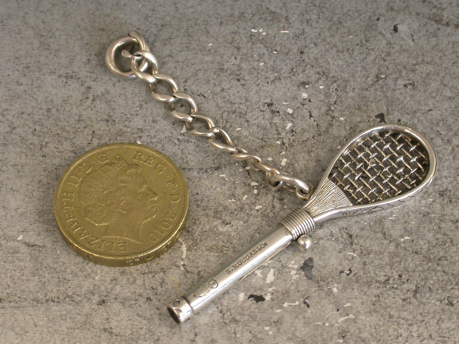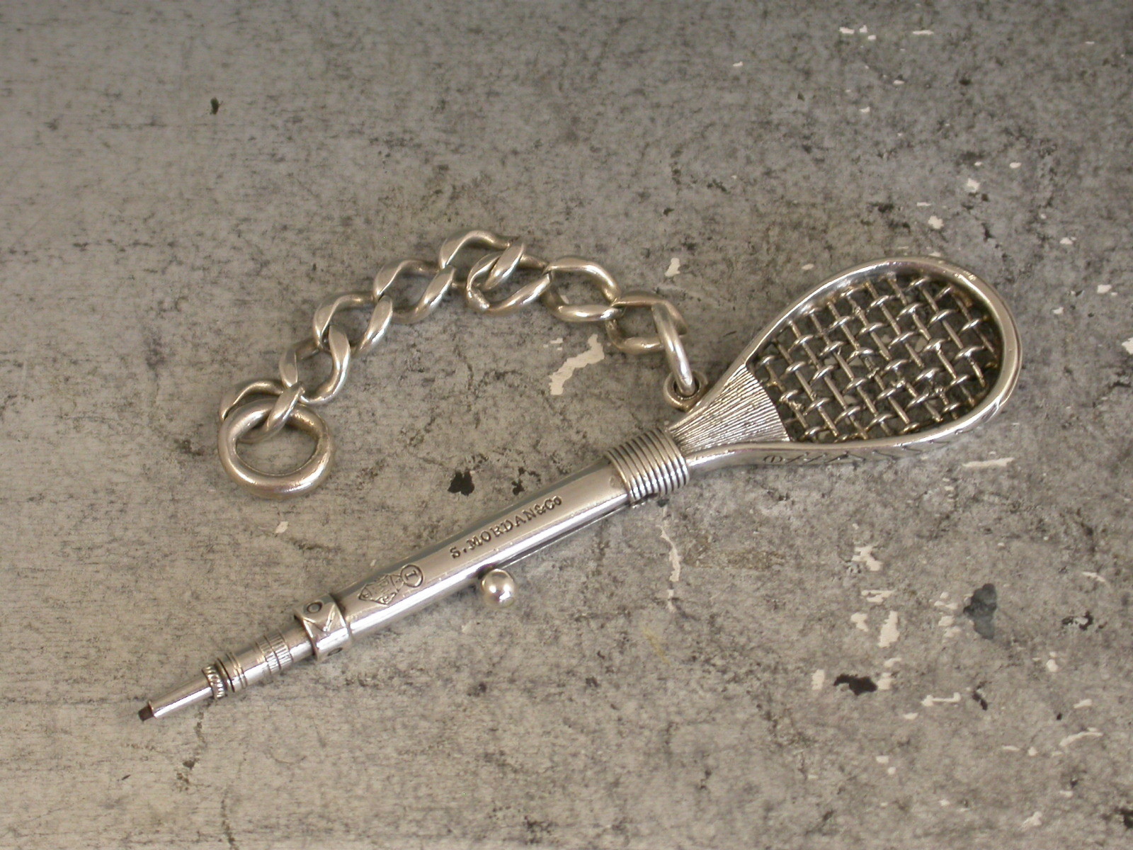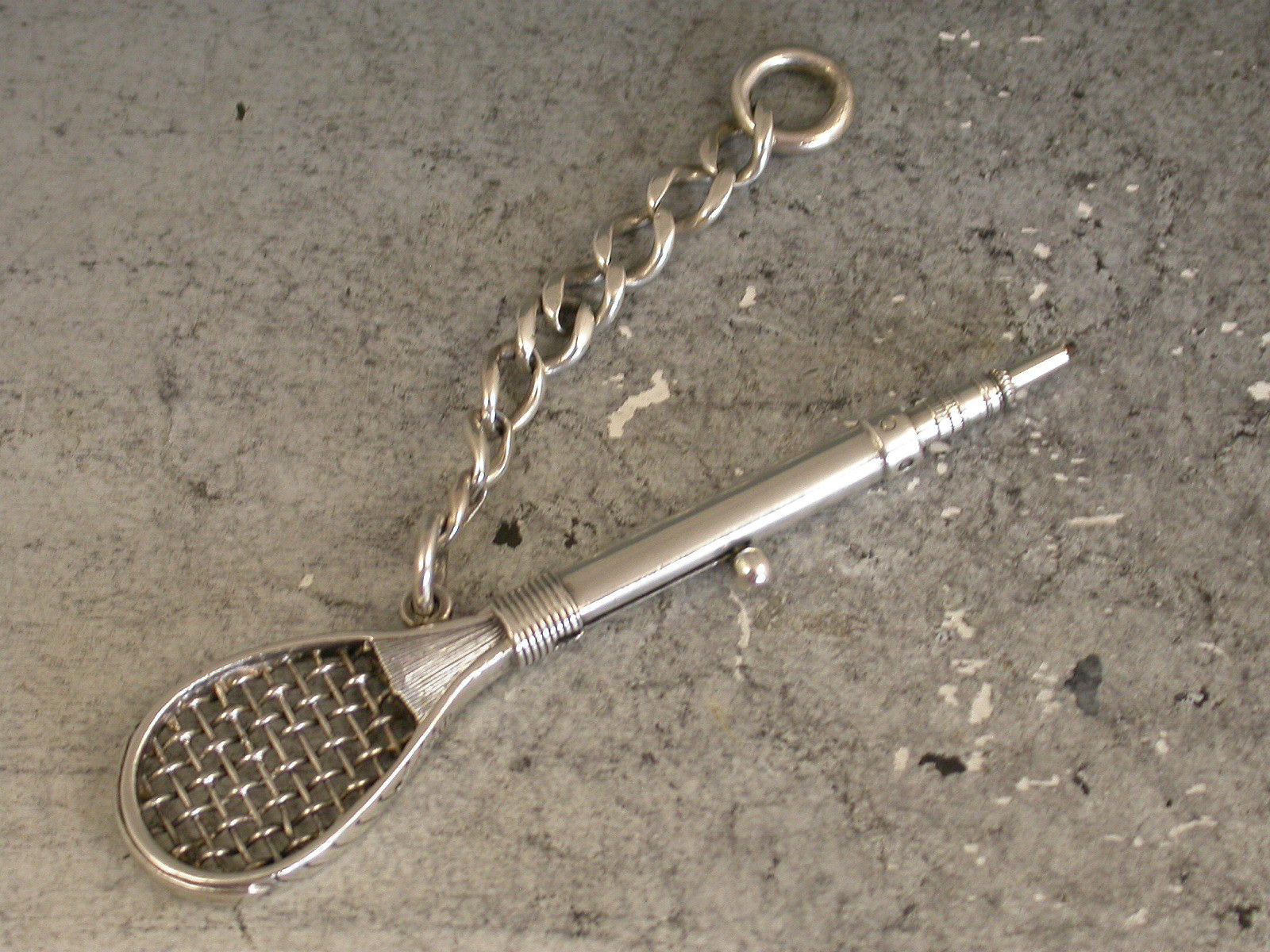 A rare Victorian novelty silver Propelling Pencil made in the form of an early wooden Tennis or Sphairistike Racket and of unusually small size.
