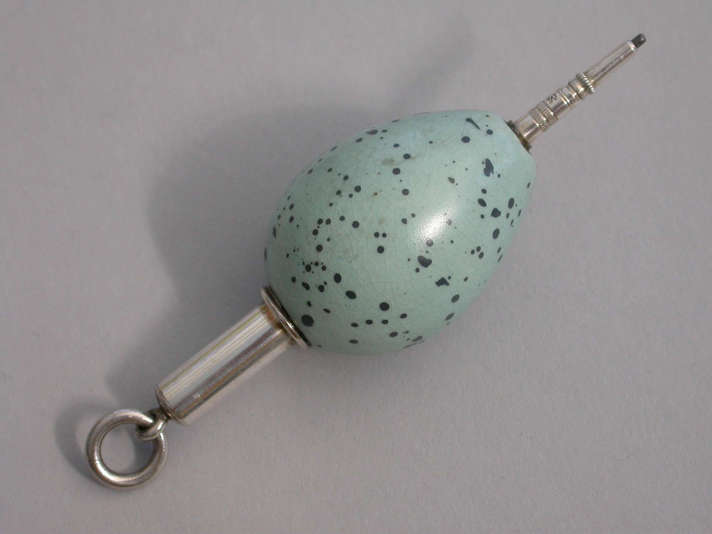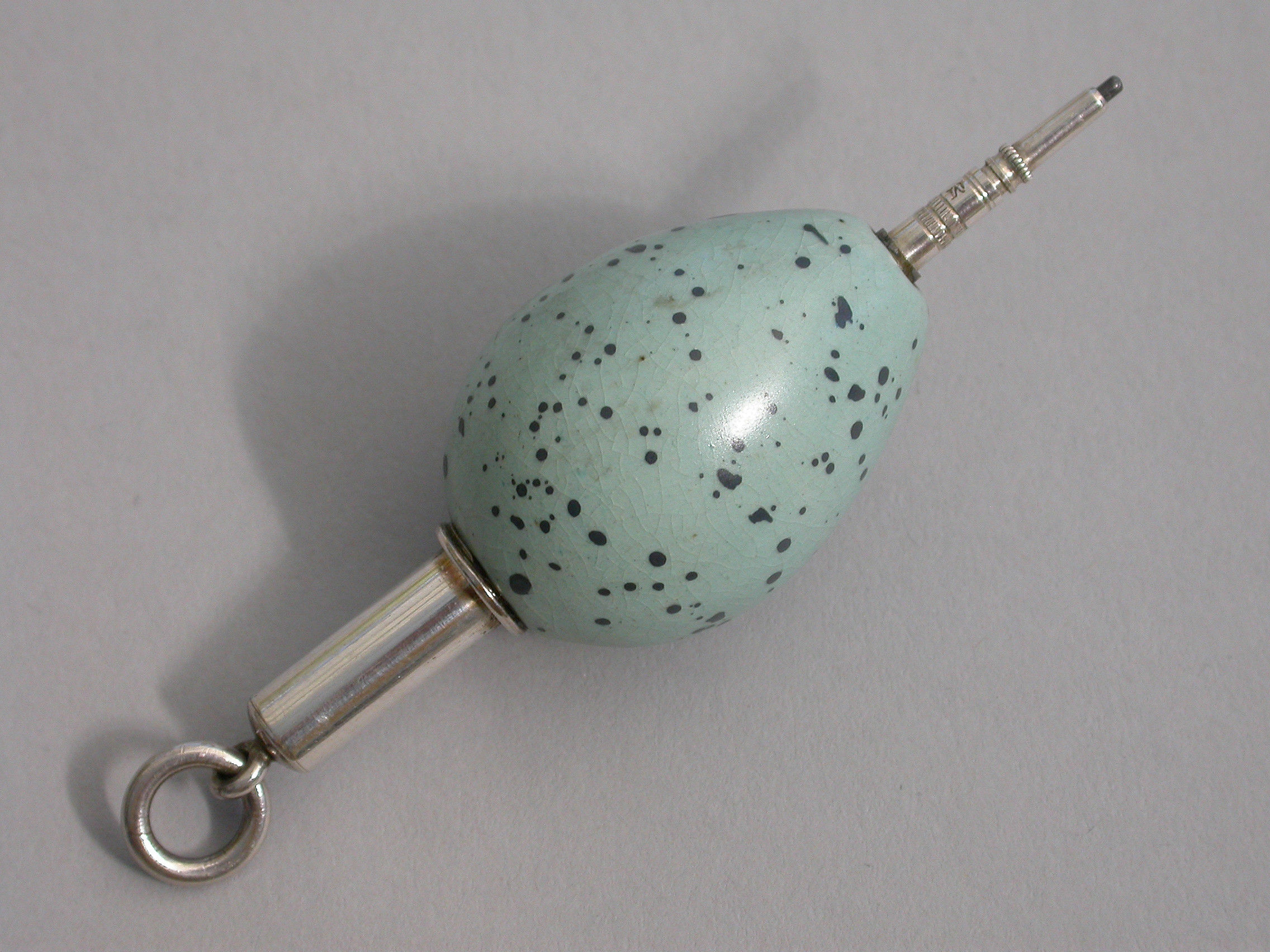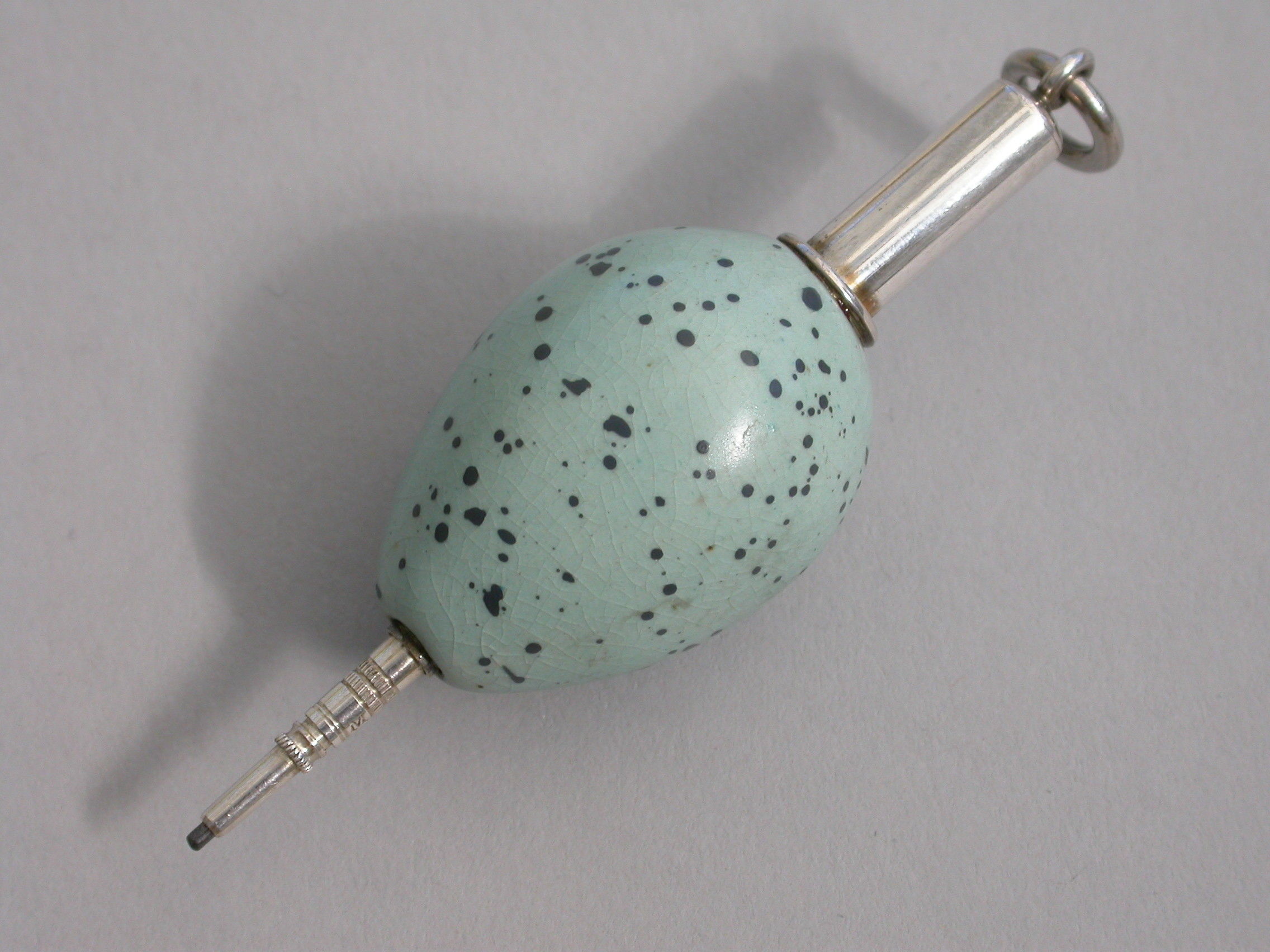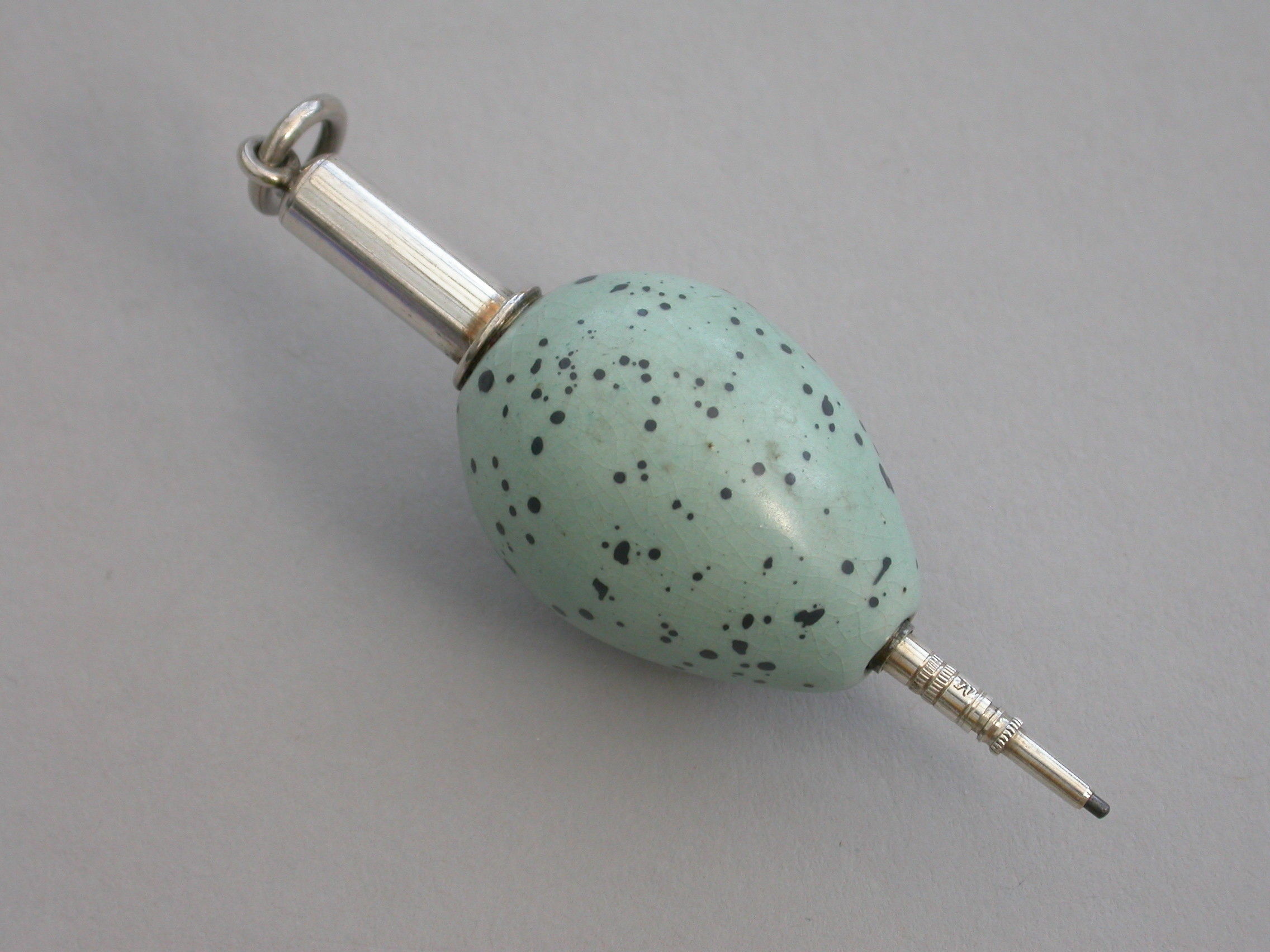 A rare Victorian novelty silver and ceramic Propelling Pencil, the body formed as a Song Thrush's egg, with attached suspension ring.