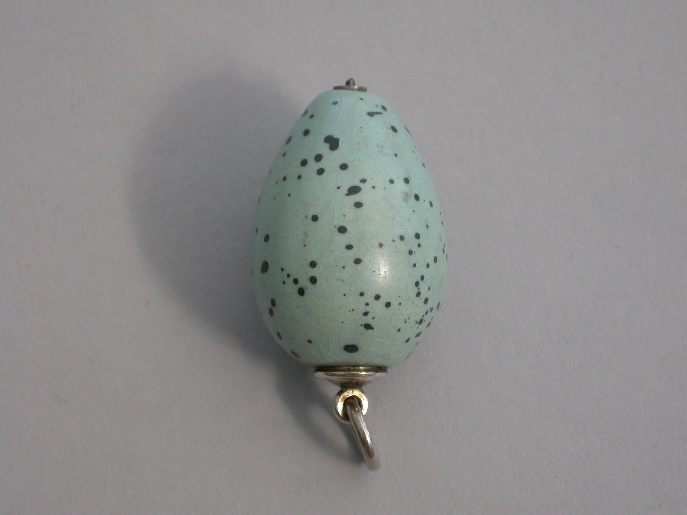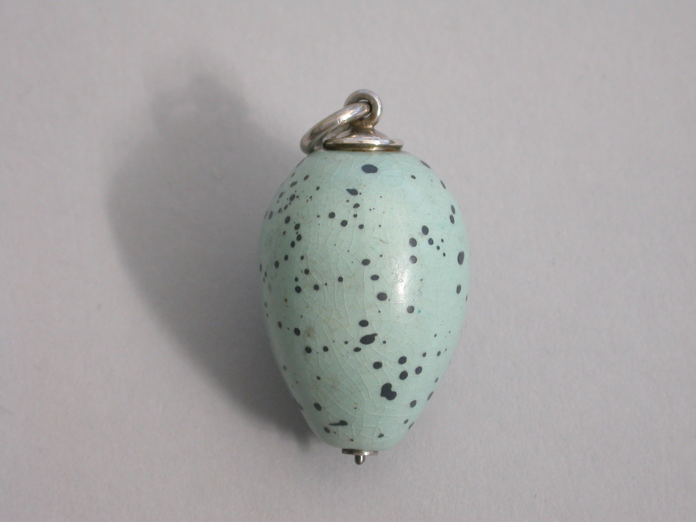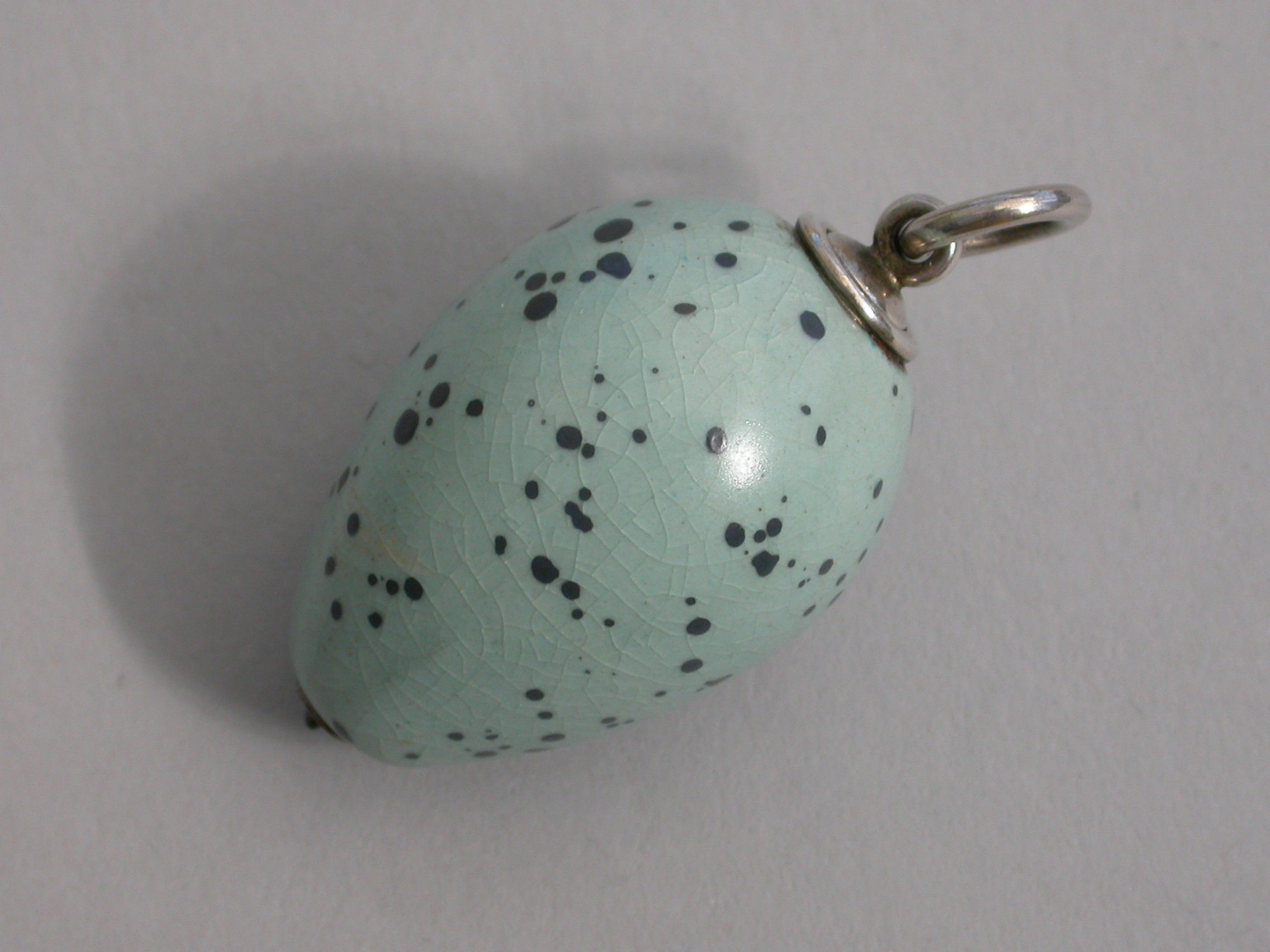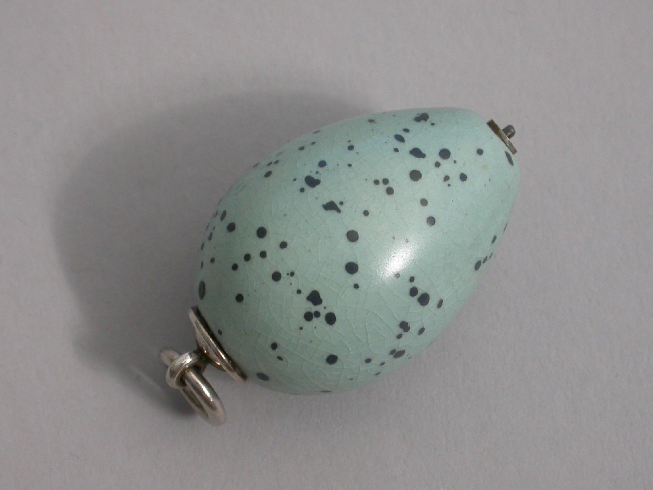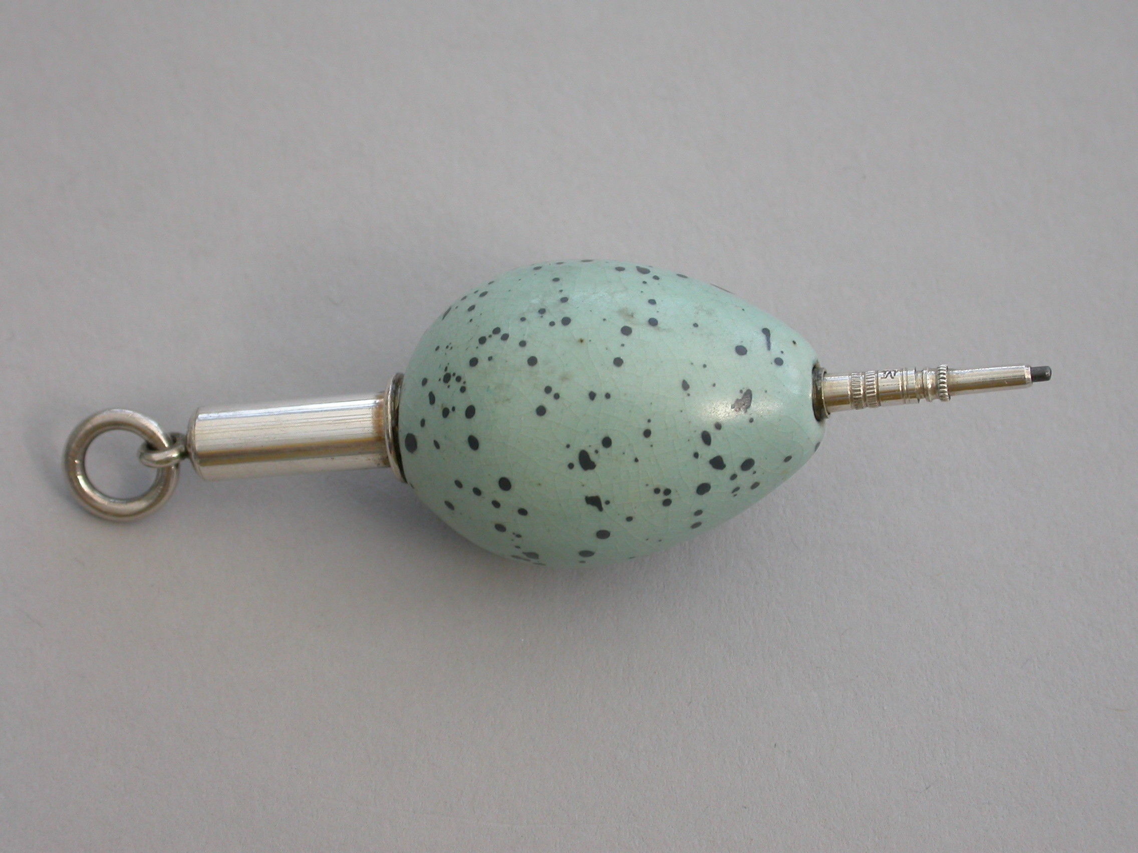 A rare Victorian novelty silver and ceramic Propelling Pencil, the body formed as a Song Thrush's egg, with attached suspension ring.