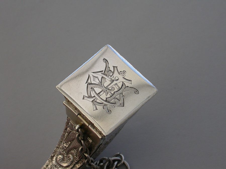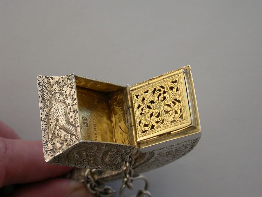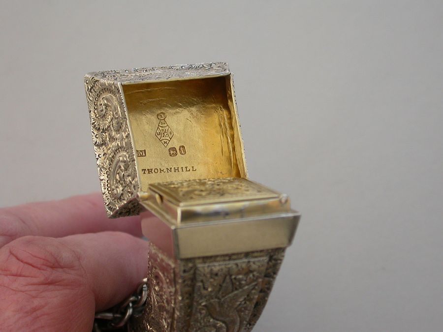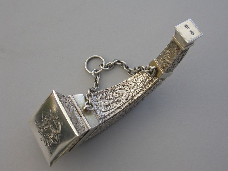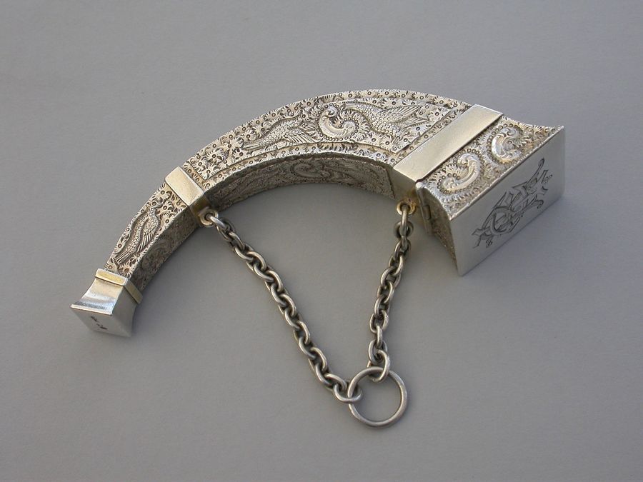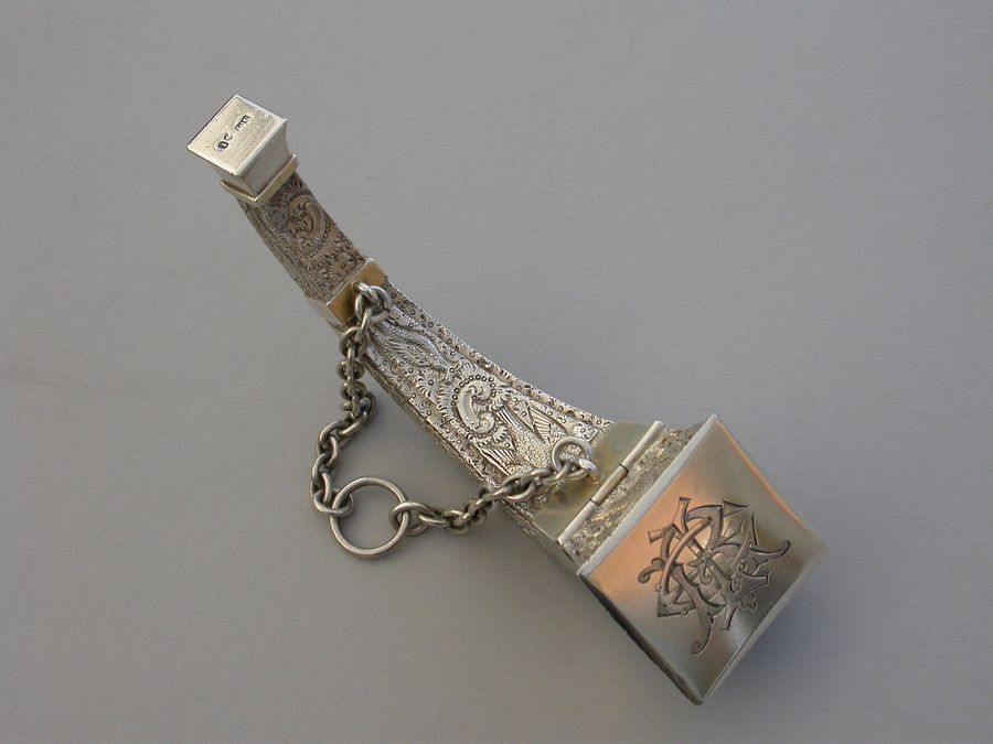 A fine Victorian novelty silver combined Scent Bottle and Vinaigrette, made in the form of a horn and of unusual square section. The main cover engraved with a contemporary monogram and opening to reveal a silver gilt interior and pierced Vinaigrette grille. The screw off cap at the other end sealing the Scent Bottle. The body profusely chased with exotic birds scrolls and foliage. Attached suspension ring and chains.