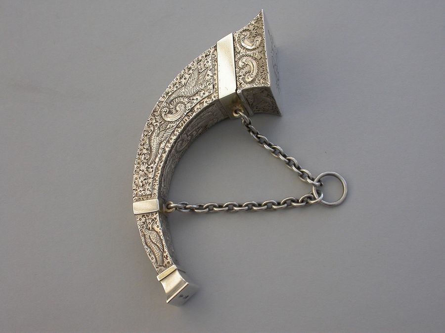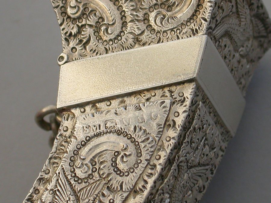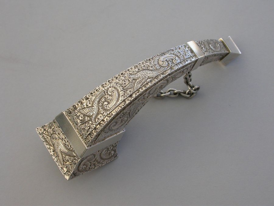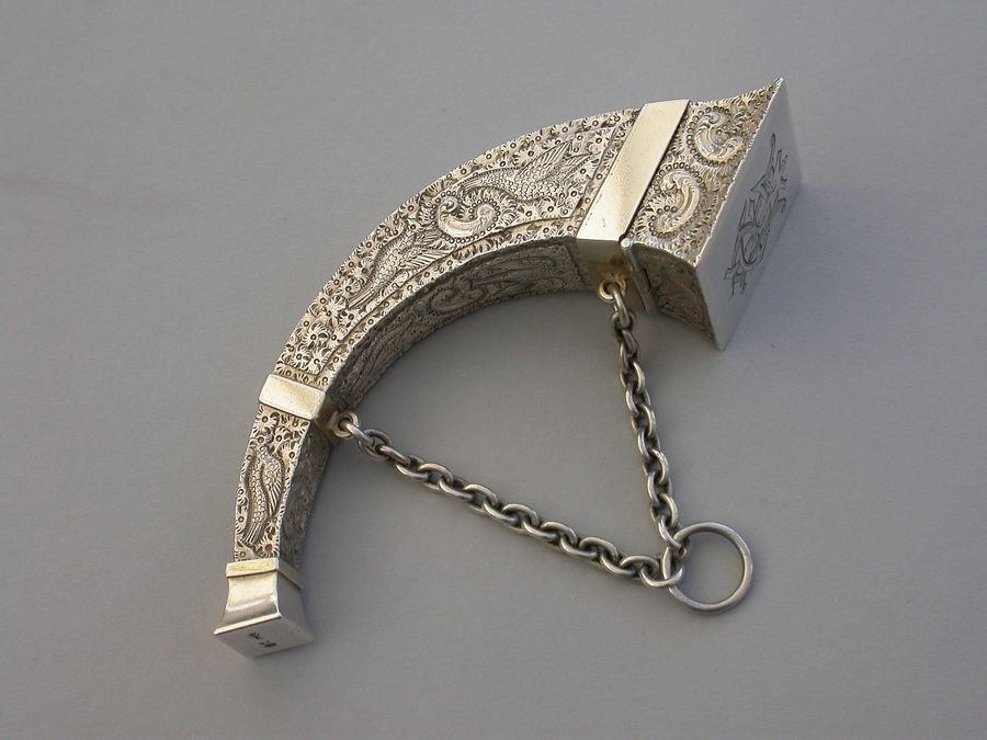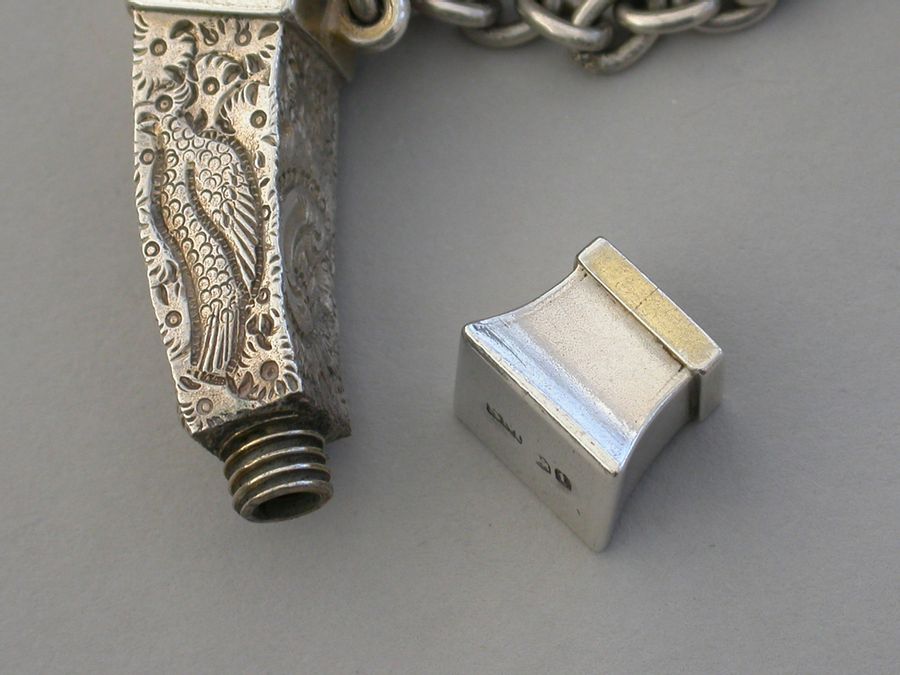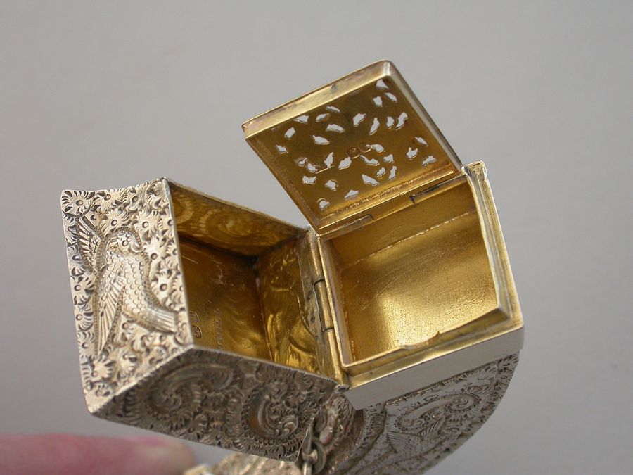 A fine Victorian novelty silver combined Scent Bottle and Vinaigrette, made in the form of a horn and of unusual square section. The main cover engraved with a contemporary monogram and opening to reveal a silver gilt interior and pierced Vinaigrette grille. The screw off cap at the other end sealing the Scent Bottle. The body profusely chased with exotic birds scrolls and foliage. Attached suspension ring and chains.