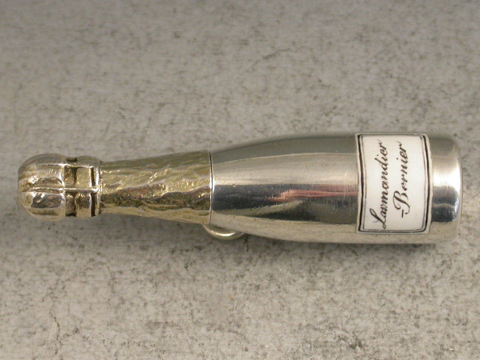 A rare Victorian novelty silver telescopic Propelling Pencil modelled in the form of a Larmandier Bernier Champagne Bottle, complete with black and white enamel label. Larmandier Bernier is one of the top Terroirs in Champagne and is an unusual label to see on a Novelty Champagne Bottle Pencil.