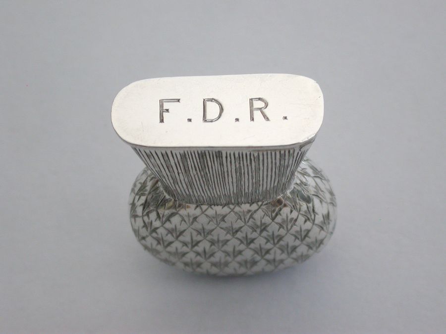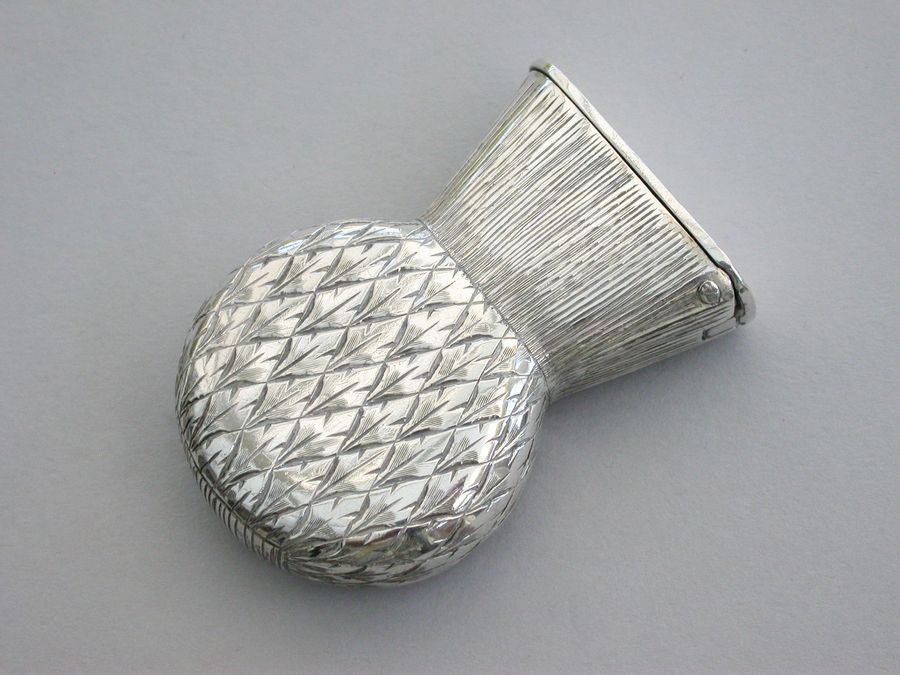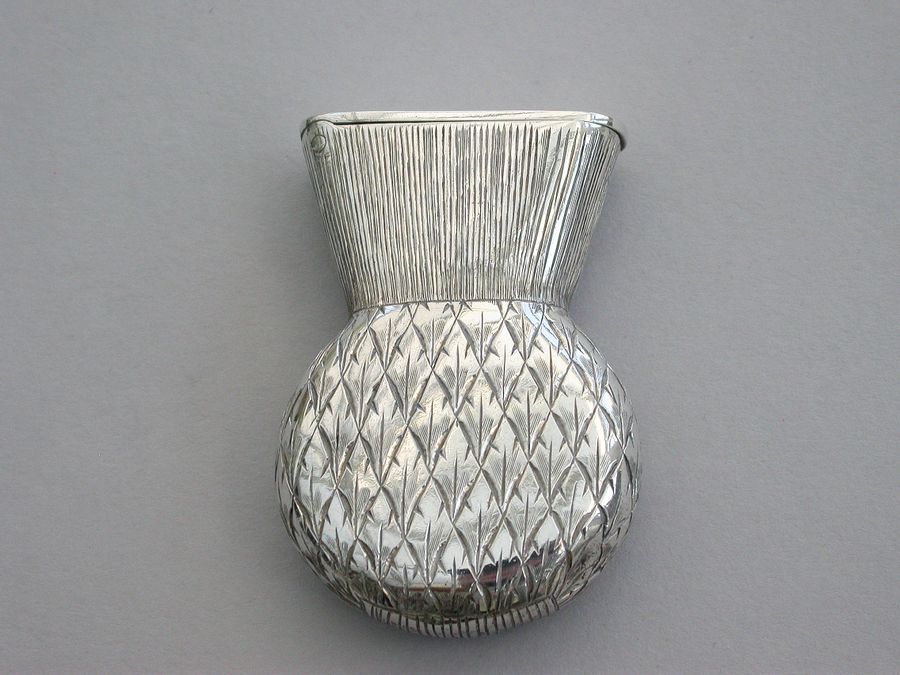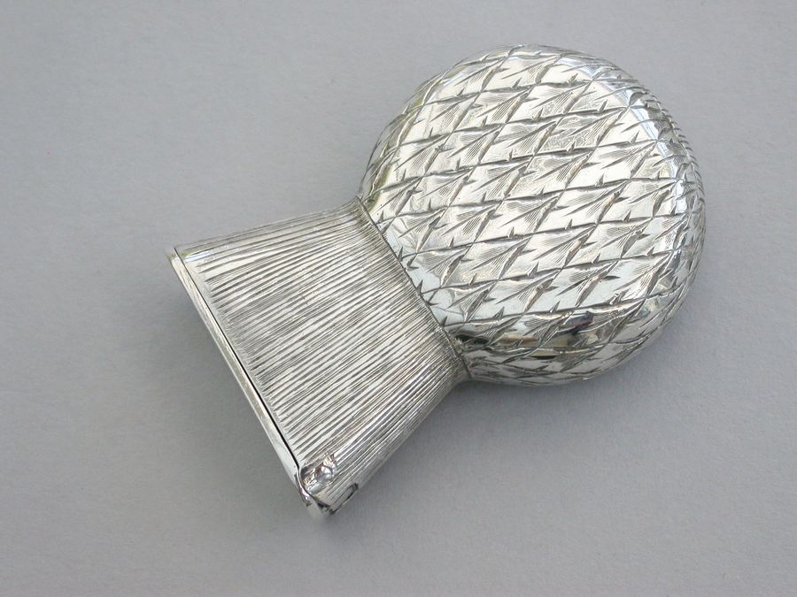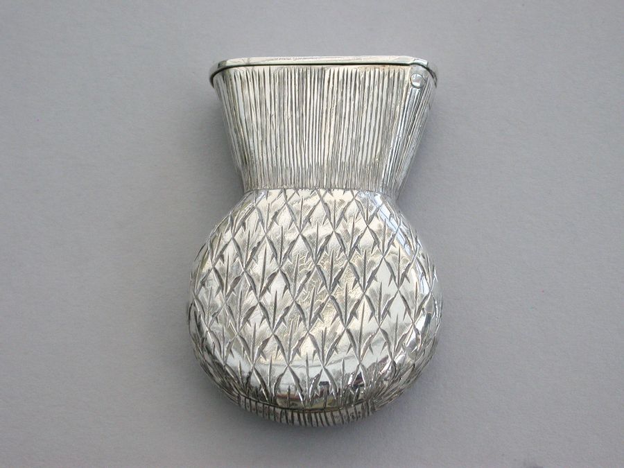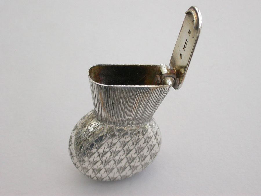A good quality Victorian novelty Scottish silver Vesta Case made in the form of a thistle, with realistically engraved decoration, the sprung flat hinged lid engraved with the owners initials 'FDR'. Silver gilt interior.