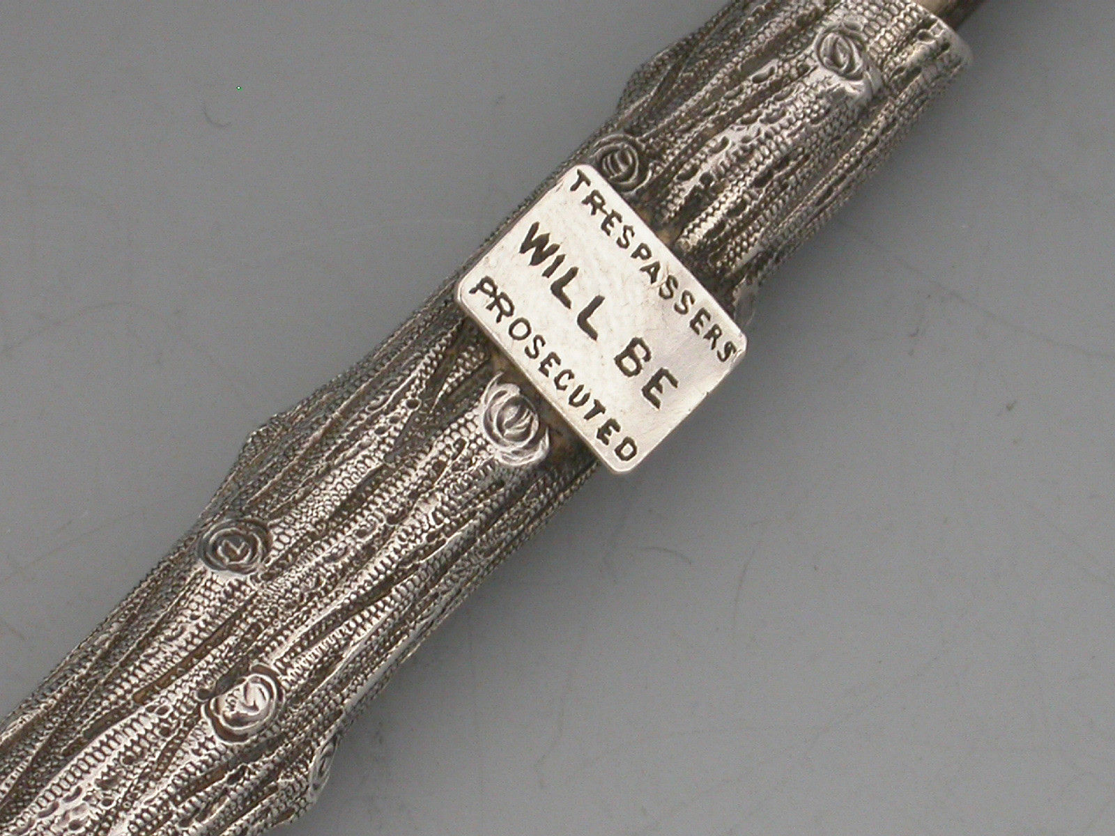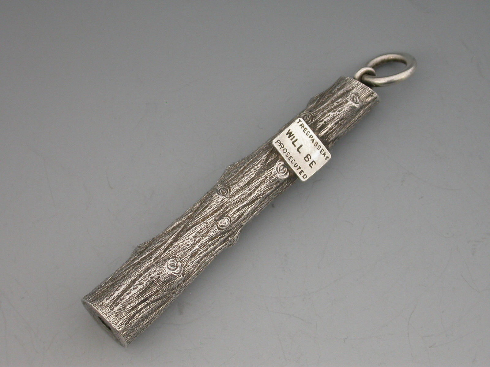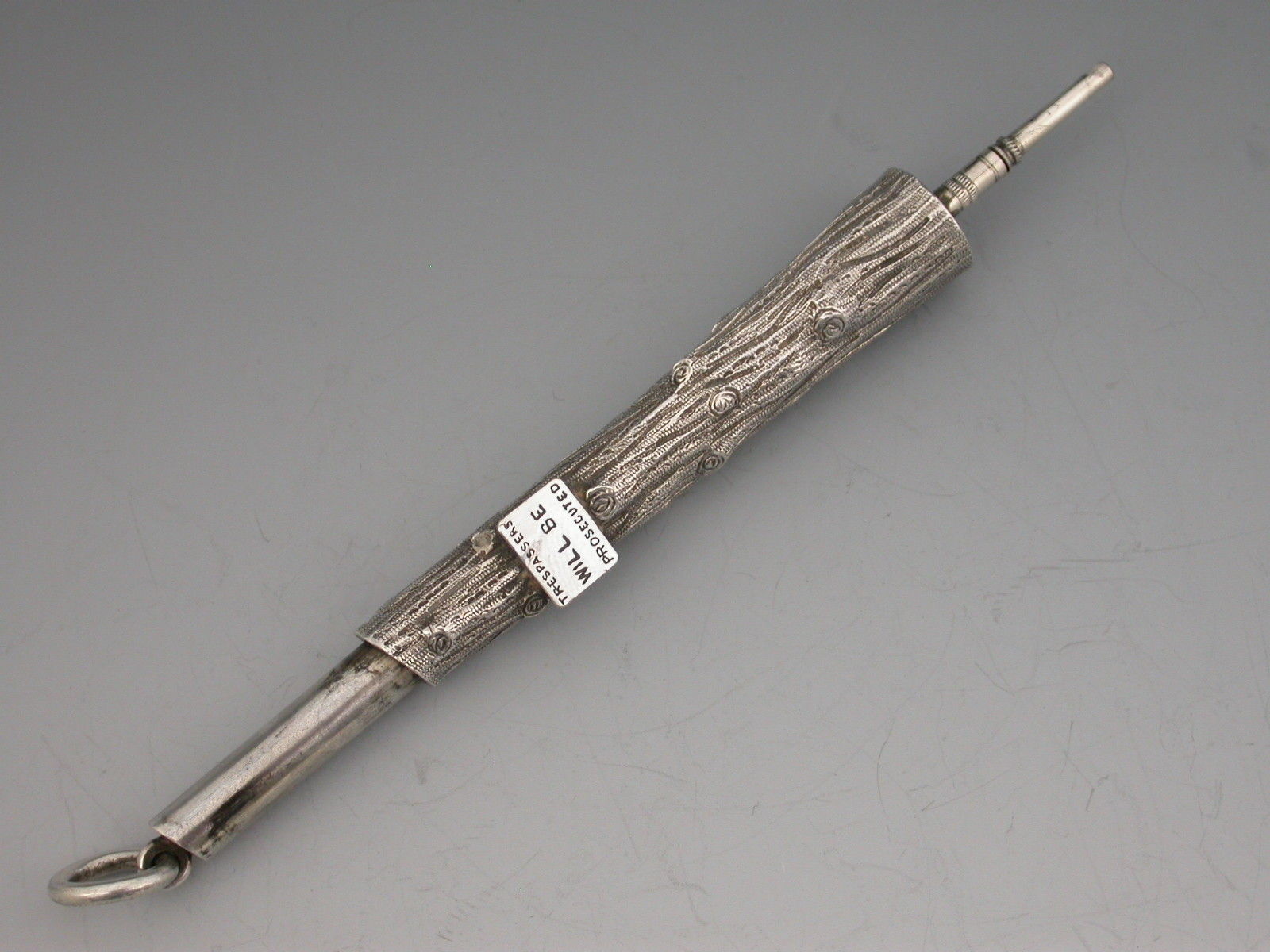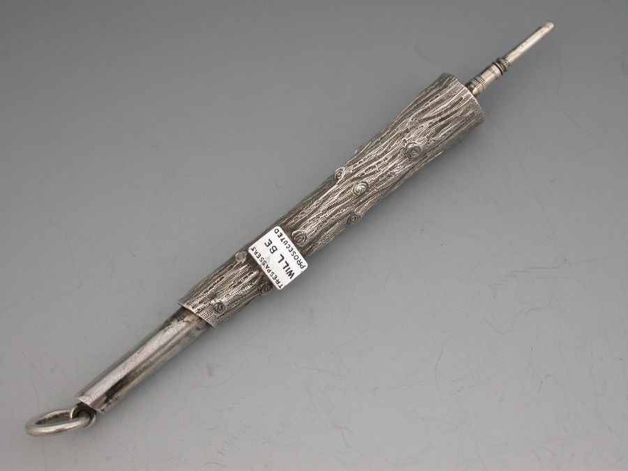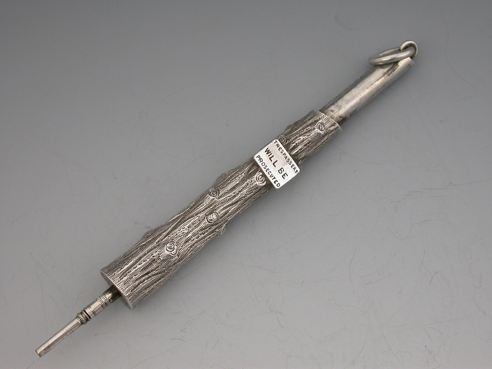 An extremely rare novelty silver telescopic Propelling Pencil, the barrel cast as a knarled tree stump with attached enamelled sign proclaiming - ""Trespassers will be Prosecuted"".