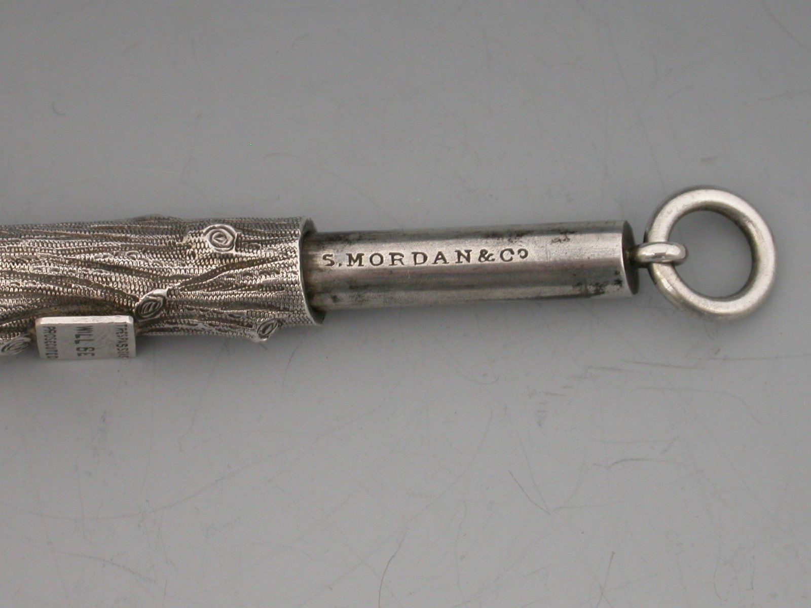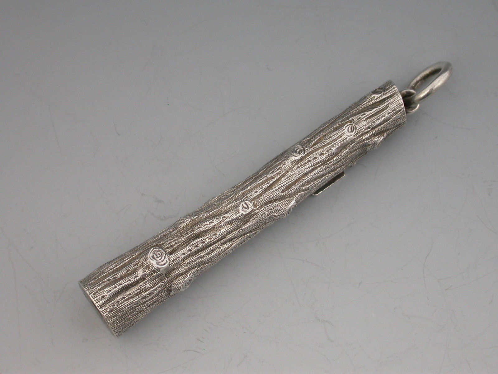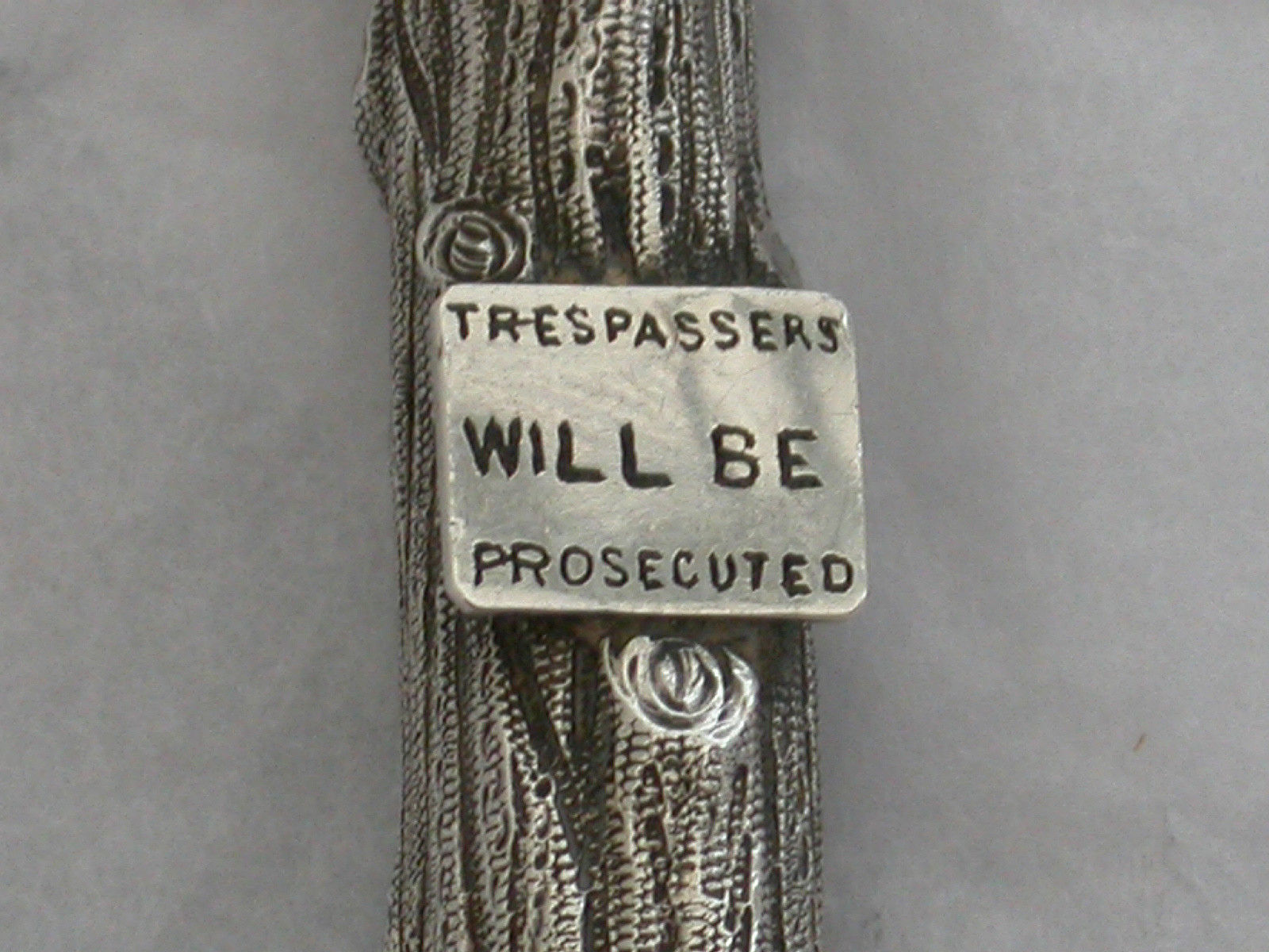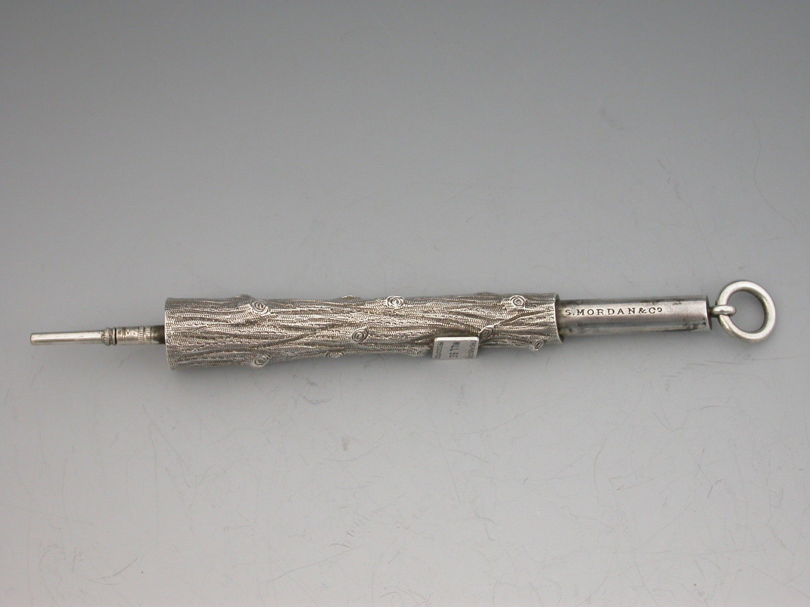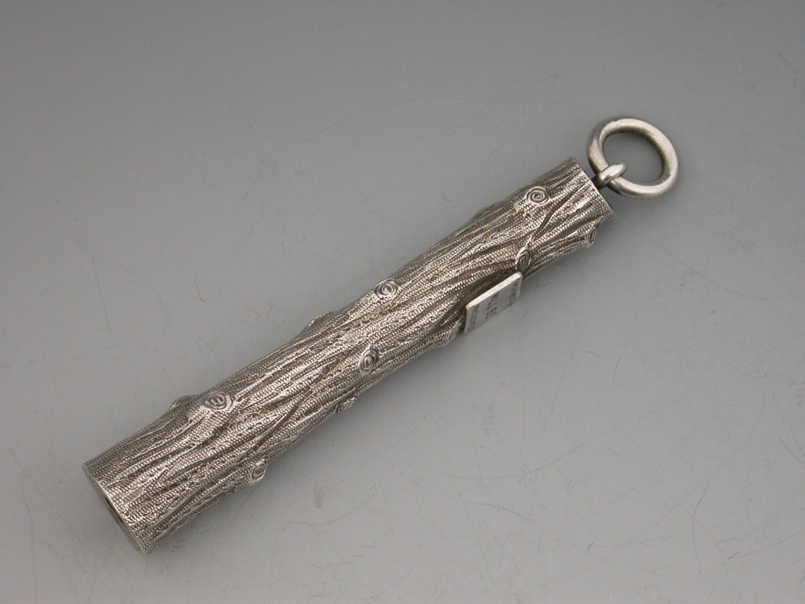 An extremely rare novelty silver telescopic Propelling Pencil, the barrel cast as a knarled tree stump with attached enamelled sign proclaiming - ""Trespassers will be Prosecuted"".