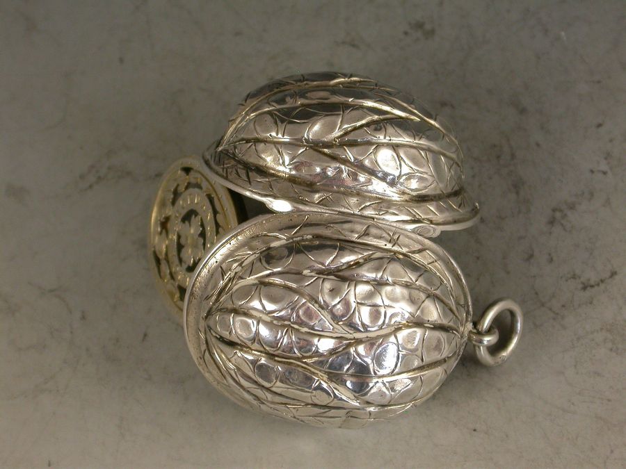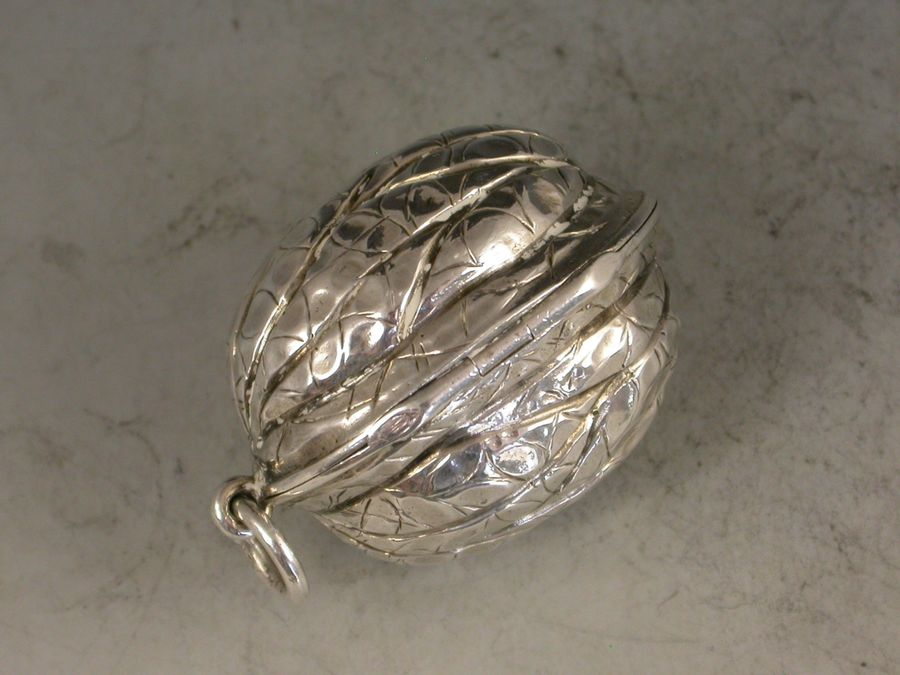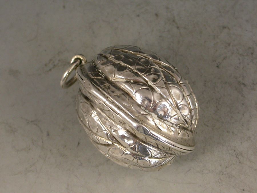 A rare Victorian novelty silver Vinaigrette made in the form of a Walnut, with attached suspension ring. The exterior naturalistically textured, hinged at the centre and opening to reveal a silver gilt interior with intricately pierced grille stamped with the makers name.